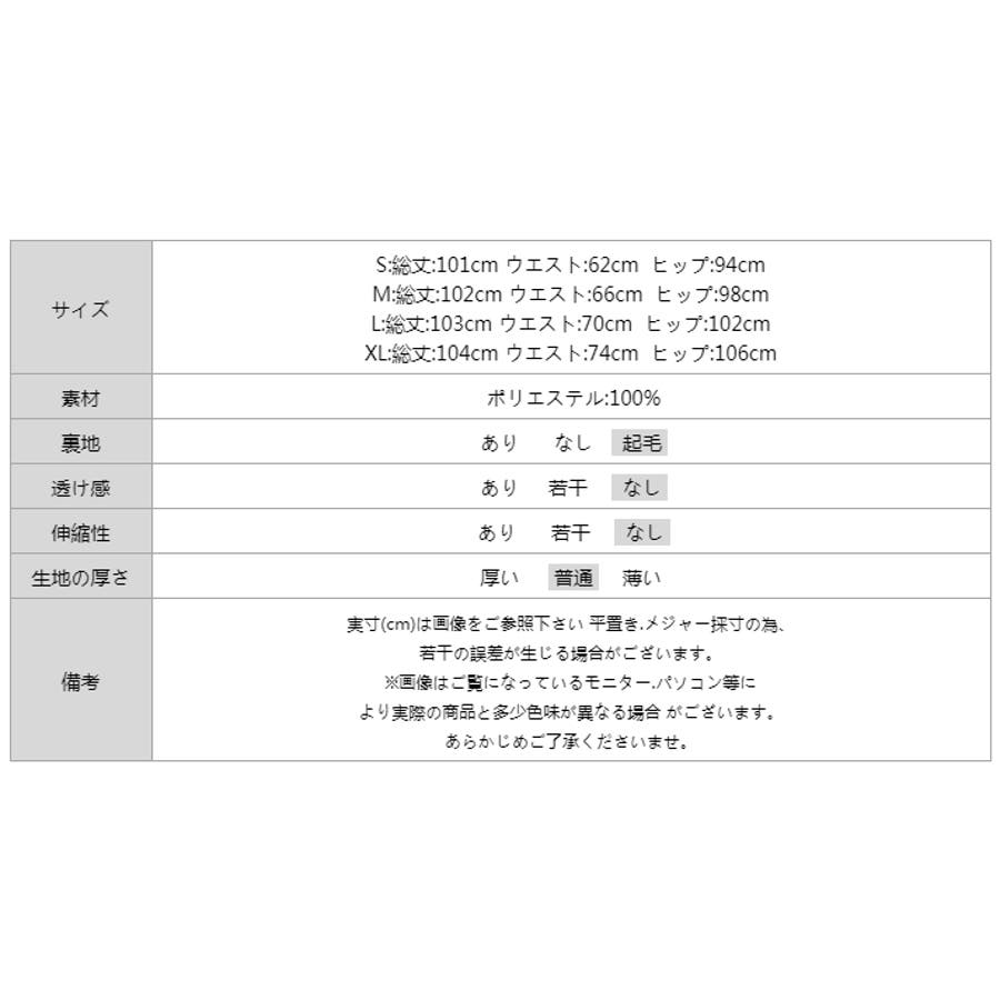 | サイズ | S: 総丈 101cm ウエスト 62cm ヒップ 94cm M: 総丈 102cm ウエスト 66cm ヒップ 98cm L: 総丈 103cm ウエスト 70cm ヒップ 102cm XL: 総丈 104cm ウエスト 74cm ヒップ 106cm |