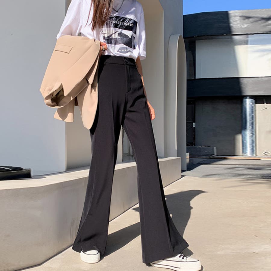 【ブラック】フレアパンツ スラックスパンツ サイドスリットパンツ