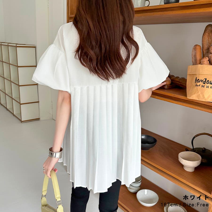 【ホワイト】パフスリーブブラウス チュニック プリーツブラウス