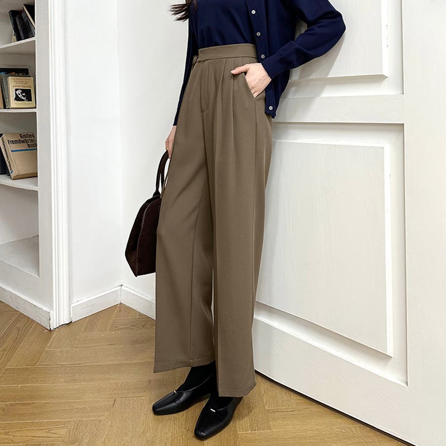 【ブラウン】スラックスパンツ センタープレスワイドパンツ ストレートパンツ