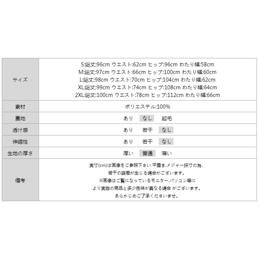 | サイズ | S: 総丈 96cm ウエスト 62cm ヒップ 96cm わたり幅 58cm M: 総丈 97cm ウエスト 66cm ヒップ 100cm わたり幅 60cm L: 総丈 98cm ウエスト 70cm ヒップ 104cm わたり幅 62cm XL: 総丈 99cm ウエスト 74cm ヒップ 108cm わたり幅 64cm 2XL: 総丈 100cm ウエスト 78cm ヒップ 112cm わたり幅 66cm |