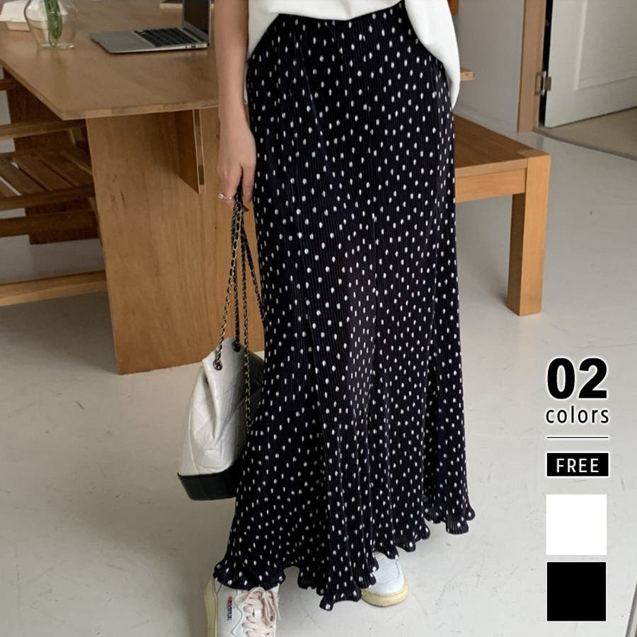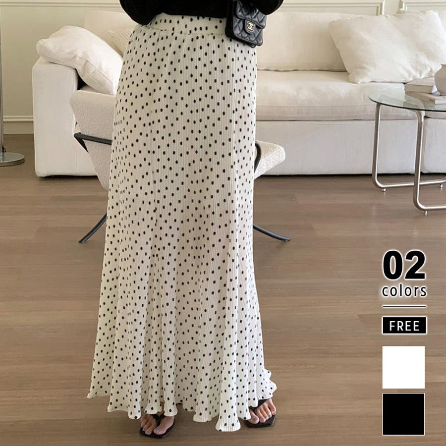 【ホワイト】ドットプリーツスカート ロングスカート プリーツスカート