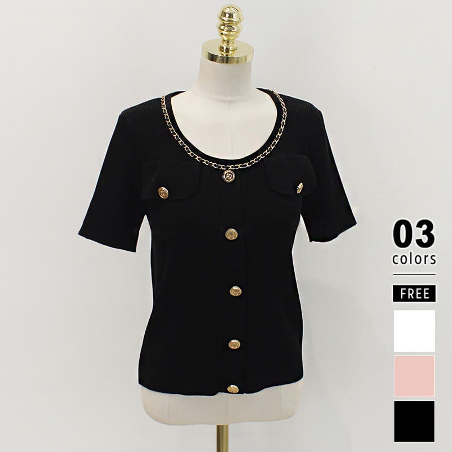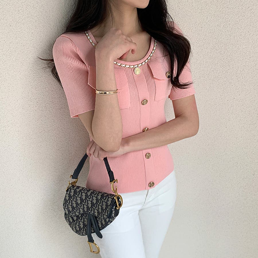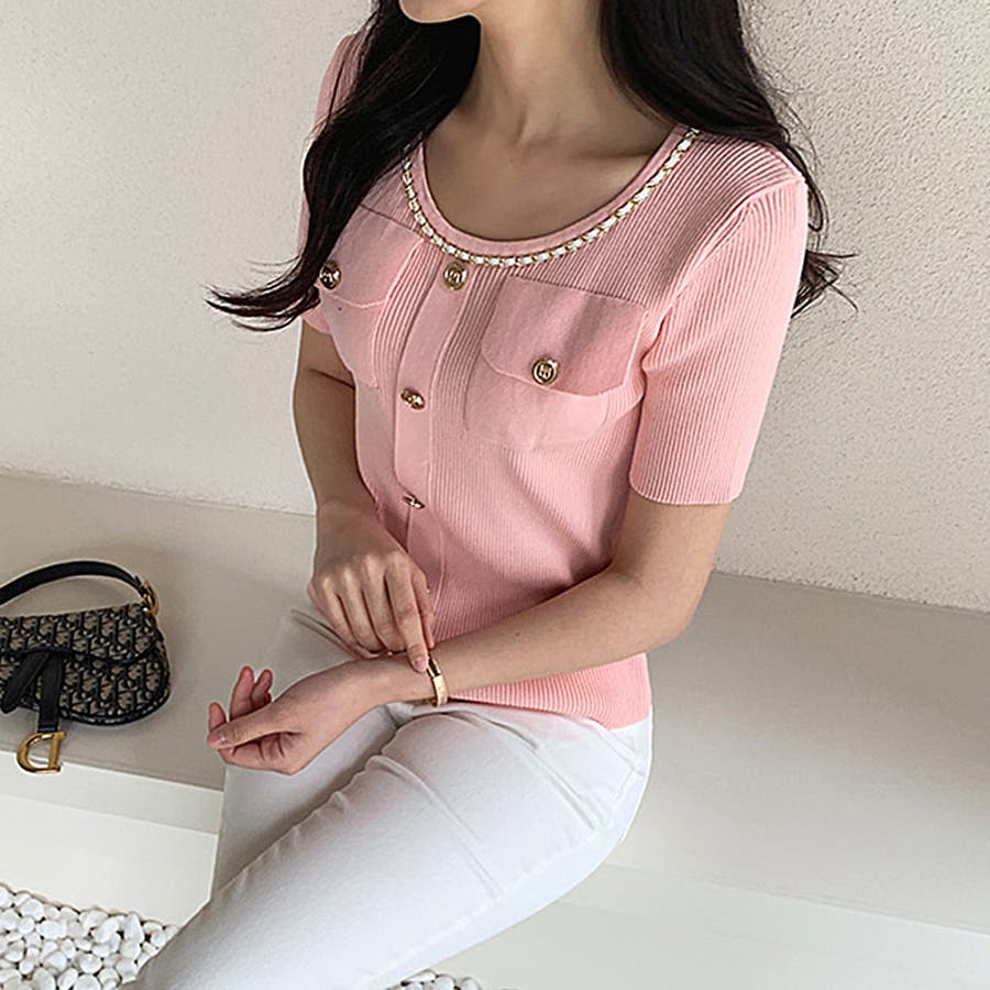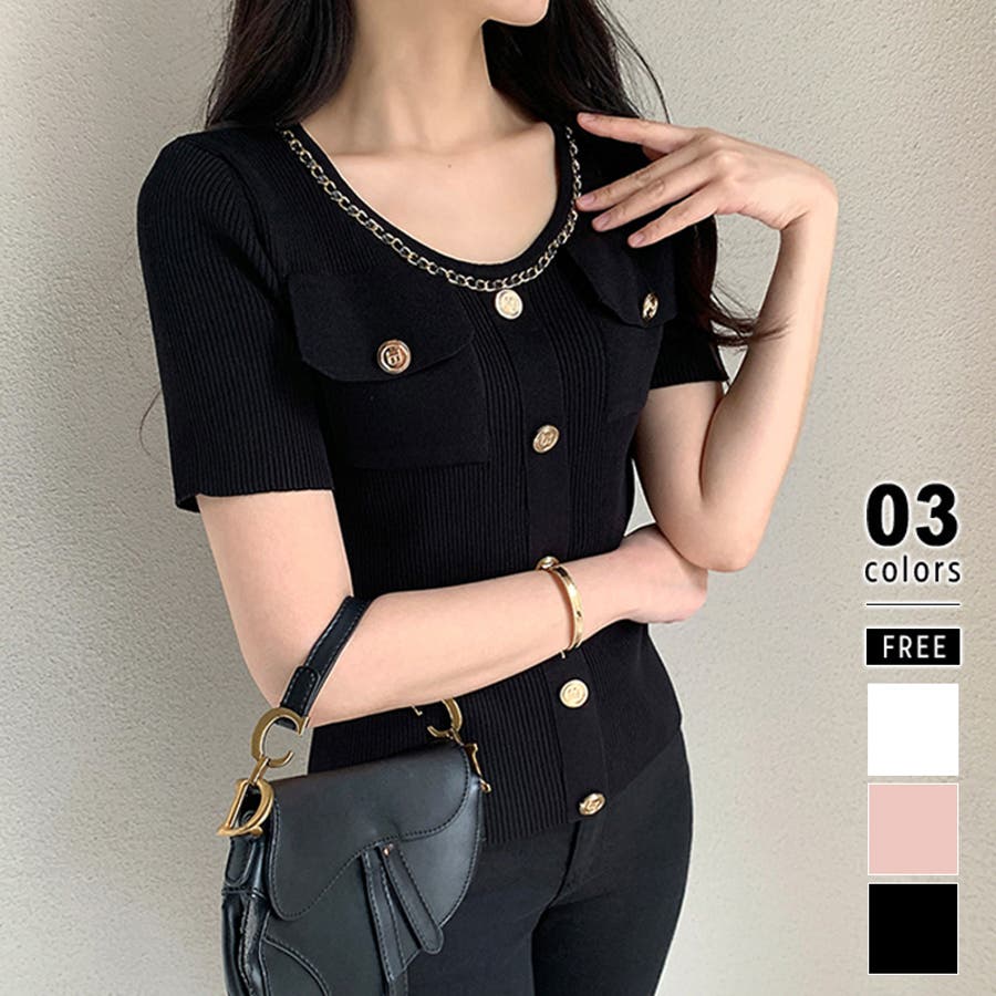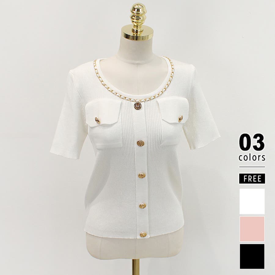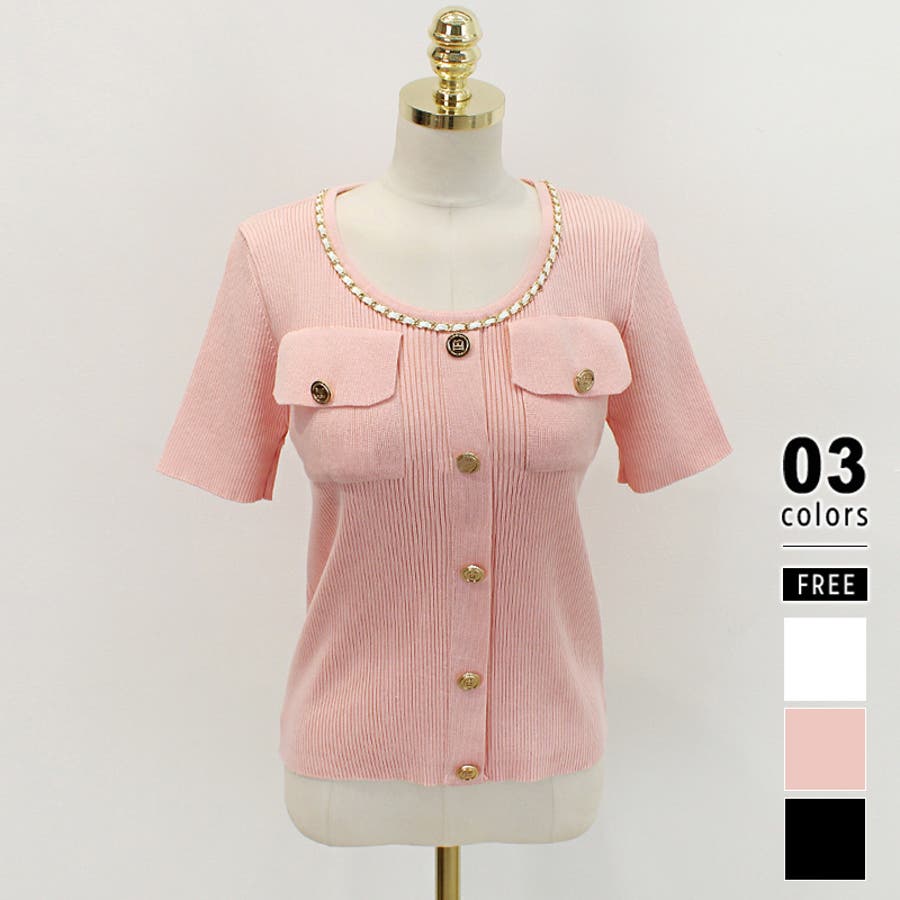 サマーニット 金ボタン 半袖 リブニット ニット トップス レディース リブ サマー ラウンドネック 半袖きれいめ 半袖ニット ゴールドボタン 金 ゴールド チェーン 首 襟なし ノーカラー tops プルオーバー レディース夏 伸縮性 ストレッチ フィット タイト 着痩せ 着やせ ポケット ポケット付き さらさら アクリル オフィス オフィスカジュアル オフィスカジュアル春夏 ol 韓国風 カジュアル フェミニン セクシー エレガント 高級感 ゴージャス セレブ 華やか 大人 かわいい 可愛い 大人かわいい 大人可愛い 大人女子 上品 きれい め キレイめ 綺麗 おしゃれ オシャレ ママ ママコーデ 母 女性 プチプラ 高見え トレンド ヒット 商品 おすすめ 服 ファッション コーデ フリーサイズ ホワイト 白 ピンク ブラック 黒 カラー レディース夏 新作 春夏 春 夏 春服 夏服 春物 夏物 韓国 韓国ファッション 10代 20代 30代 40代 50代 cocomomo ココモモ