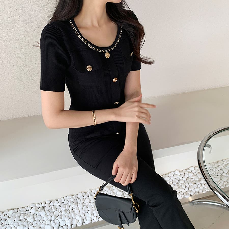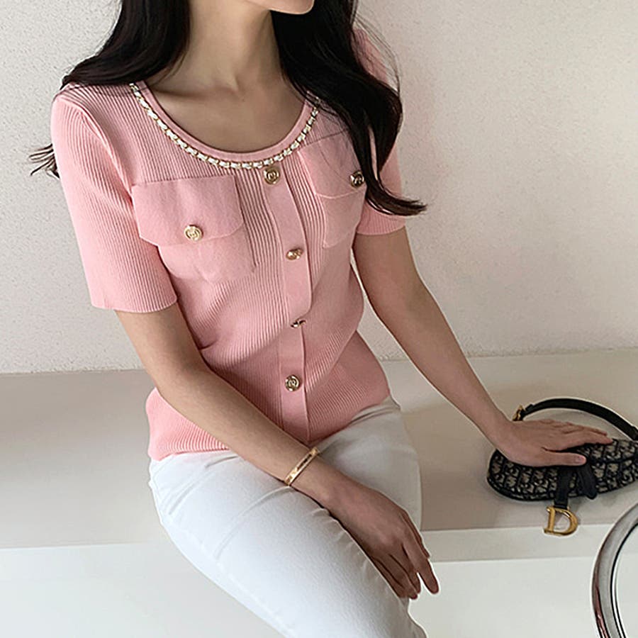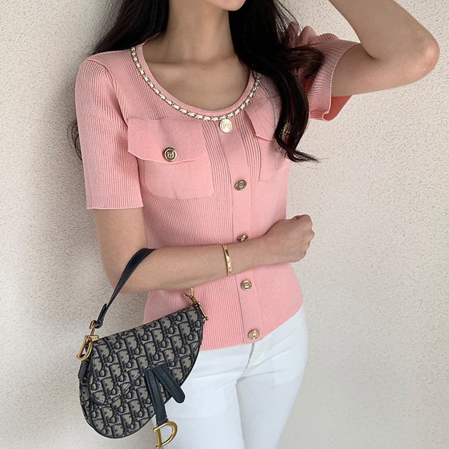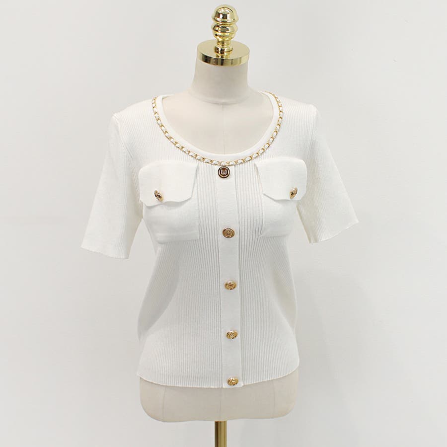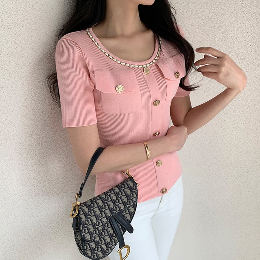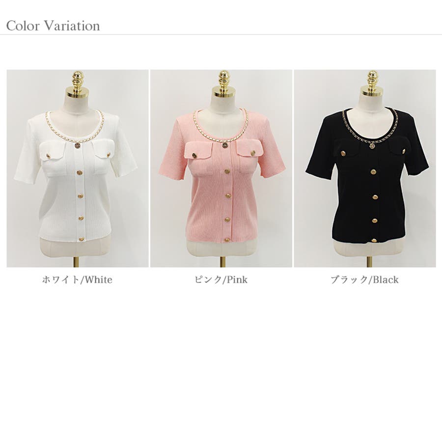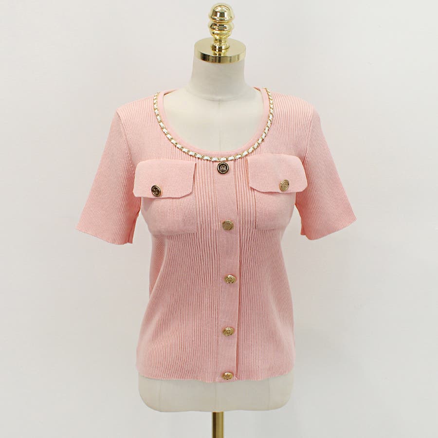 サマーニット 金ボタン 半袖 リブニット ニット トップス レディース リブ サマー ラウンドネック 半袖きれいめ 半袖ニット ゴールドボタン 金 ゴールド チェーン 首 襟なし ノーカラー tops プルオーバー レディース夏 伸縮性 ストレッチ フィット タイト 着痩せ 着やせ ポケット ポケット付き さらさら アクリル オフィス オフィスカジュアル オフィスカジュアル春夏 ol 韓国風 カジュアル フェミニン セクシー エレガント 高級感 ゴージャス セレブ 華やか 大人 かわいい 可愛い 大人かわいい 大人可愛い 大人女子 上品 きれい め キレイめ 綺麗 おしゃれ オシャレ ママ ママコーデ 母 女性 プチプラ 高見え トレンド ヒット 商品 おすすめ 服 ファッション コーデ フリーサイズ ホワイト 白 ピンク ブラック 黒 カラー レディース夏 新作 春夏 春 夏 春服 夏服 春物 夏物 韓国 韓国ファッション 10代 20代 30代 40代 50代 cocomomo ココモモ
