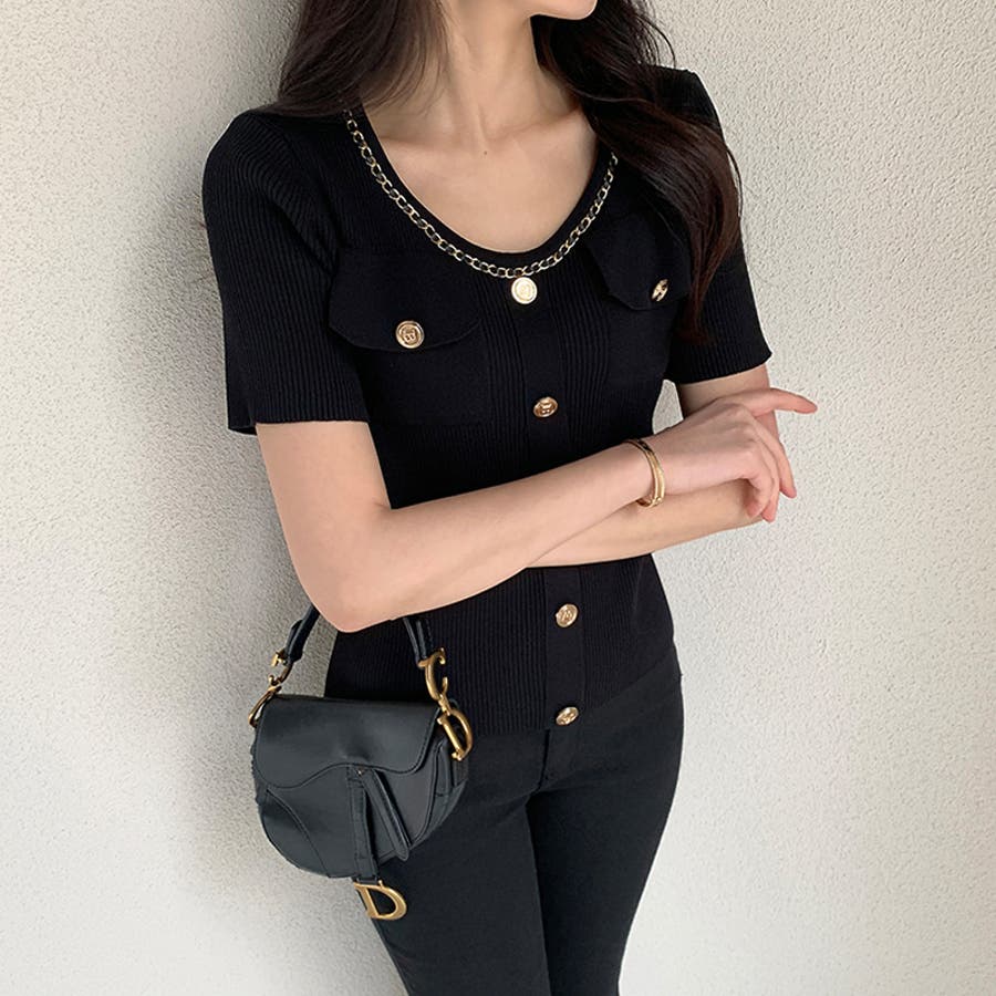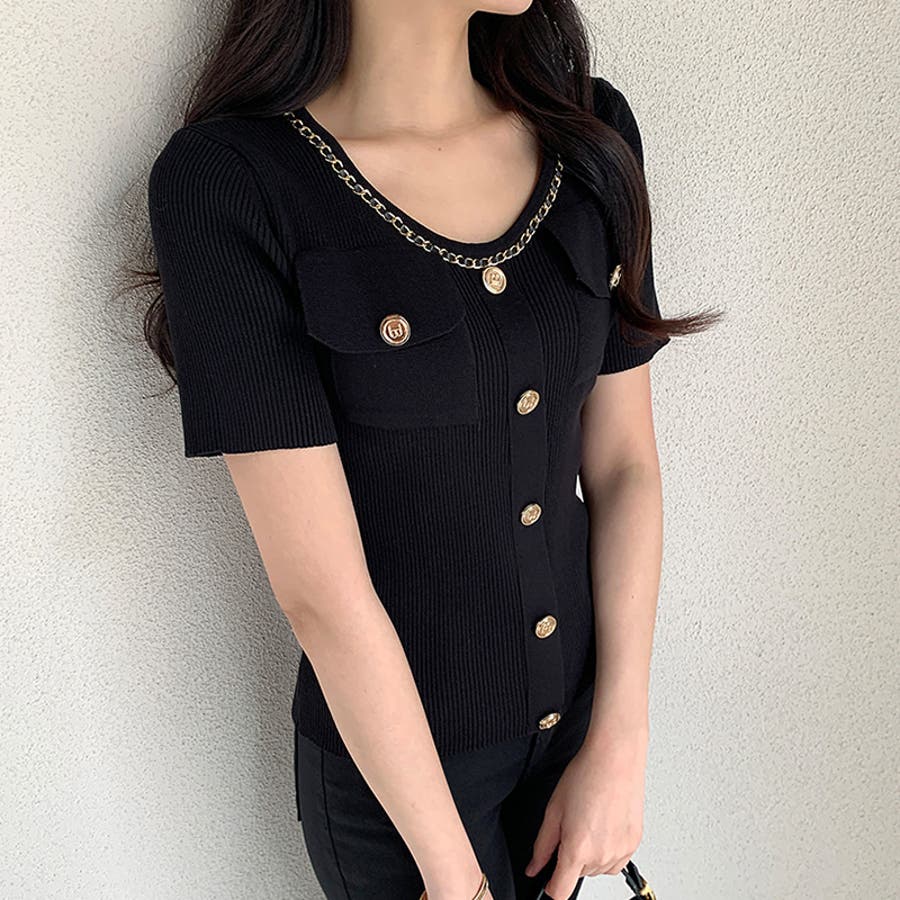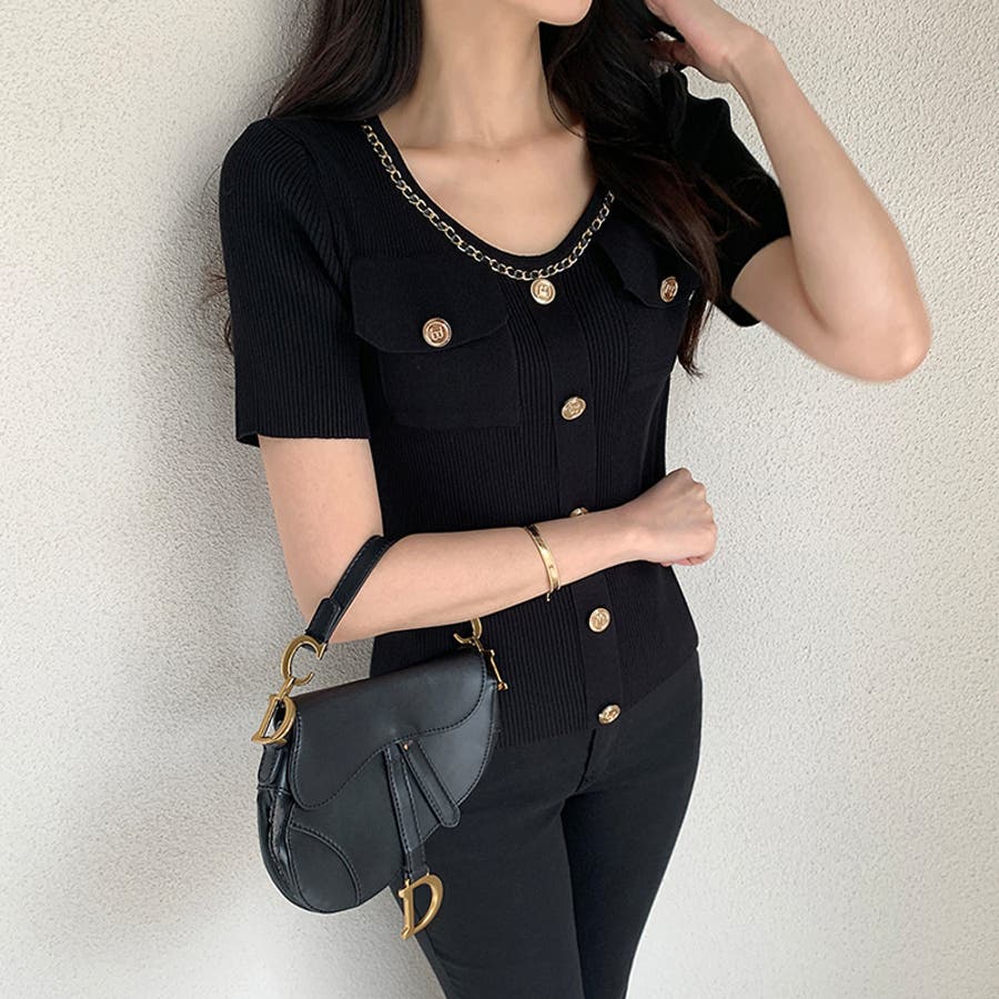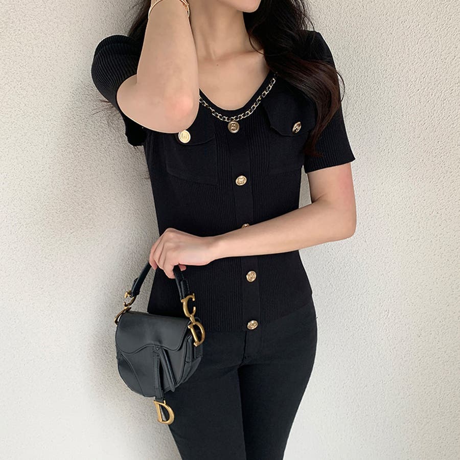 サマーニット 金ボタン半袖ニット 韓国ファッション