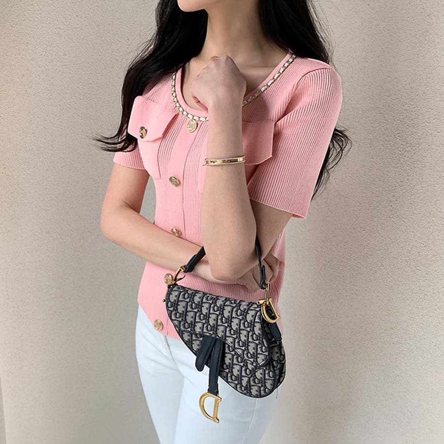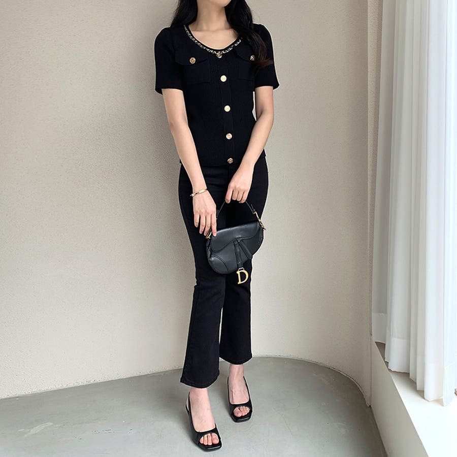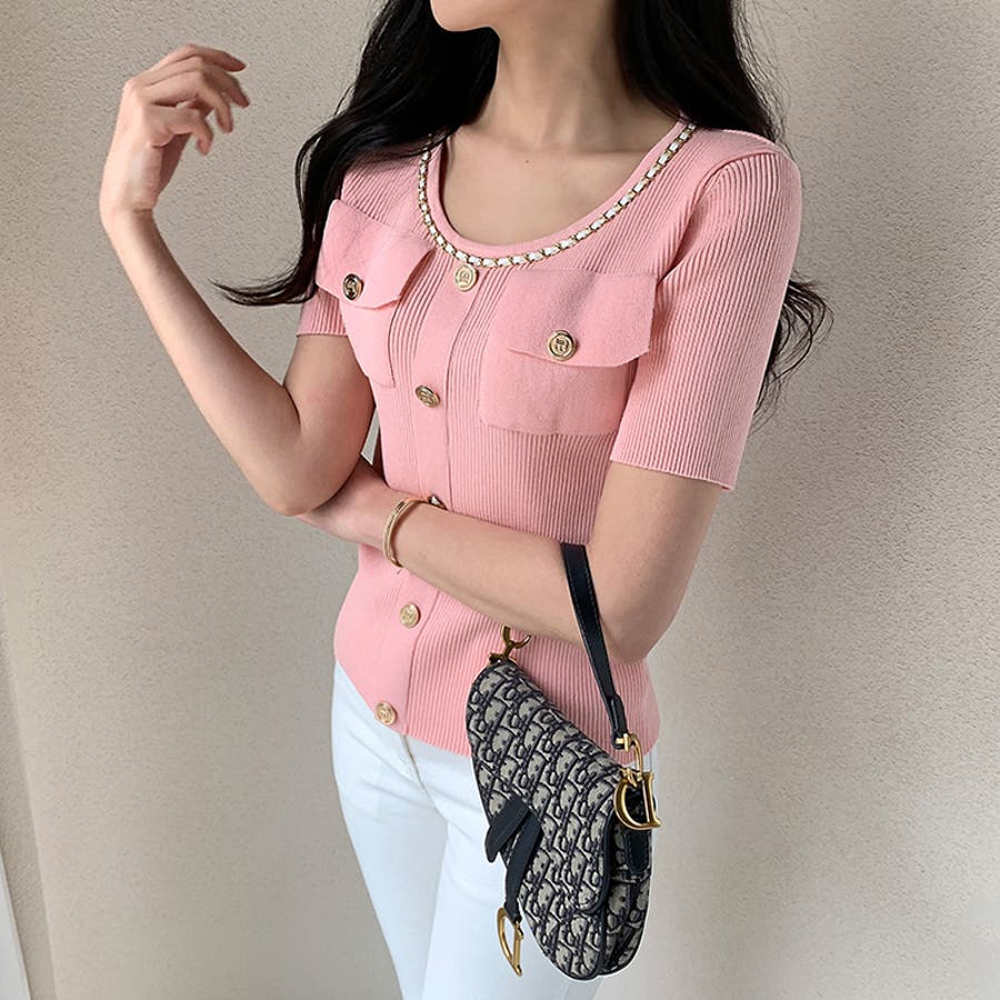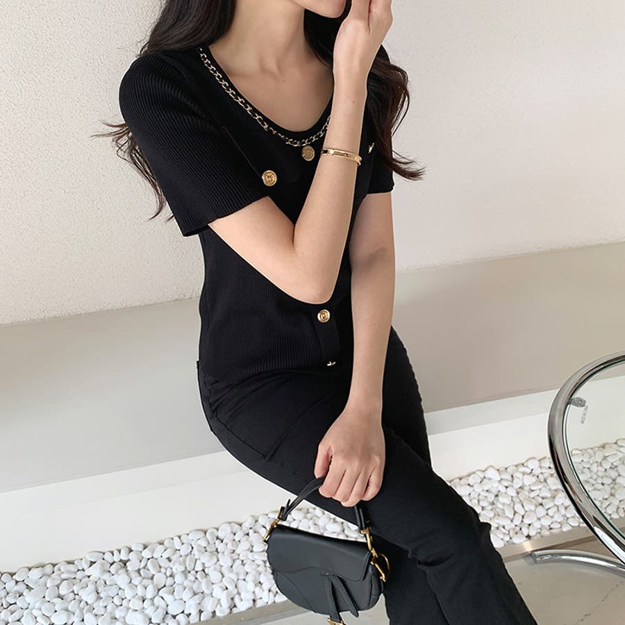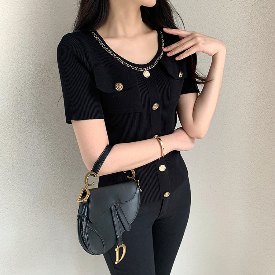 サマーニット 金ボタン半袖ニット 韓国ファッション