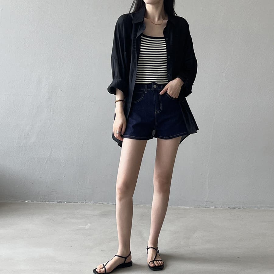 かなりオーバーサイズでボタン上2つ外して前だけインするといい感じで襟が抜けてオシャレに着こなせます。透け感も程よくイヤな感じはないので使いやすいです。長袖ですが素材がサラサラしてるので真夏でも暑苦しいこともなくサラッと羽織りでも使えそう。