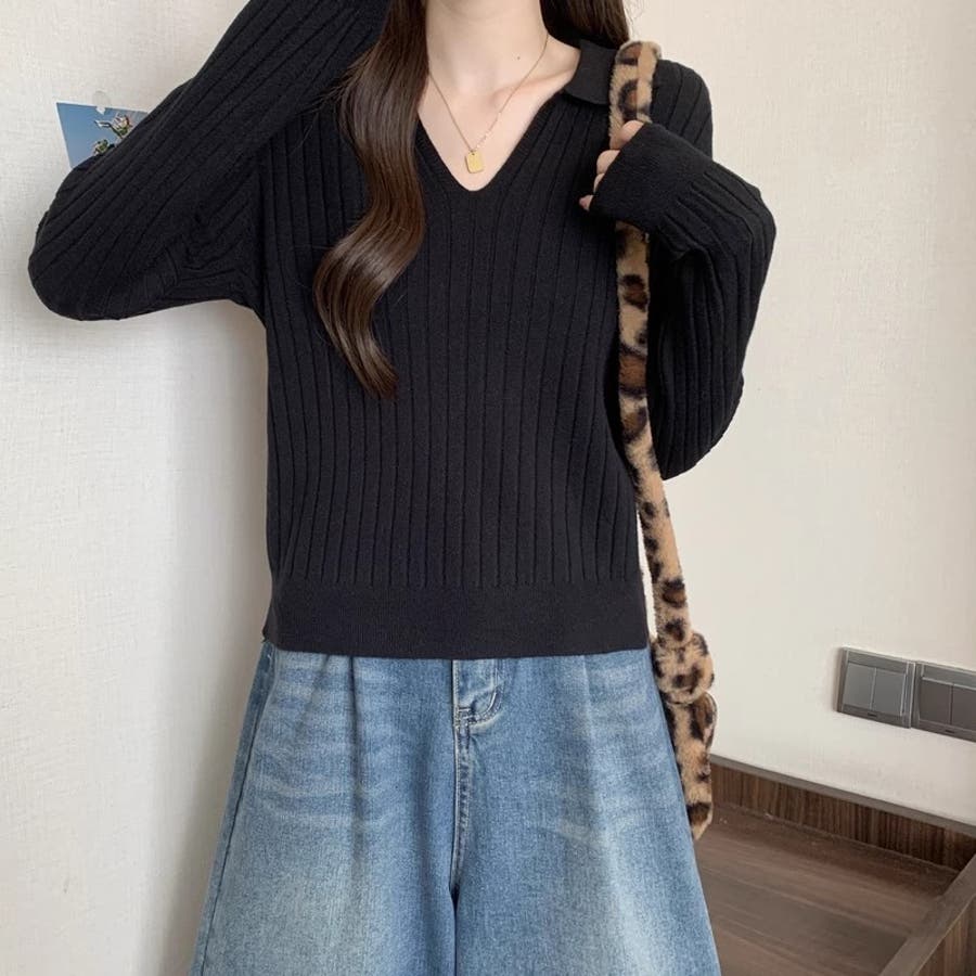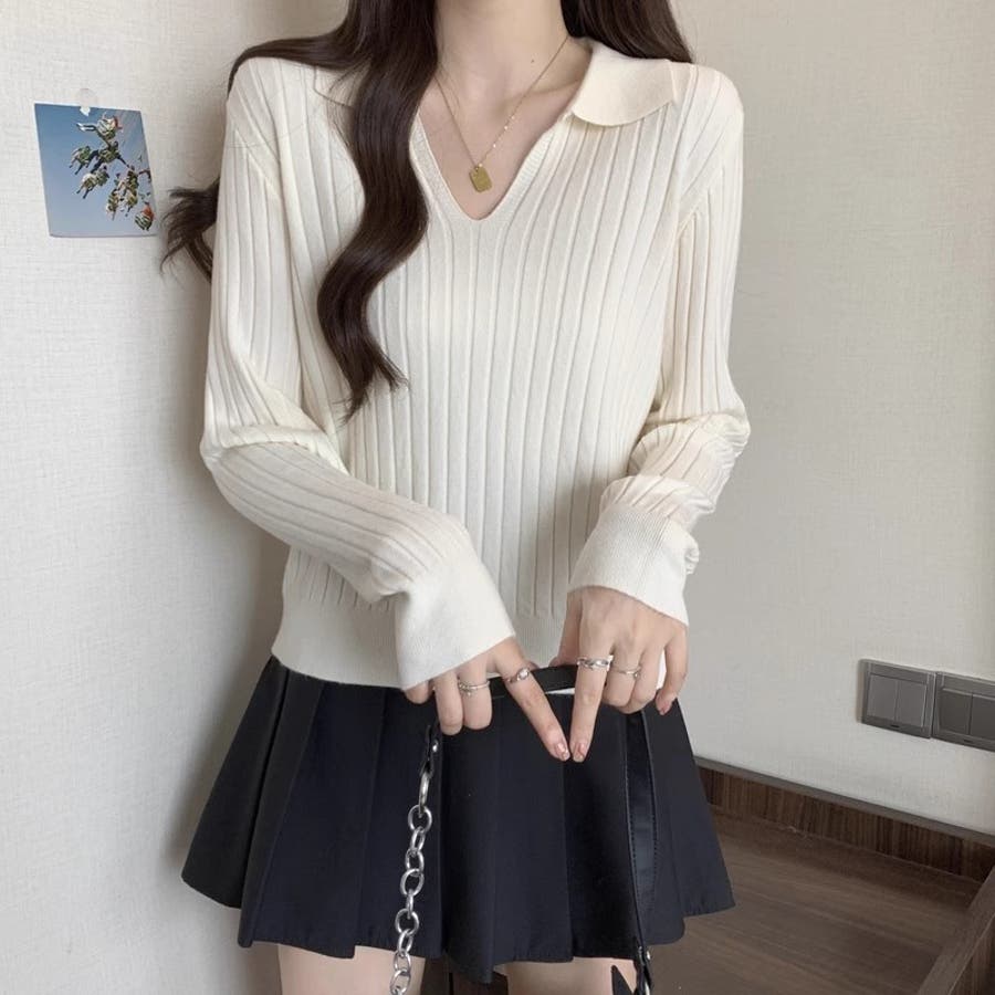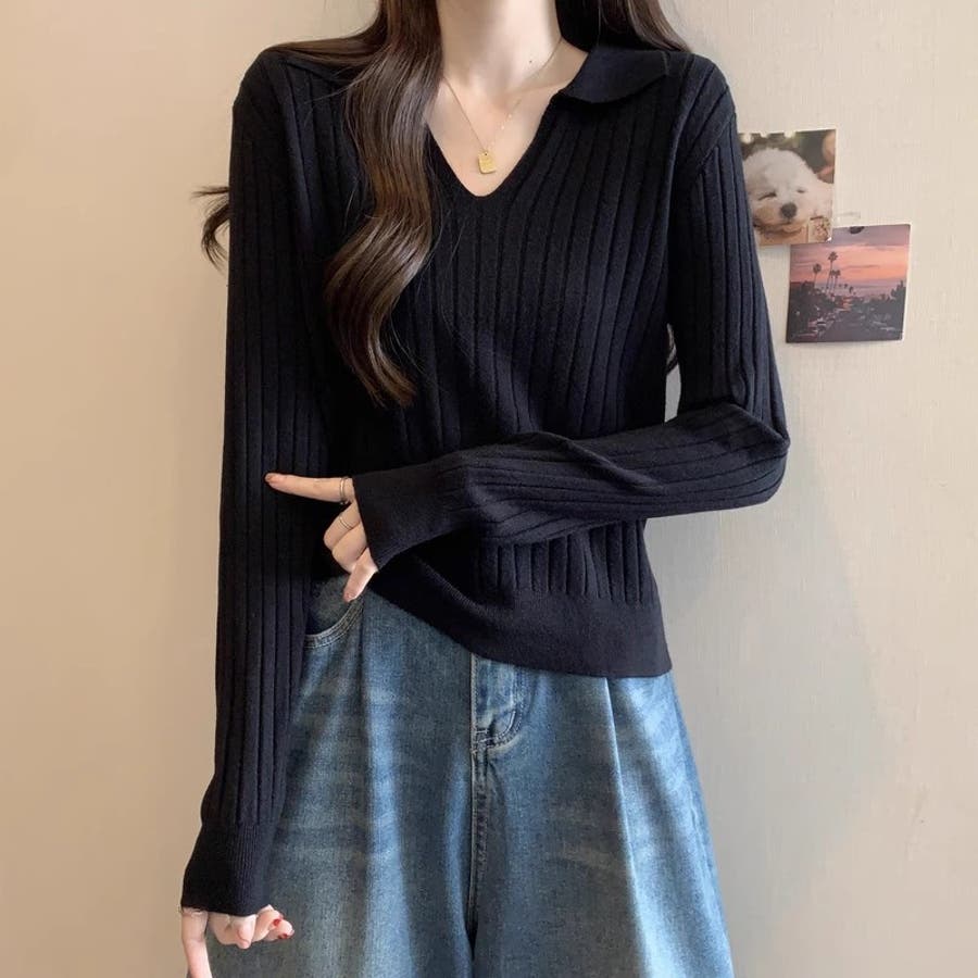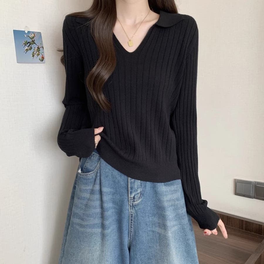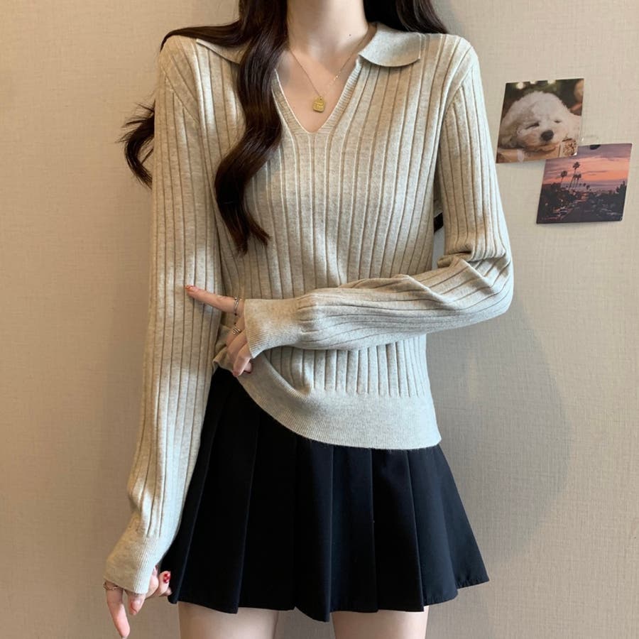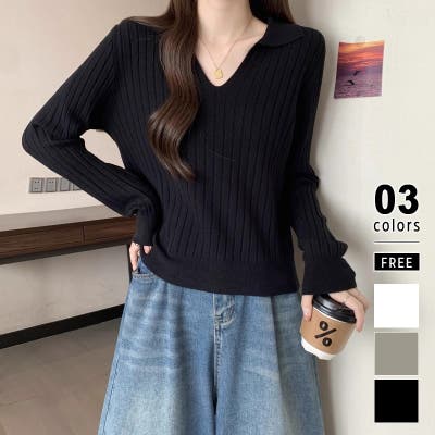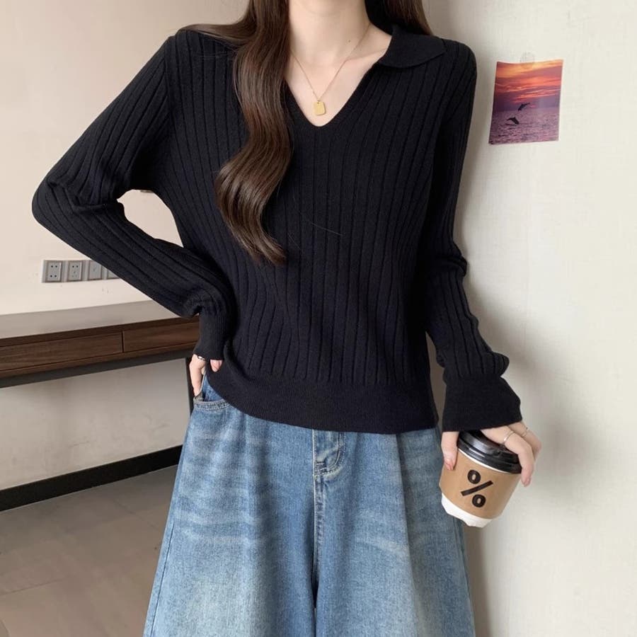 スキッパーニットトップス リブニット 韓国ファッション