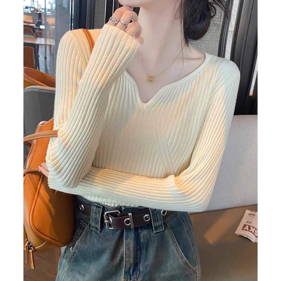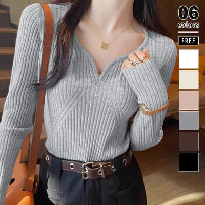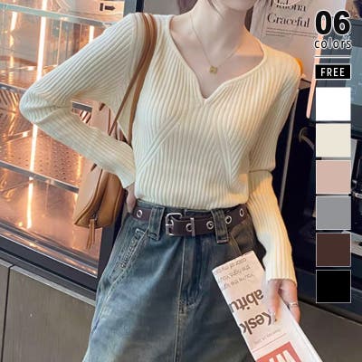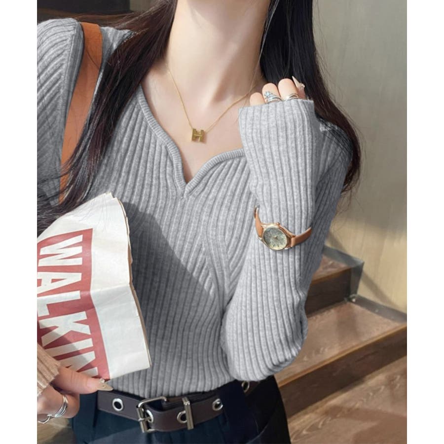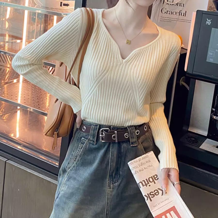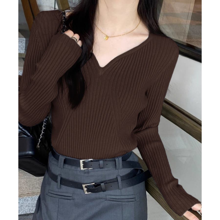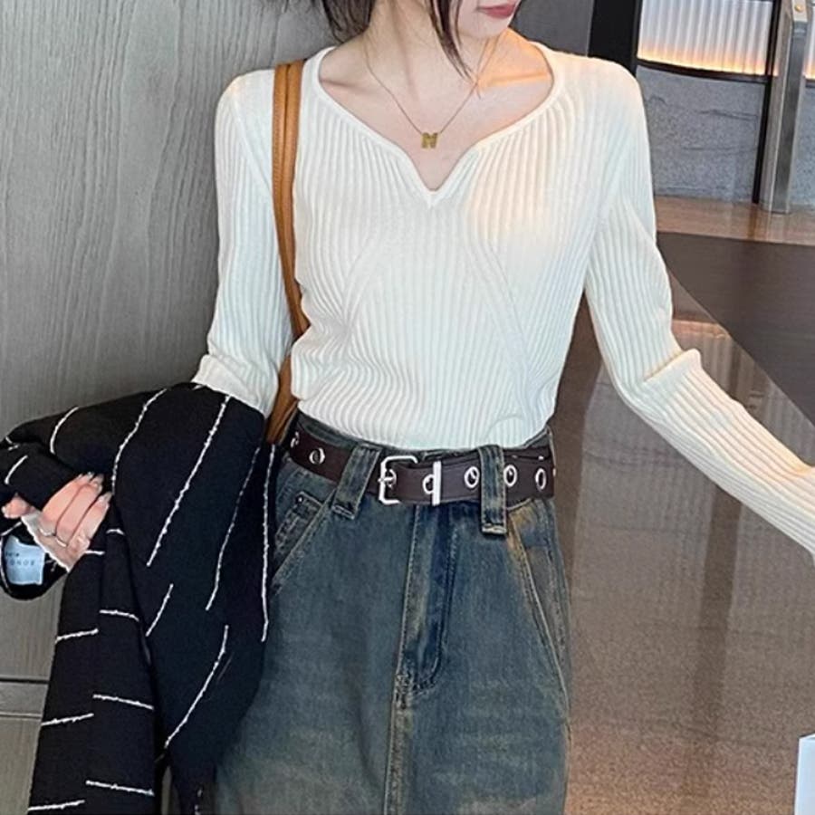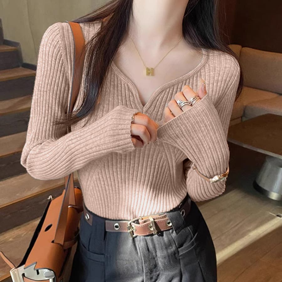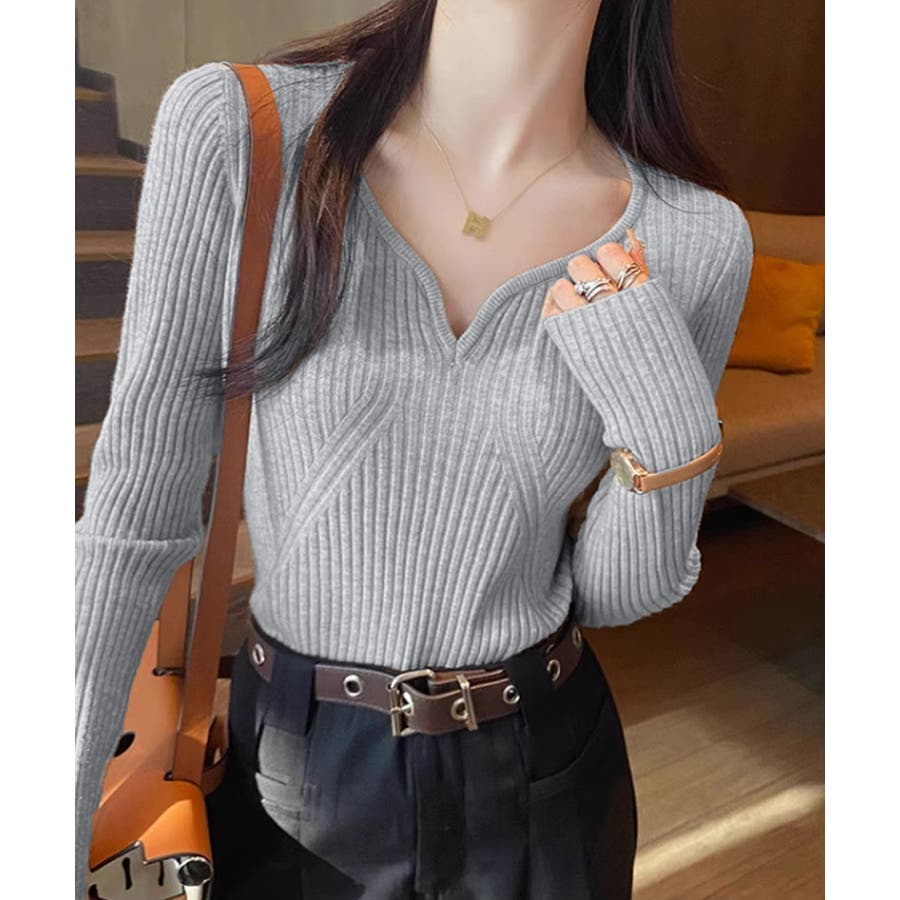 キーネックニット リブニット ニットトップス