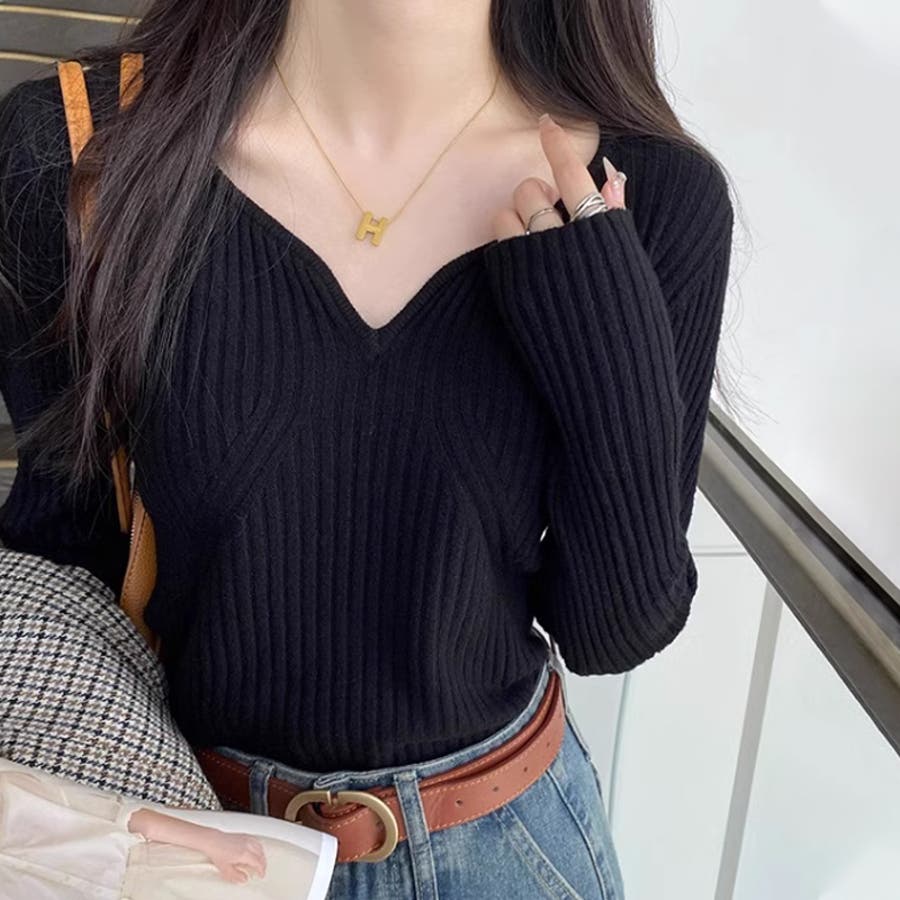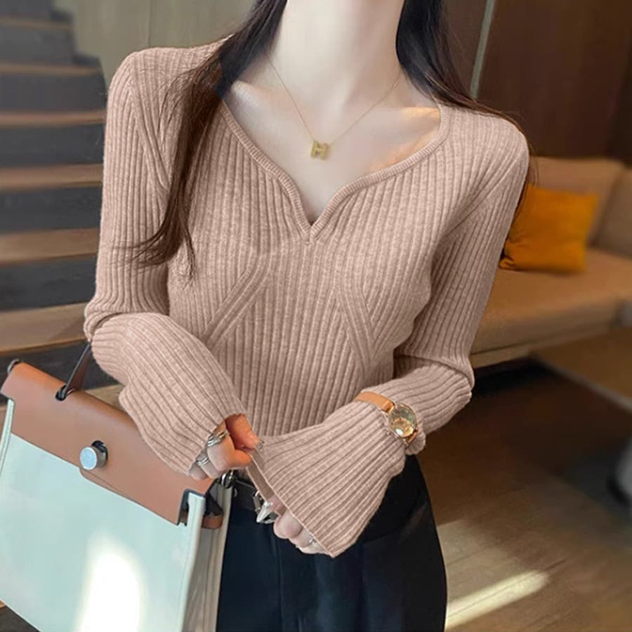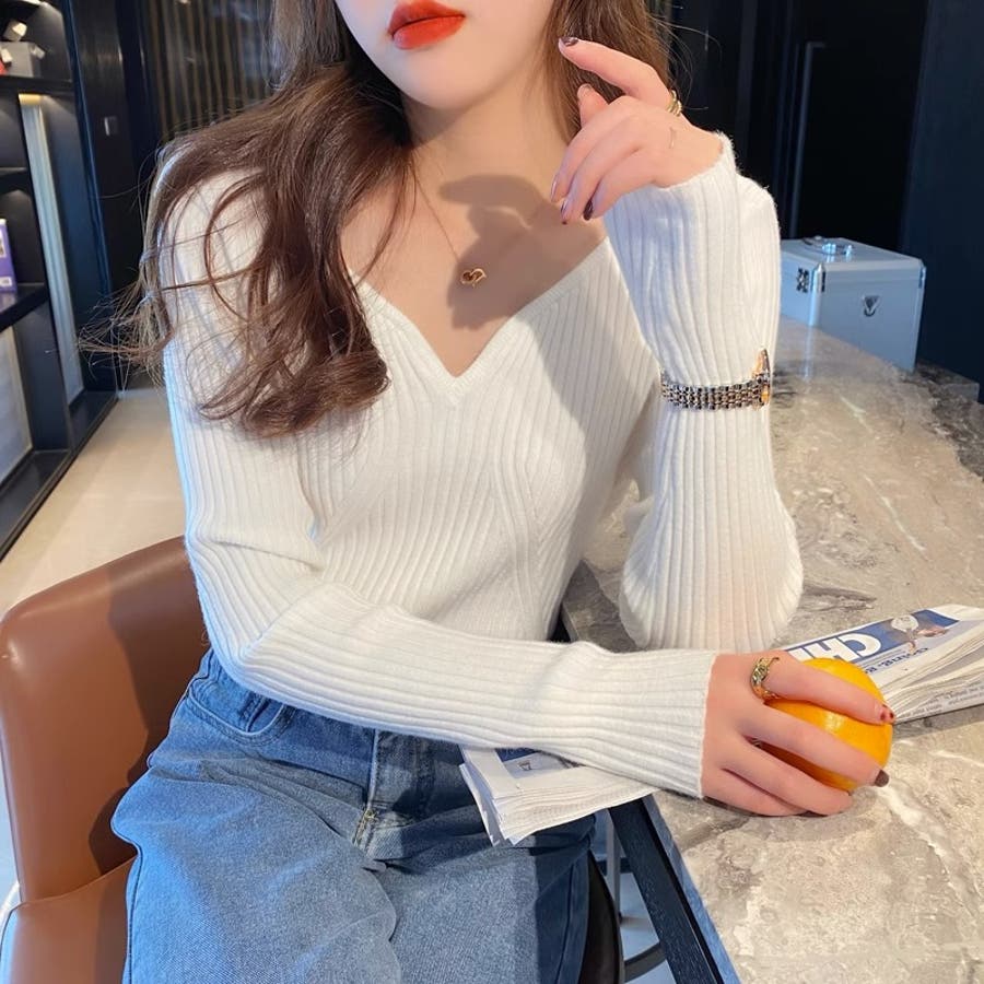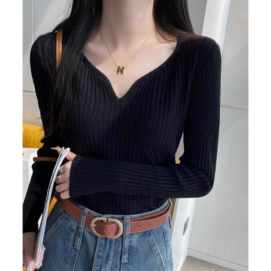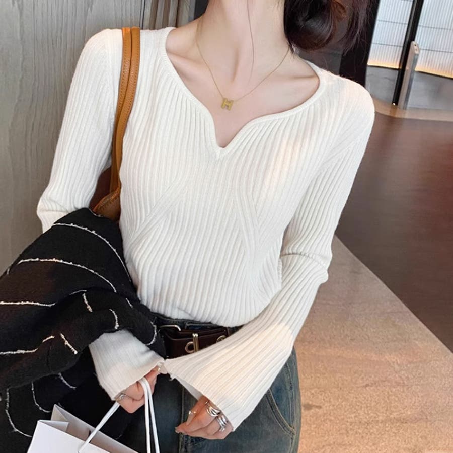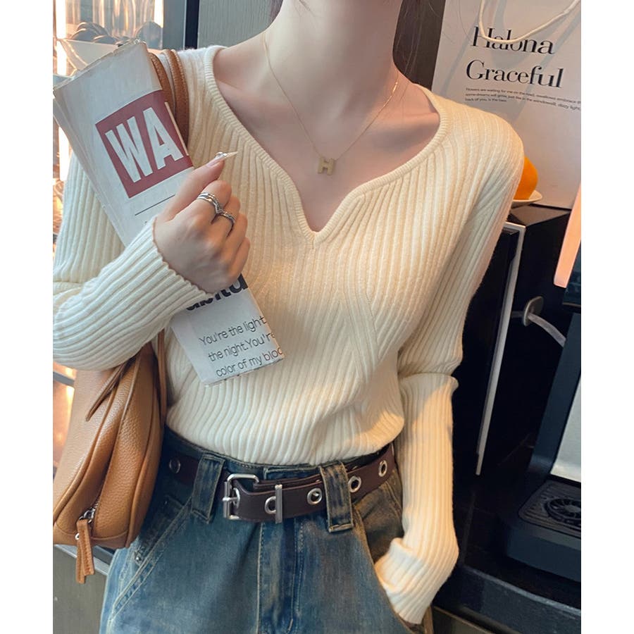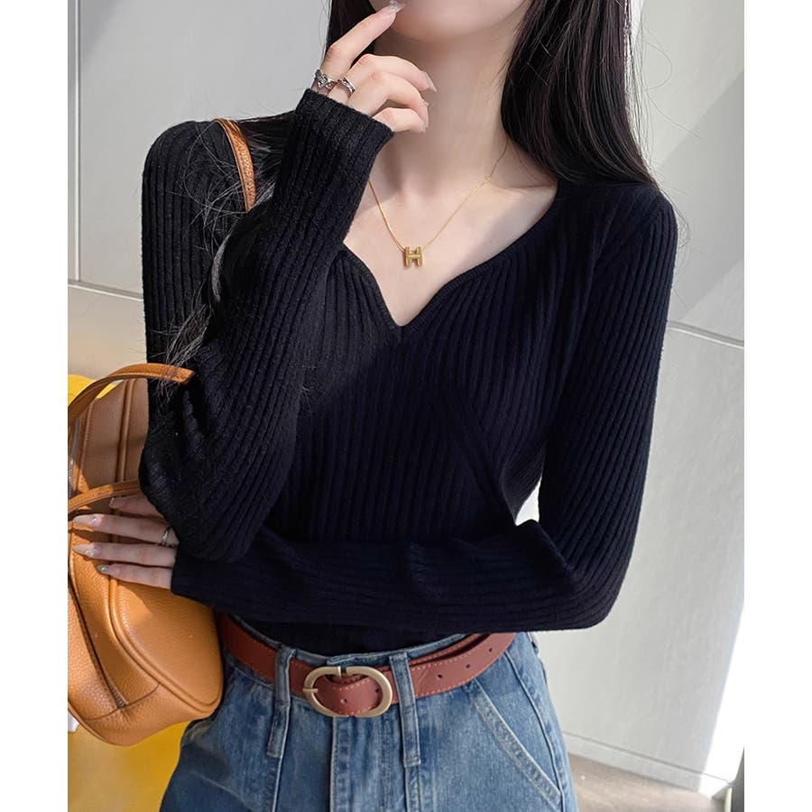 キーネックニット リブニット ニットトップス