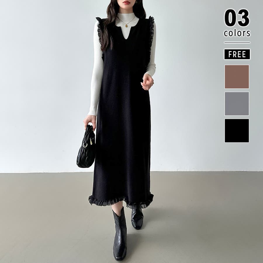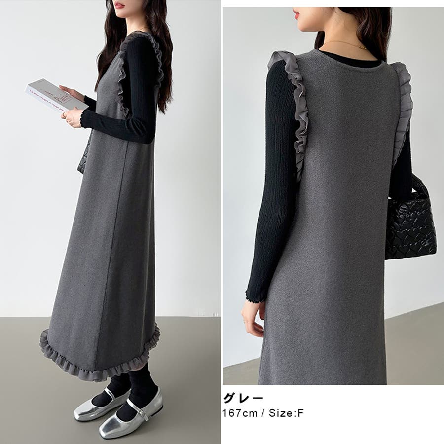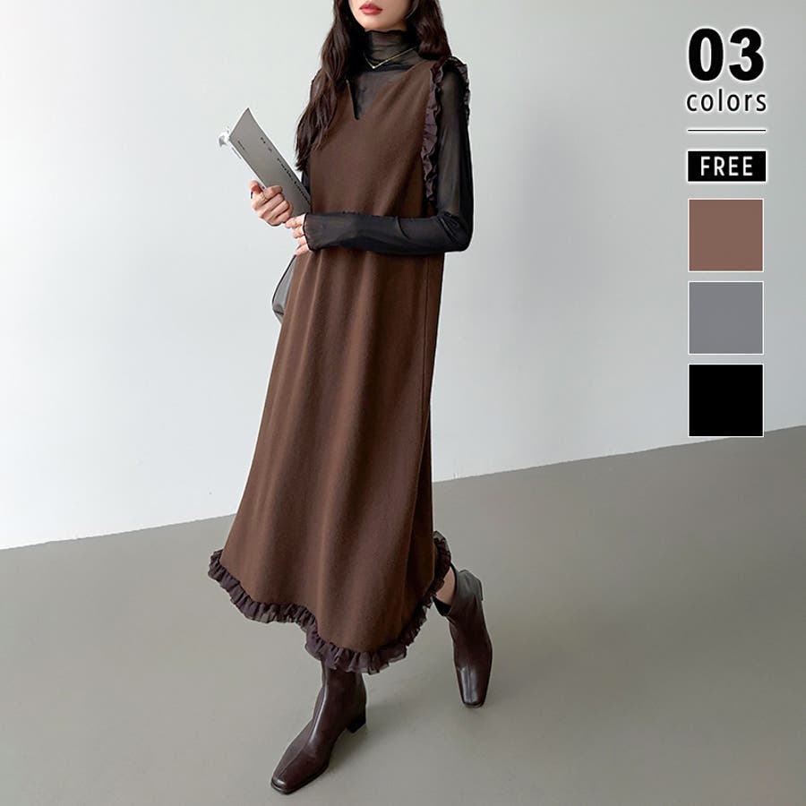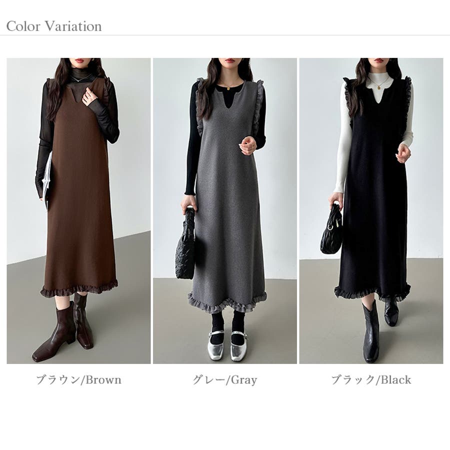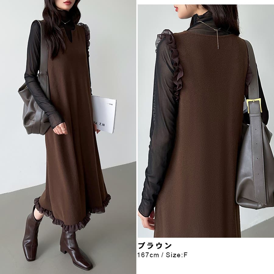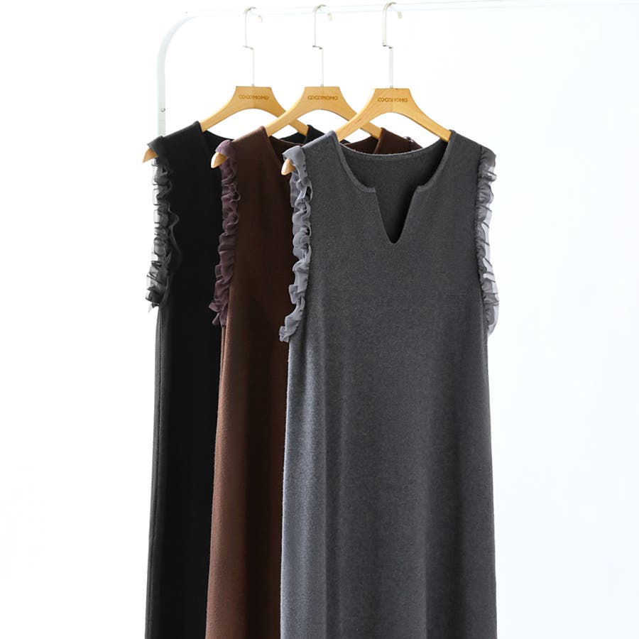 ジャンパースカート ショルダーフリル ワンピース ニット レディース フリル チュール vネック 大人 ニットワンピース ノースリーブ 肩フリル ロング ジャンスカ 裾フリル aライン 大人可愛い フリルワンピース 肩 肩フリルワンピース ショルダーフリルワンピース チュールフリル フリルチュール 裾 着痩せ ノースリーブワンピース おしゃれ ワンピ 膝下 ひざ下 ミモレ ミモレ丈 丈 ロング丈 袖なし 袖無し Aライン V Vネック キーネック vネックワンピース ジャンスカワンピース ロングワンピース ミディアム丈 フレアワンピース 重ね 重ね着 レイヤード 細見え らくちん 楽ちん シンプル 伸縮性 ストレッチ お出かけ おでかけ 旅行 デート プチプラ 高見え フェミニン ガーリー バレエコア カジュアル きれいめ きれい きれい め キレイめ かわいい 可愛い 大人っぽい オトナ女子 おしゃれ オシャレ 女性 女子 ママ ママコーデ 母 フリー サイズ フリーサイズ ブラウン 茶色 グレー 灰色 ブラック 黒 カラー きれいめワンピース ワンピース秋 大人可愛いワンピース ワンピース秋冬 新作 秋冬 秋 冬 秋服 冬服 秋物 冬物 韓国 韓国ファッション 10代 20代 30代 40代 50代 cocomomo ココモモ