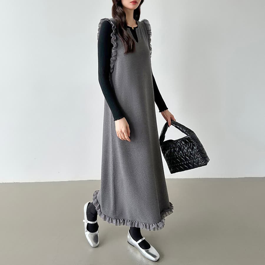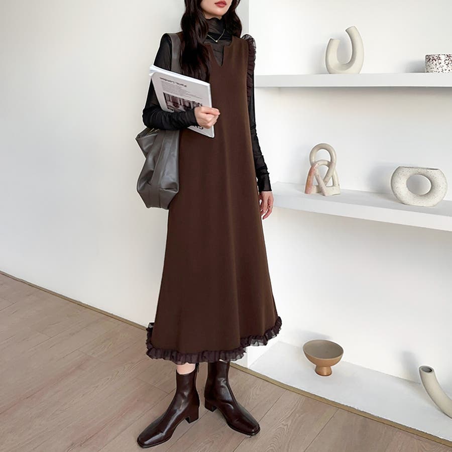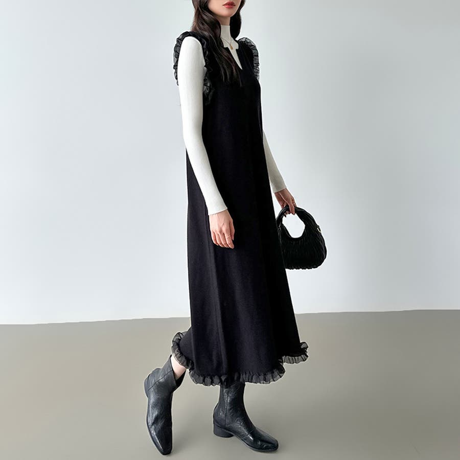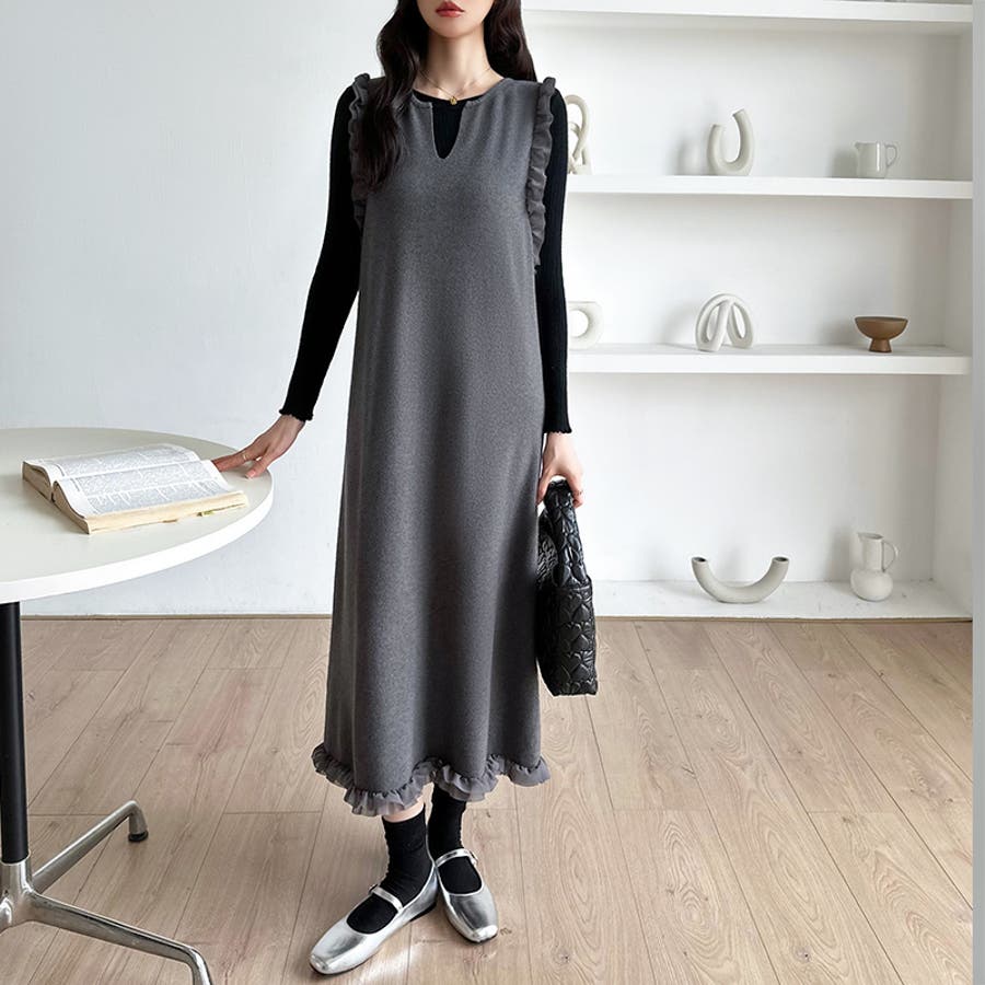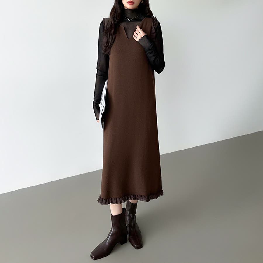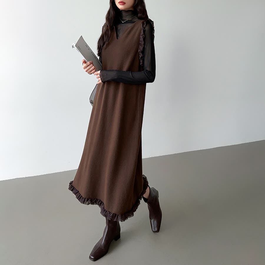 ジャンパースカート ショルダーフリル ワンピース ニット レディース フリル チュール vネック 大人 ニットワンピース ノースリーブ 肩フリル ロング ジャンスカ 裾フリル aライン 大人可愛い フリルワンピース 肩 肩フリルワンピース ショルダーフリルワンピース チュールフリル フリルチュール 裾 着痩せ ノースリーブワンピース おしゃれ ワンピ 膝下 ひざ下 ミモレ ミモレ丈 丈 ロング丈 袖なし 袖無し Aライン V Vネック キーネック vネックワンピース ジャンスカワンピース ロングワンピース ミディアム丈 フレアワンピース 重ね 重ね着 レイヤード 細見え らくちん 楽ちん シンプル 伸縮性 ストレッチ お出かけ おでかけ 旅行 デート プチプラ 高見え フェミニン ガーリー バレエコア カジュアル きれいめ きれい きれい め キレイめ かわいい 可愛い 大人っぽい オトナ女子 おしゃれ オシャレ 女性 女子 ママ ママコーデ 母 フリー サイズ フリーサイズ ブラウン 茶色 グレー 灰色 ブラック 黒 カラー きれいめワンピース ワンピース秋 大人可愛いワンピース ワンピース秋冬 新作 秋冬 秋 冬 秋服 冬服 秋物 冬物 韓国 韓国ファッション 10代 20代 30代 40代 50代 cocomomo ココモモ