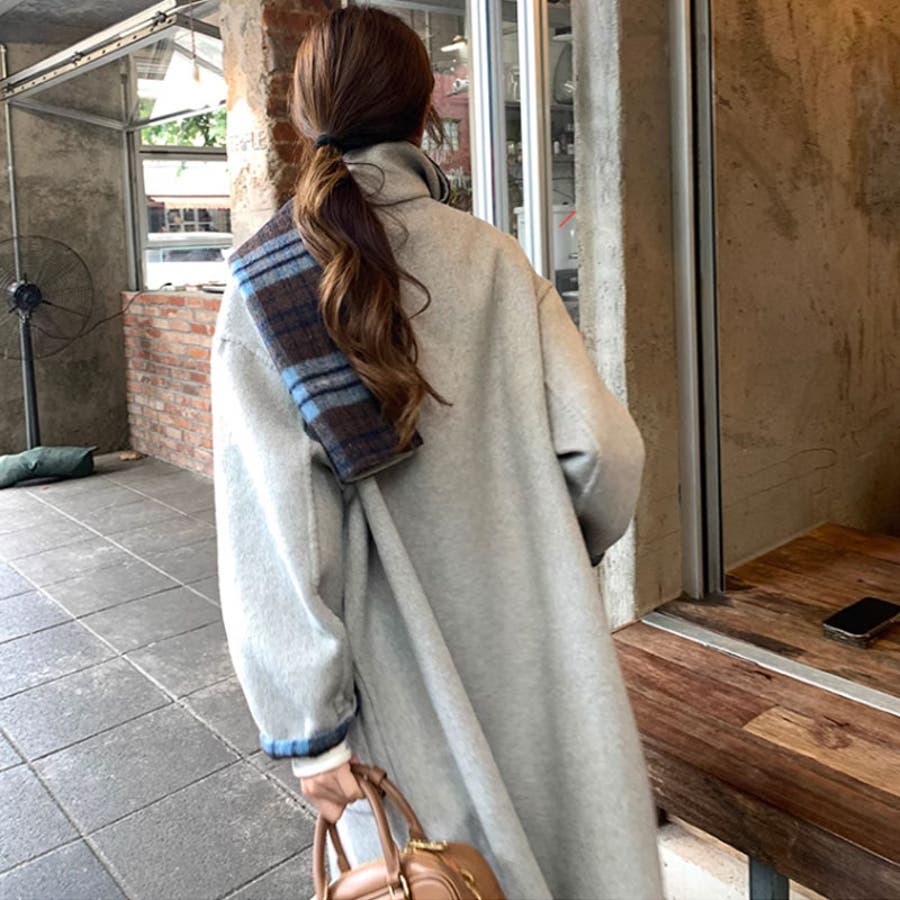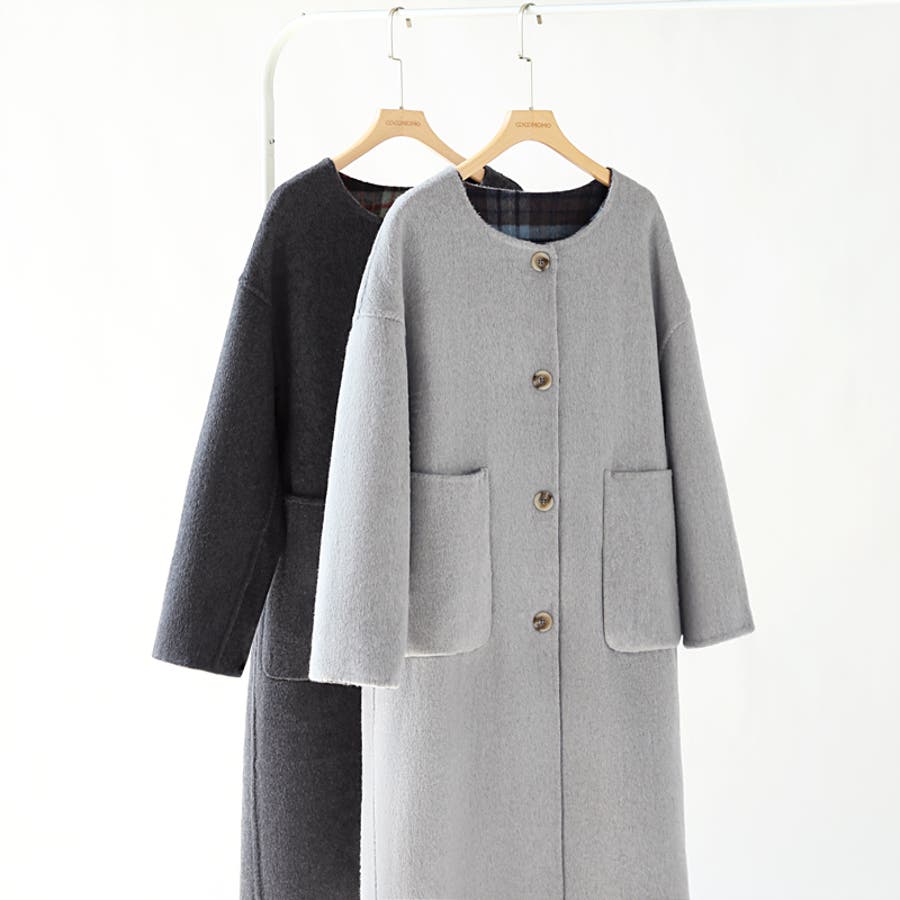 リバーシブルチェックコート マフラー付きノーカラーコート ロングコート