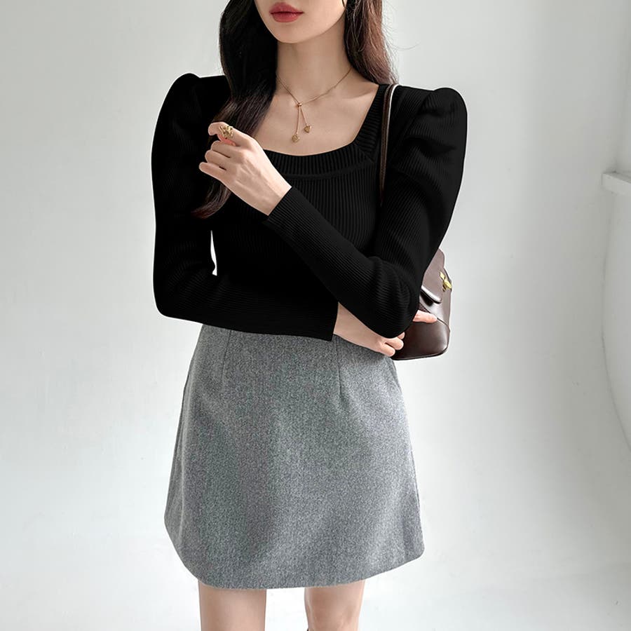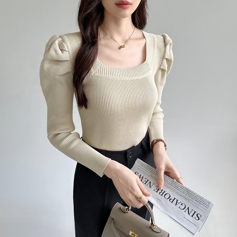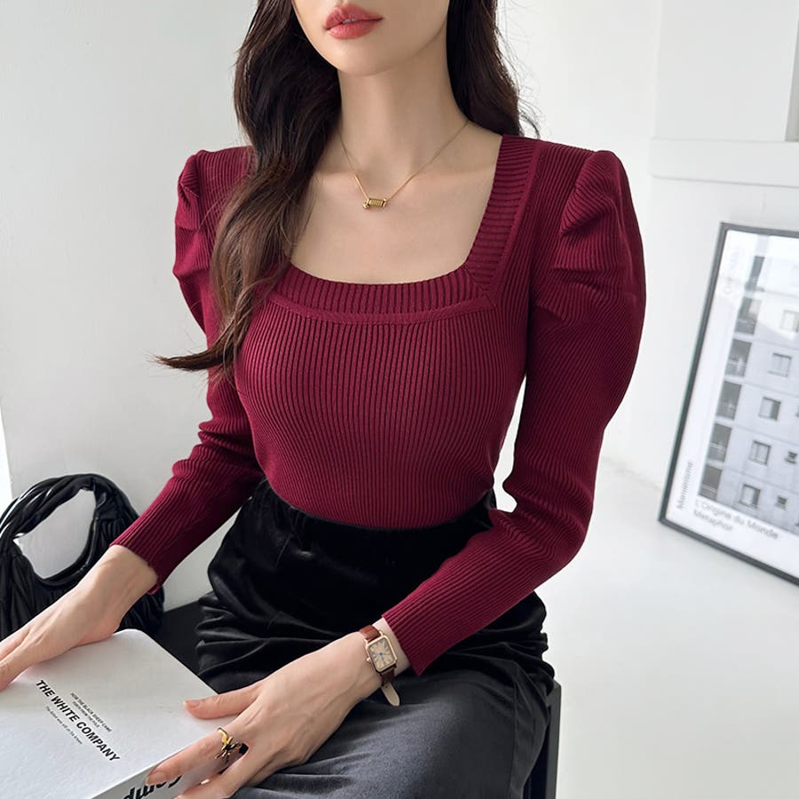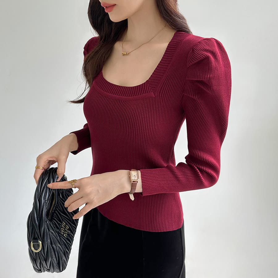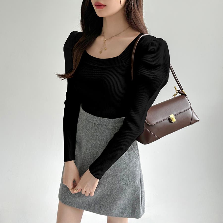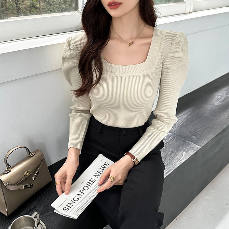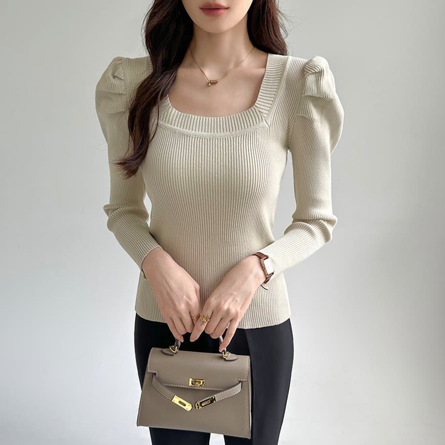 リブニット スクエアネック パフスリーブニット