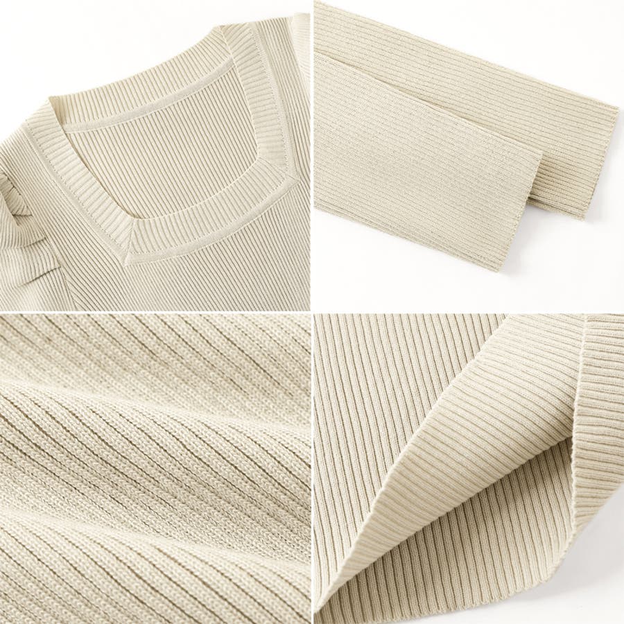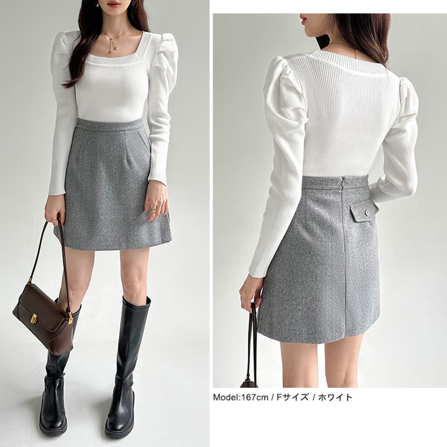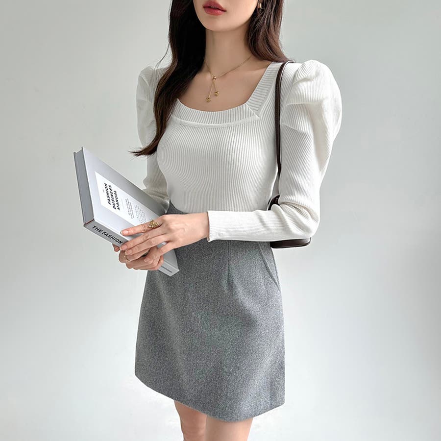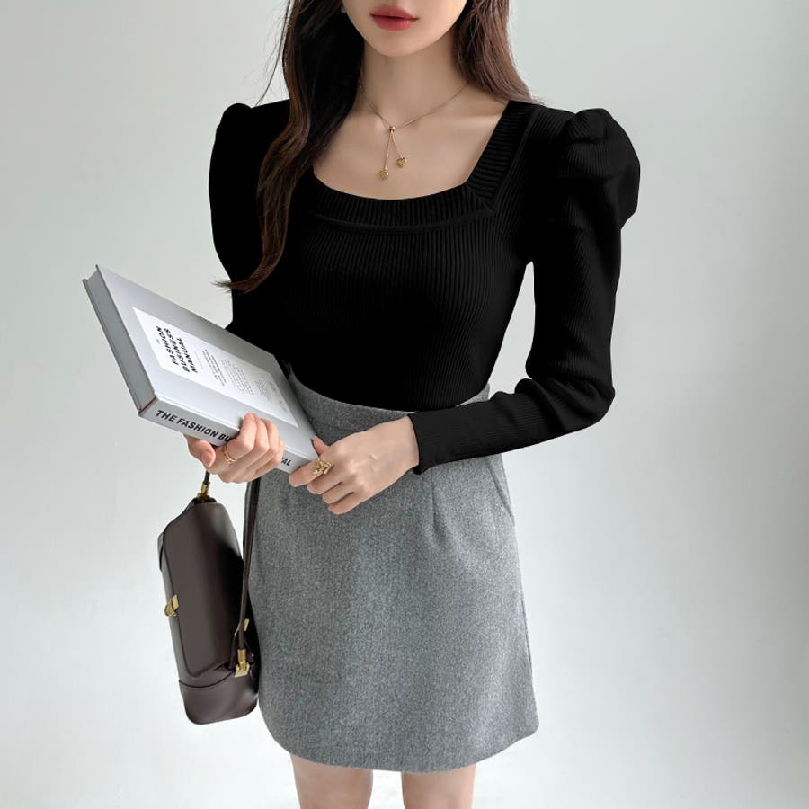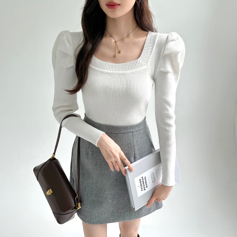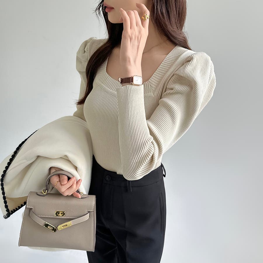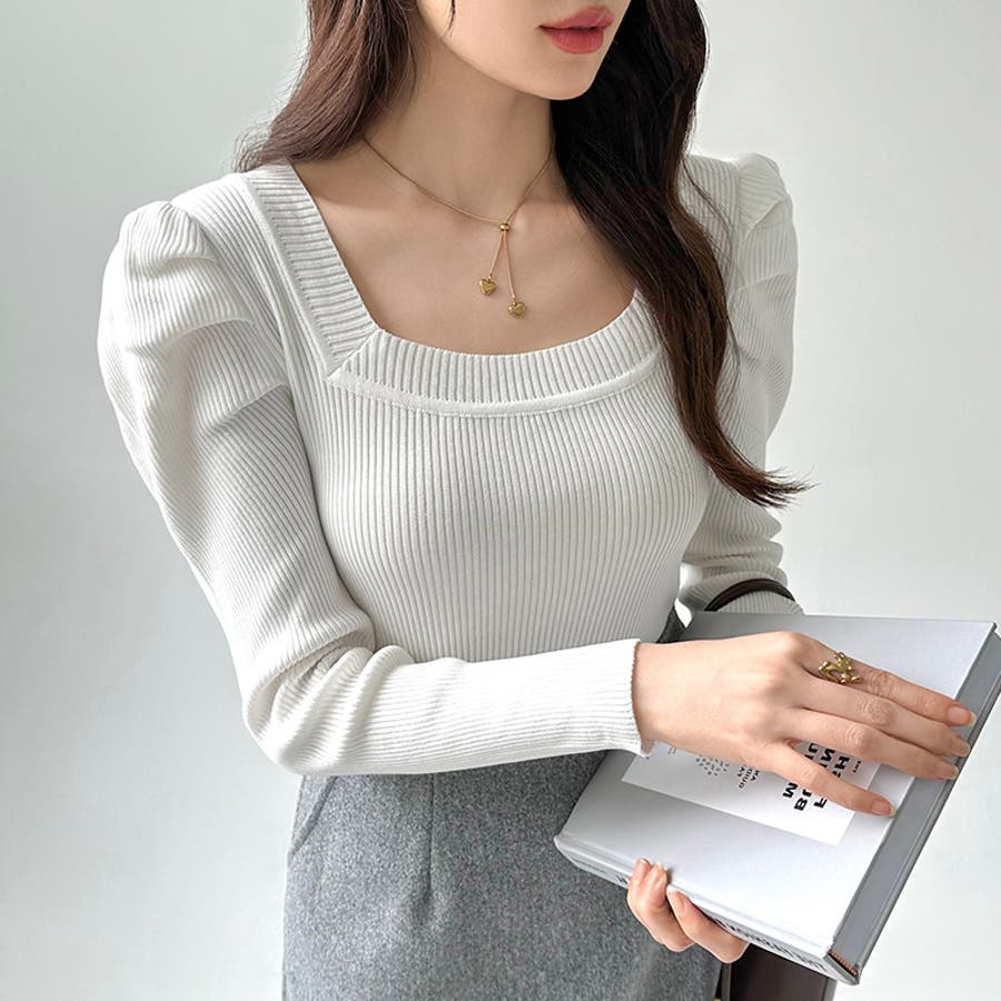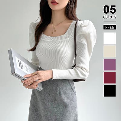 リブニット スクエアネック パフスリーブニット