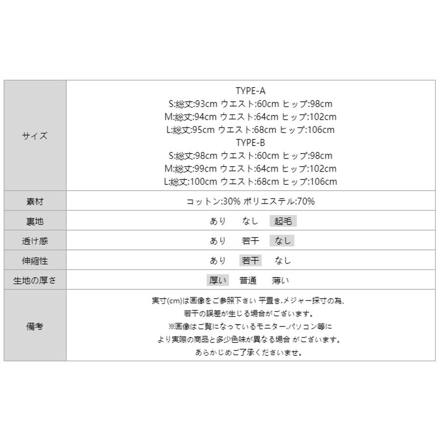 | サイズ | TYPE-A(レギュラー丈) S: 総丈 93cm ウエスト 60cm ヒップ 98cm M: 総丈 94cm ウエスト 64cm ヒップ 102cm L: 総丈 95cm ウエスト 68cm ヒップ 106cm TYPE-B(ロング丈) S: 総丈 98cm ウエスト 60cm ヒップ 98cm M: 総丈 99cm ウエスト 64cm ヒップ 102cm L: 総丈 100m ウエスト 68cm ヒップ 106cm |
