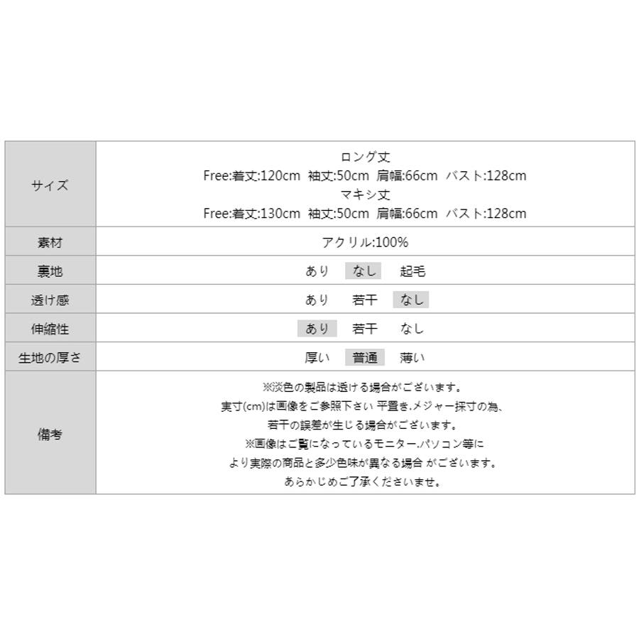 | サイズ | ロング丈 Free: 着丈 120cm 袖丈 50cm 肩幅 66cm バスト 128cm マキシ丈 Free: 着丈 130cm 袖丈 50cm 肩幅 66cm バスト 128cm |
