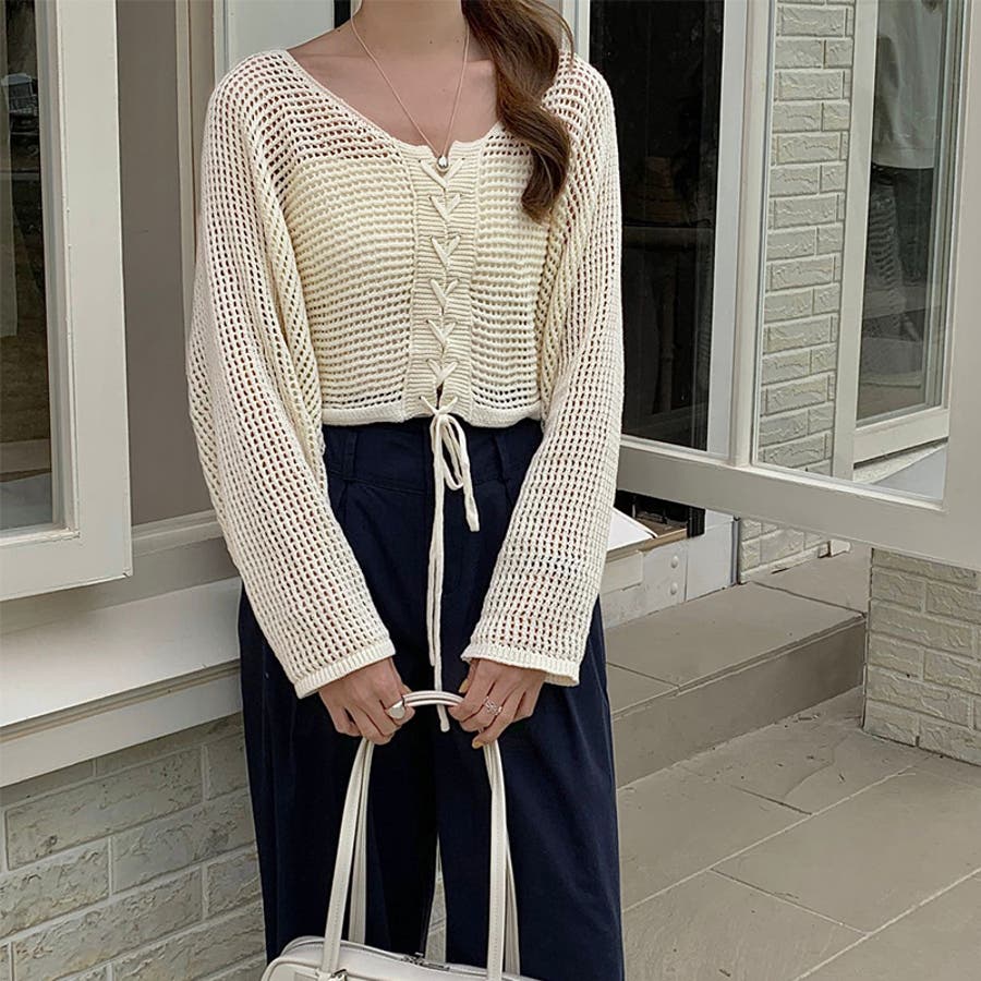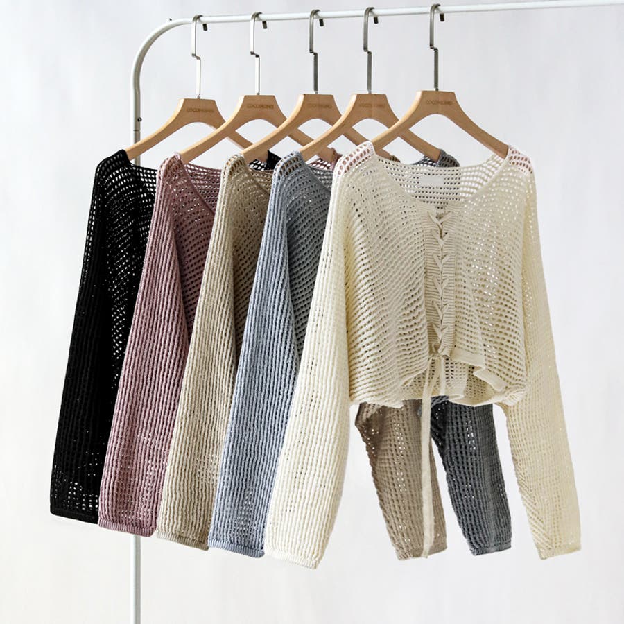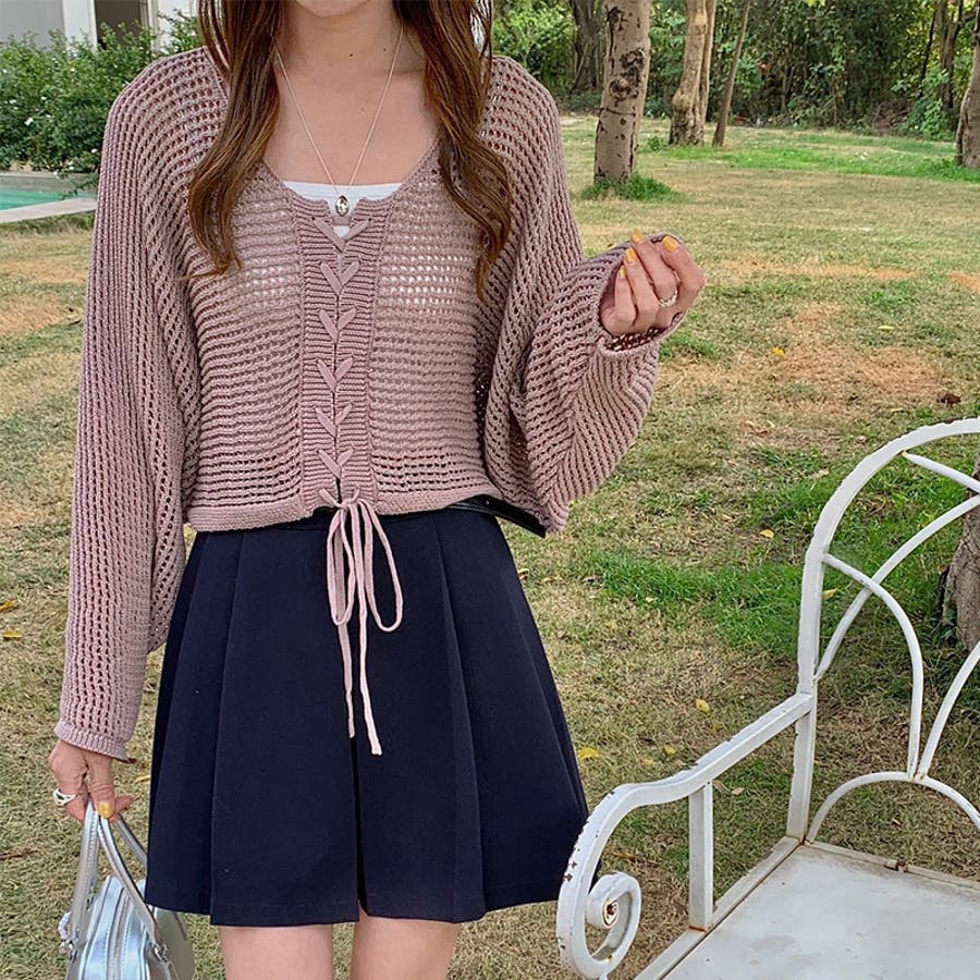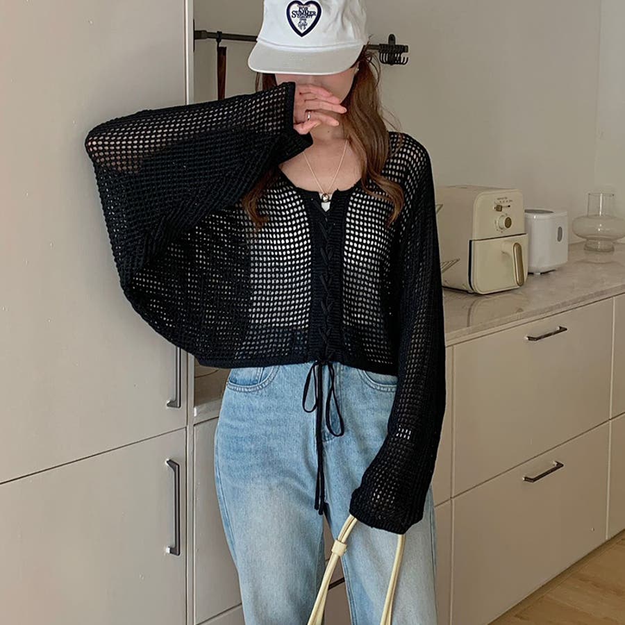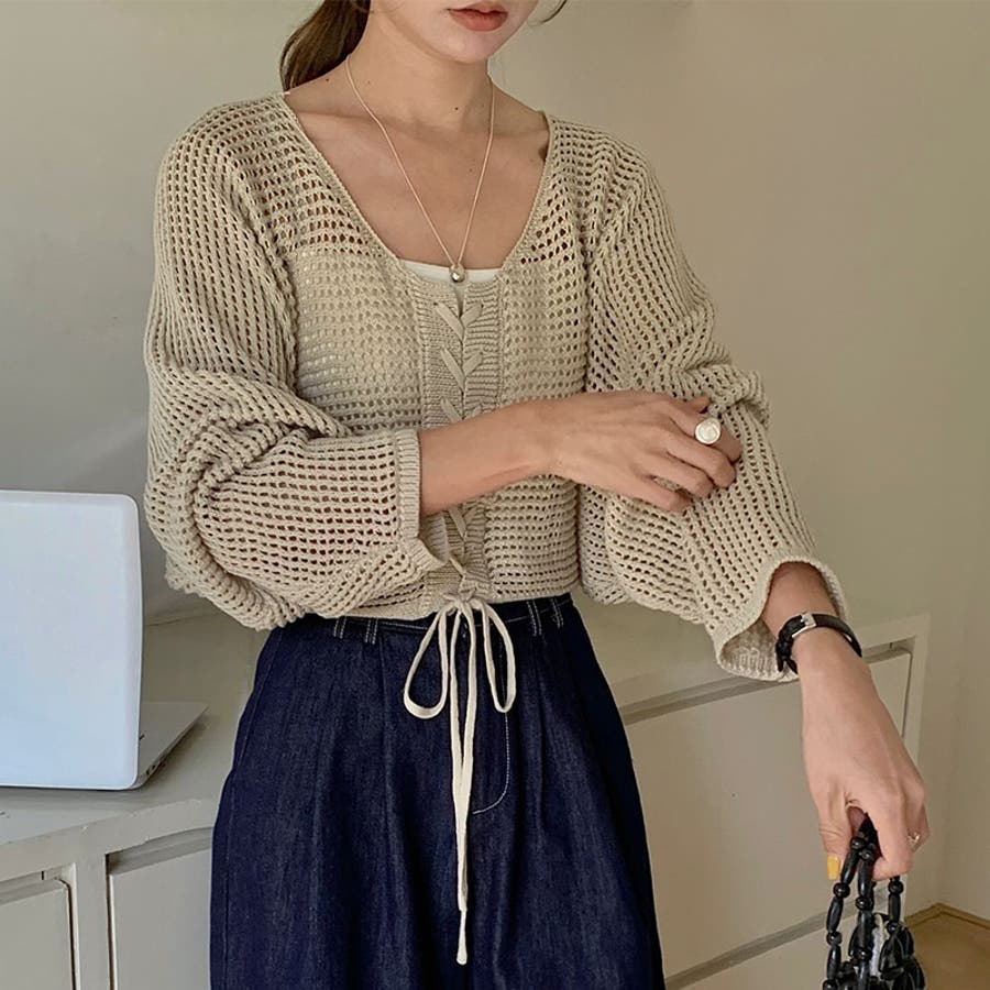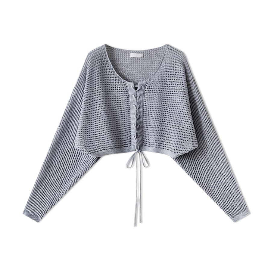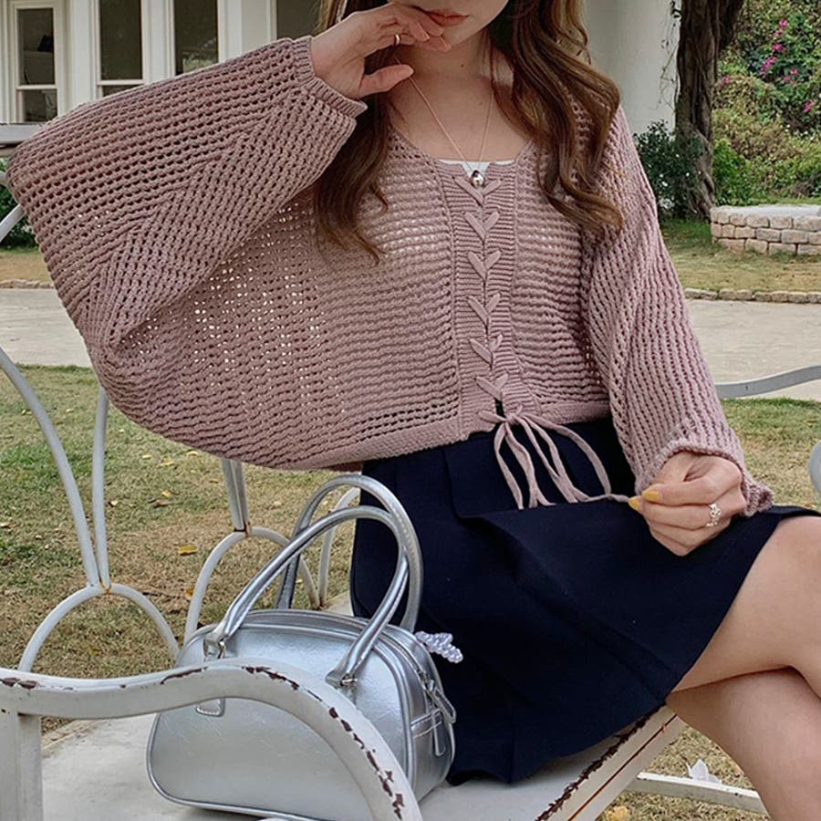 ざっくり透かし編み メッシュトップス レースアップショートカーディガン