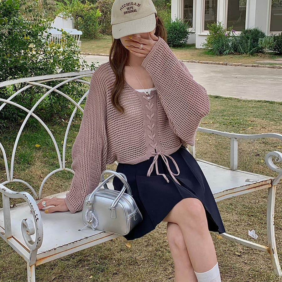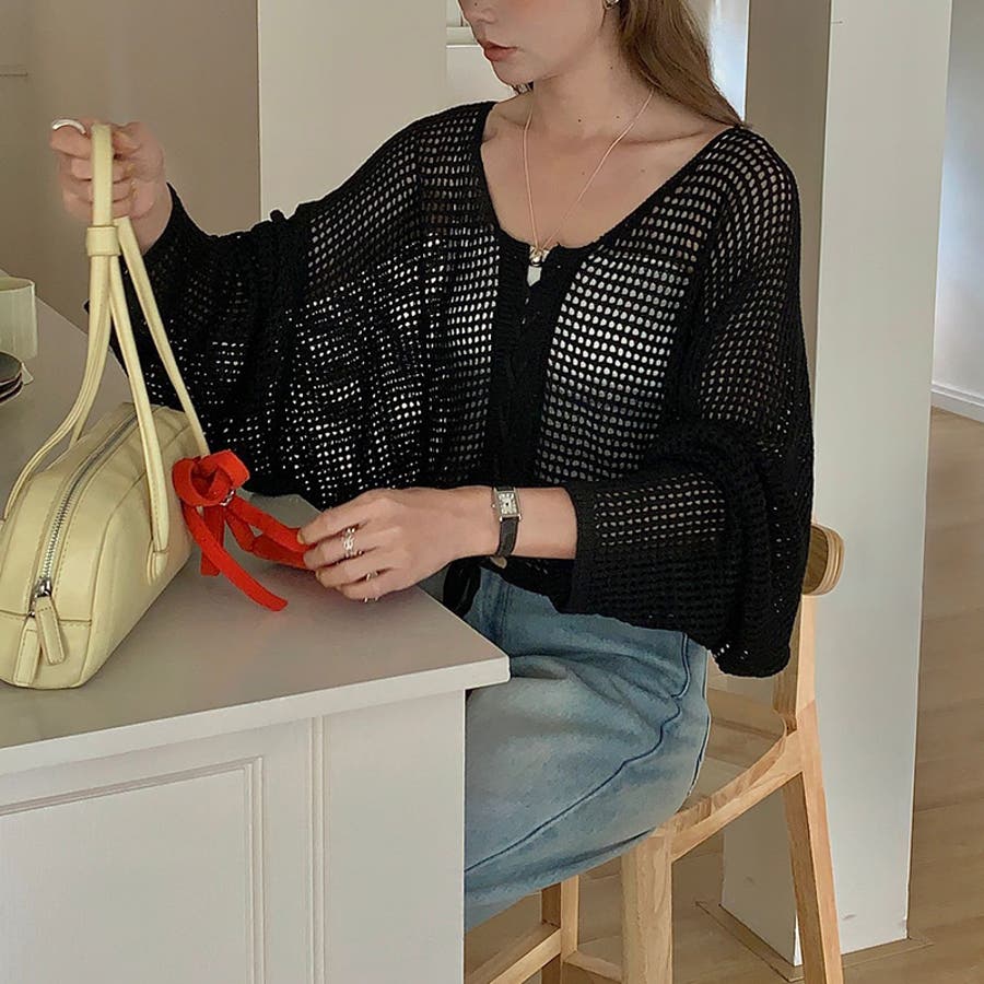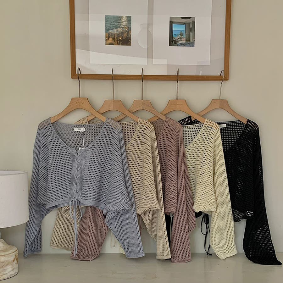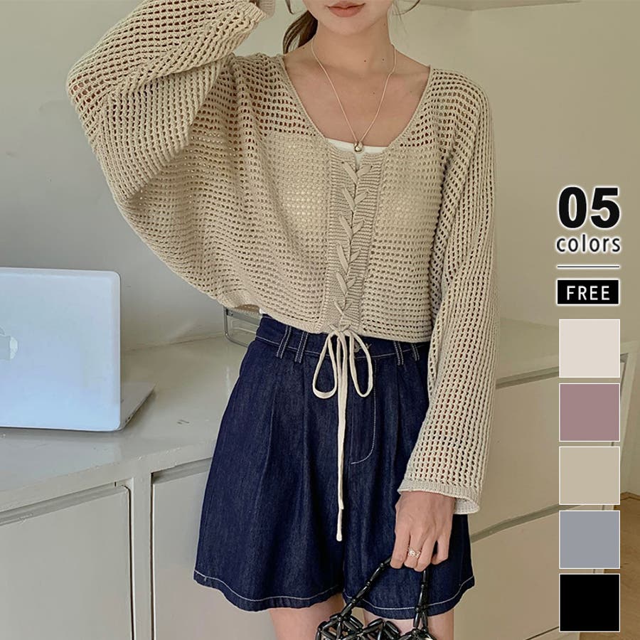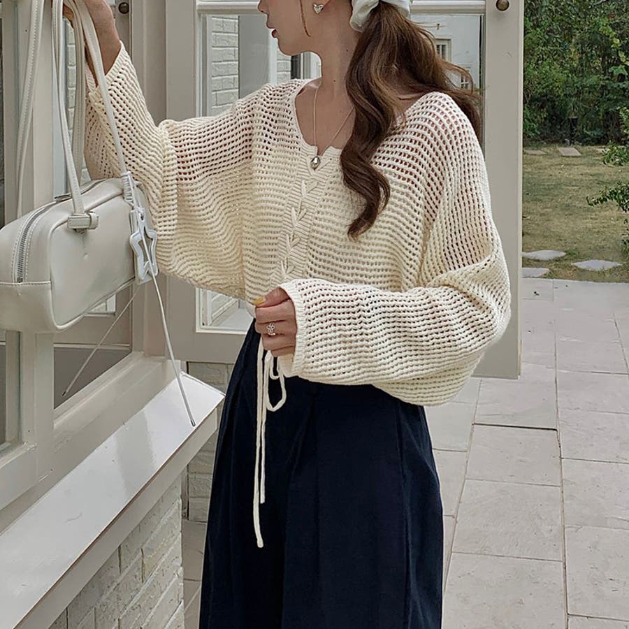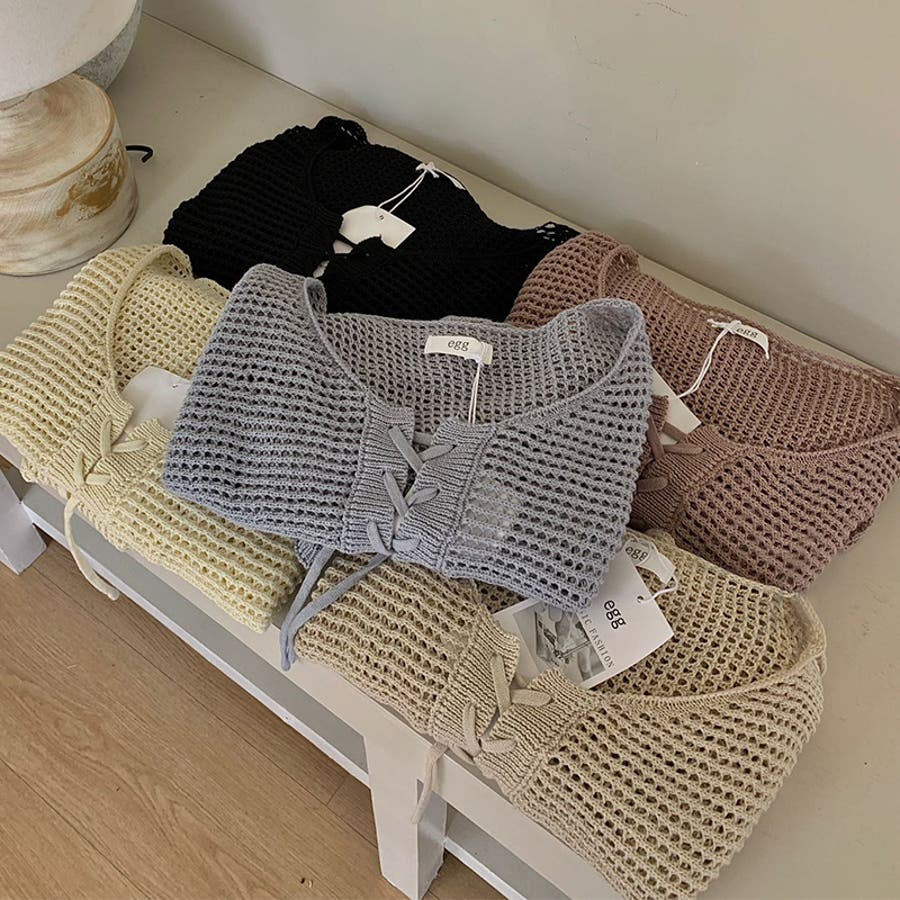 ざっくり透かし編み メッシュトップス レースアップショートカーディガン