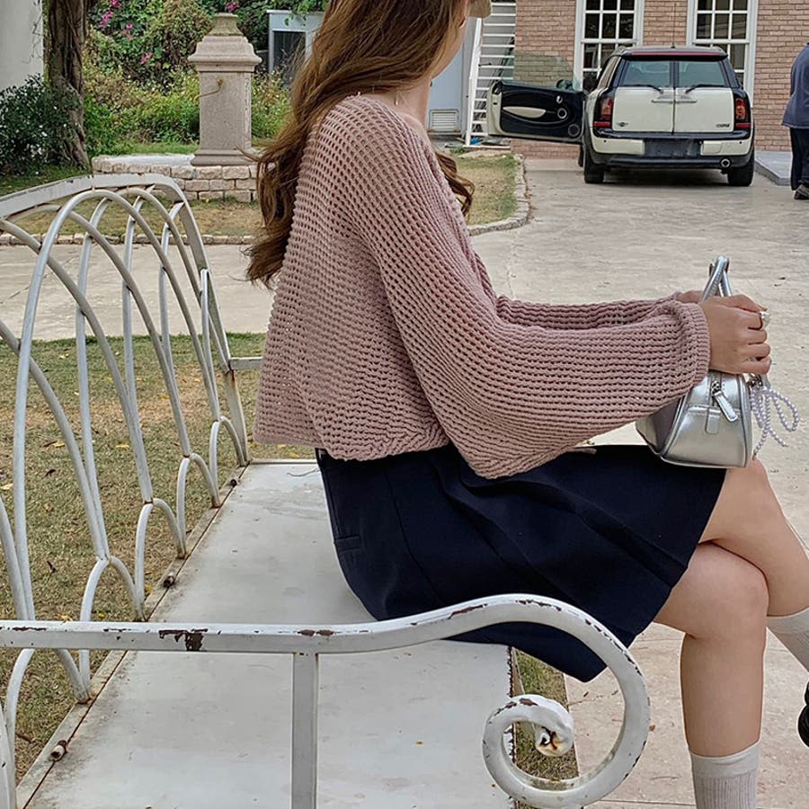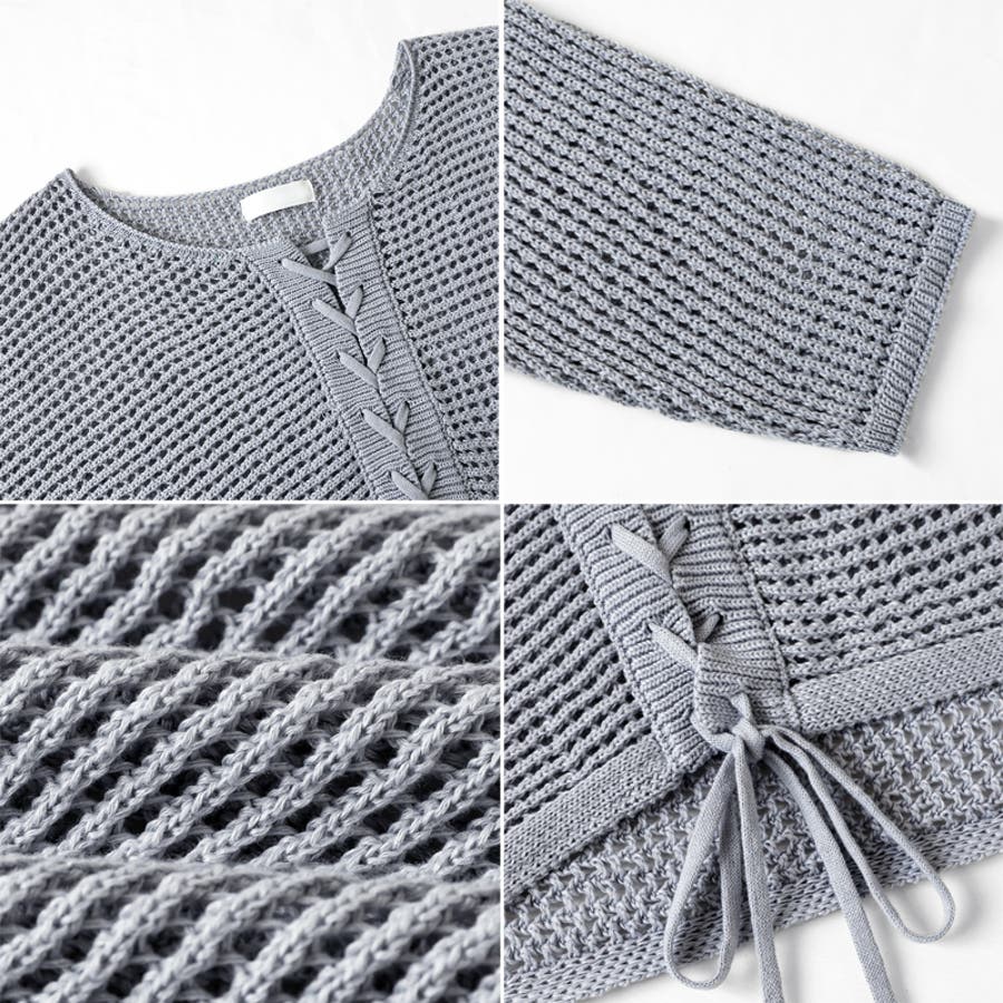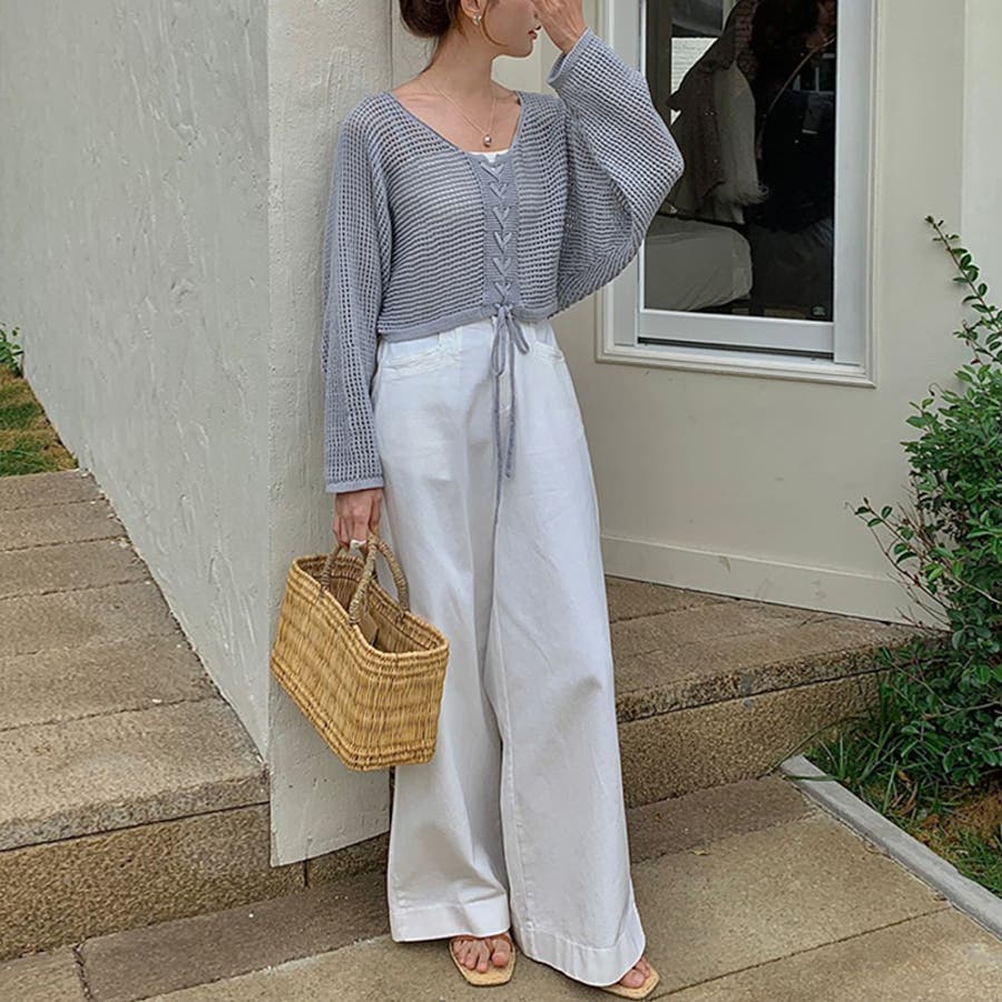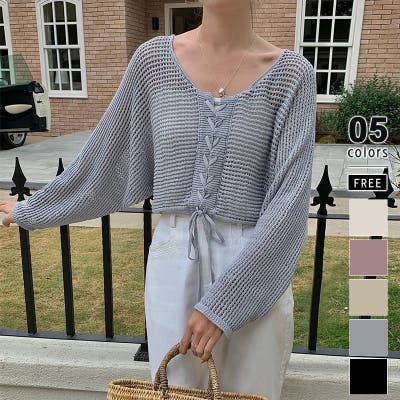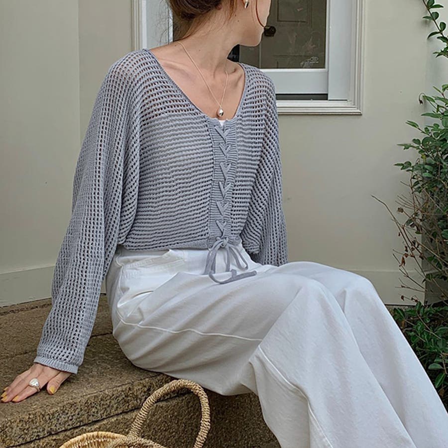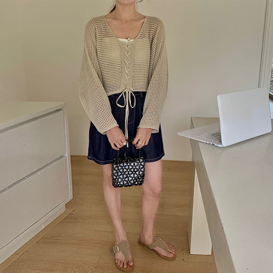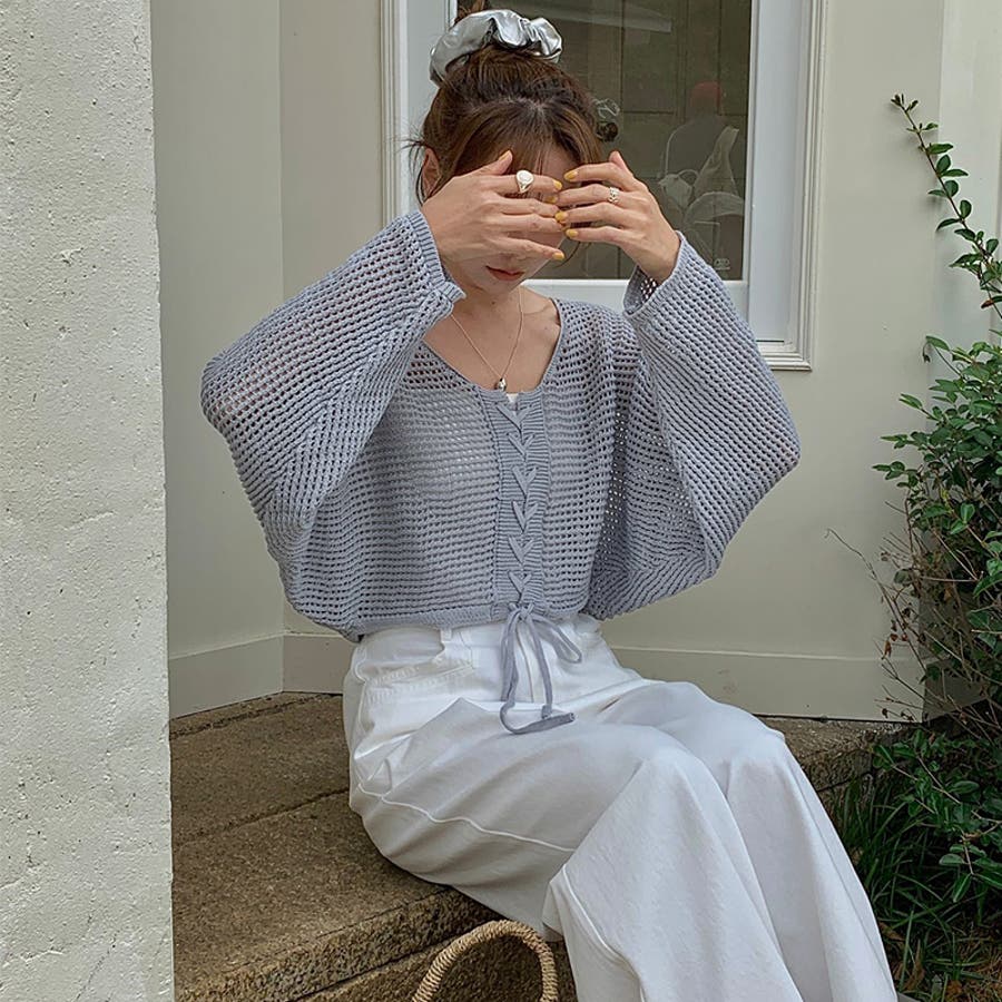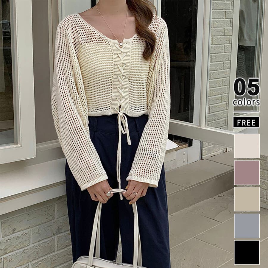 ざっくり透かし編み メッシュトップス レースアップショートカーディガン