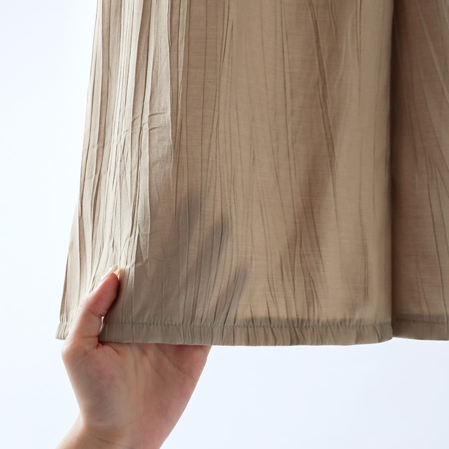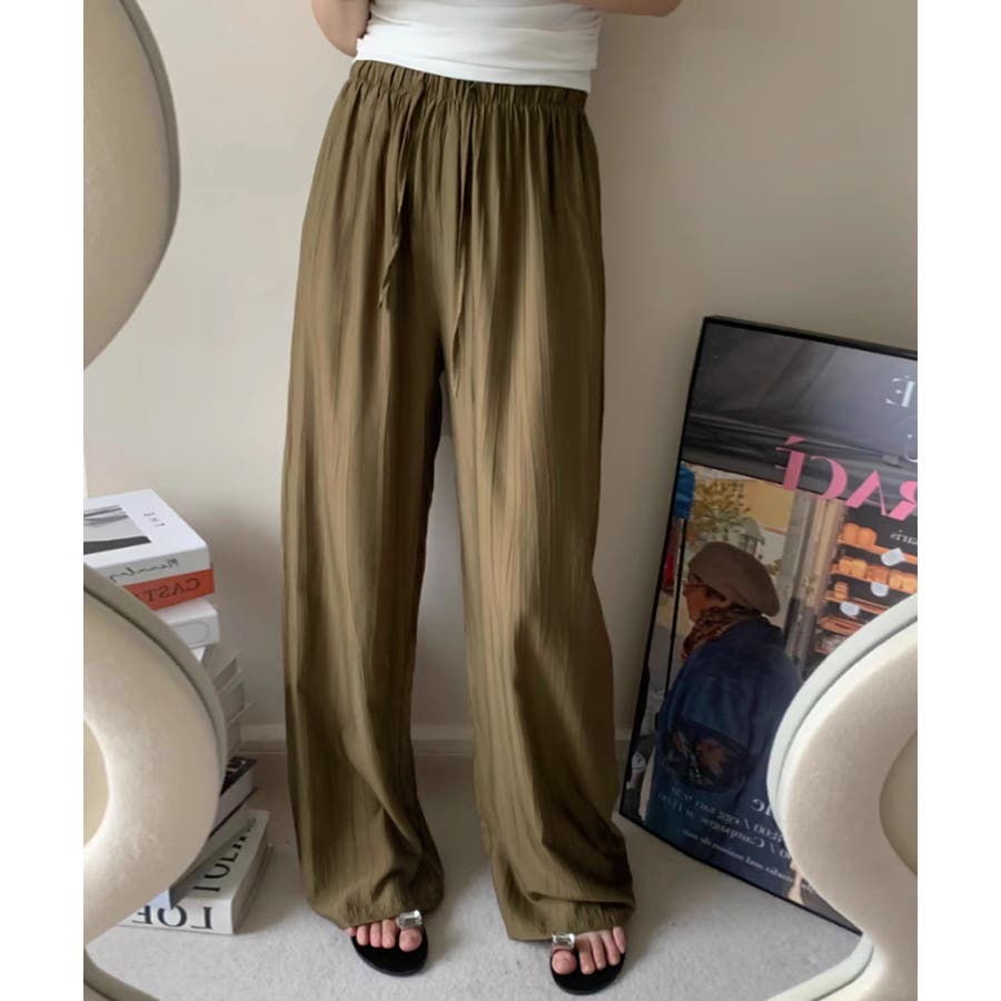 【カーキ】プリーツシワ加工 ワイドパンツ イージーパンツ