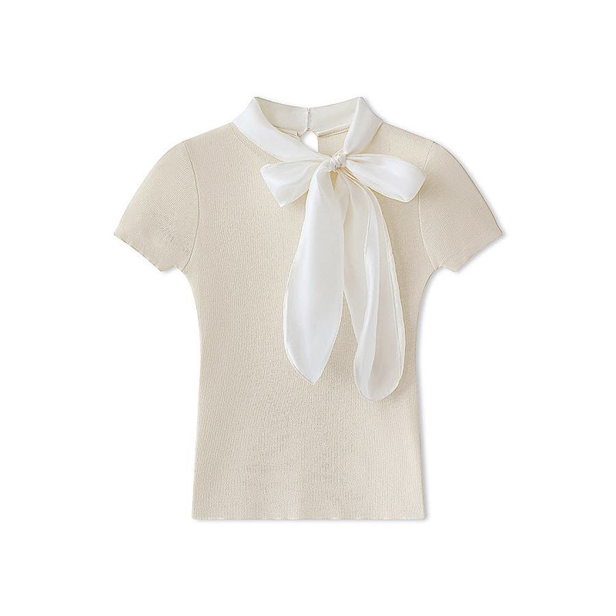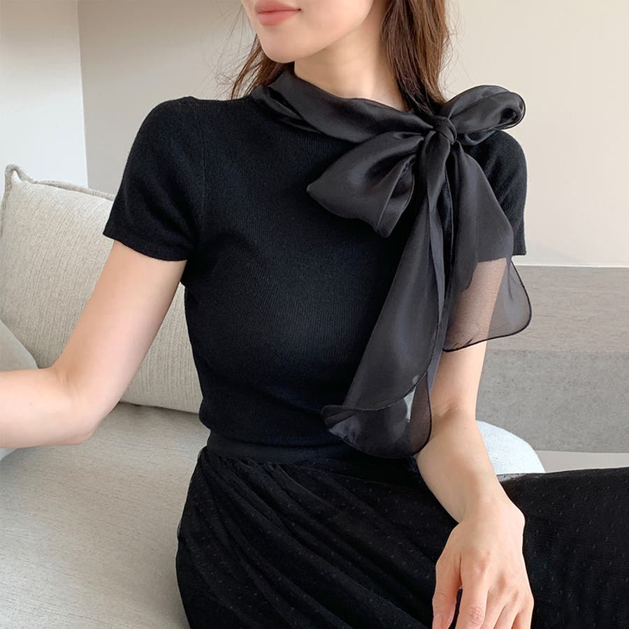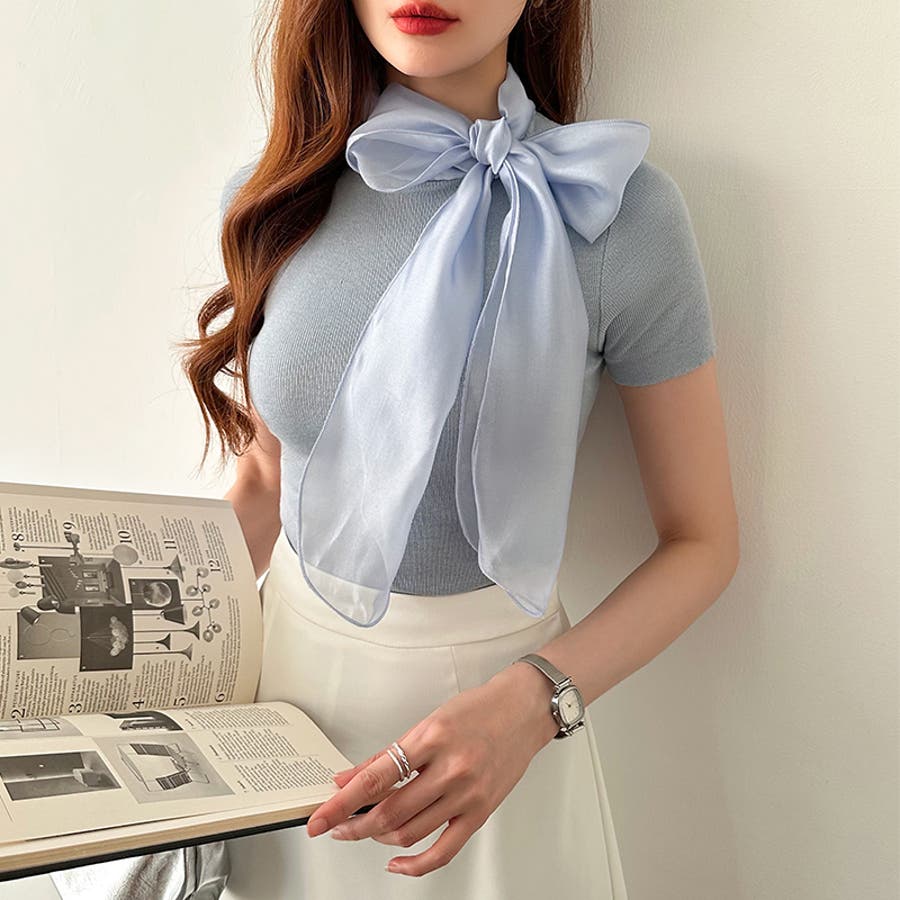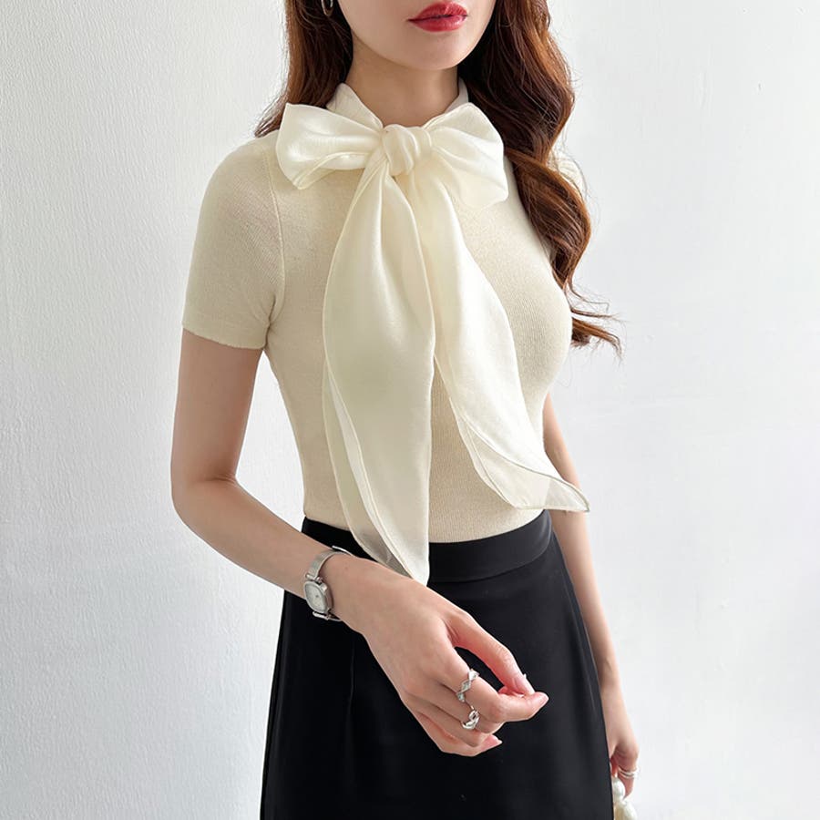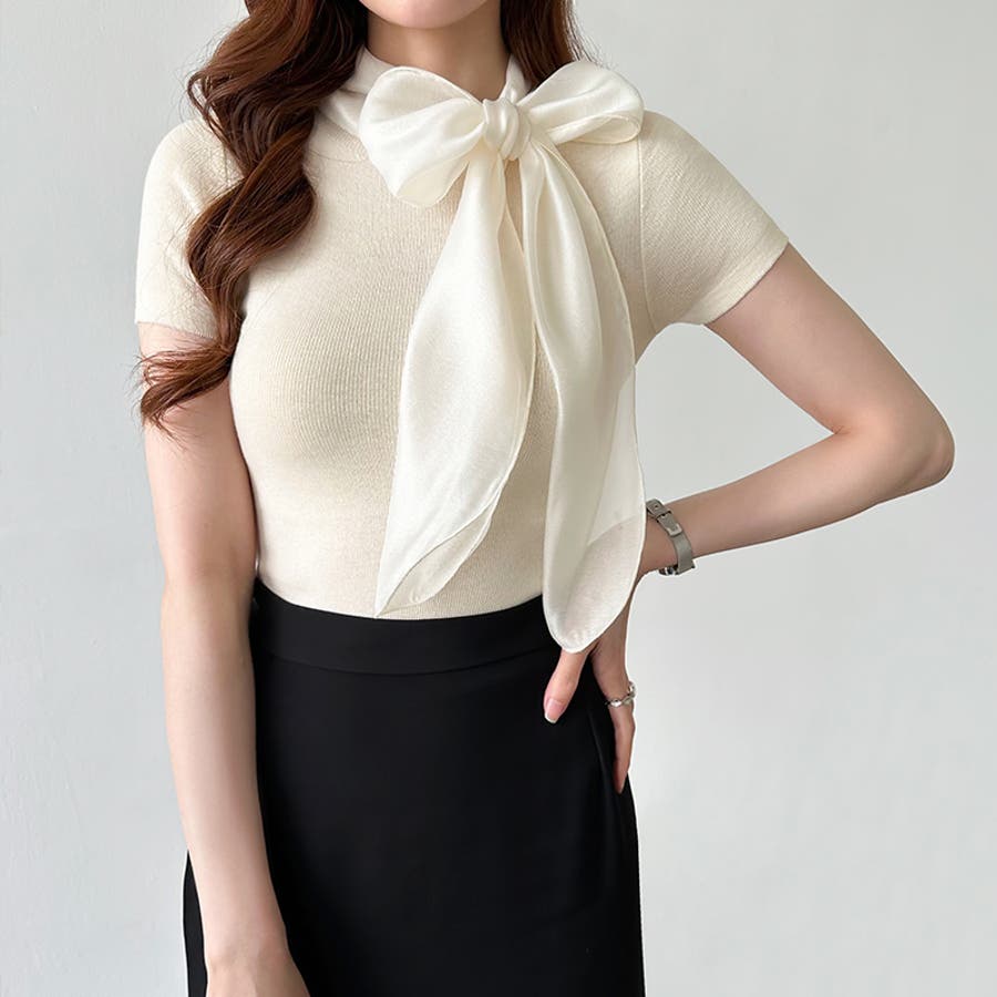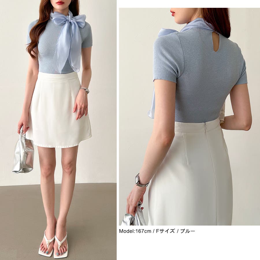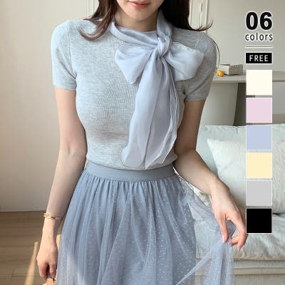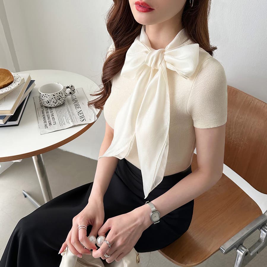 リボンスカーフトップス ボウタイリボン 半袖ニット