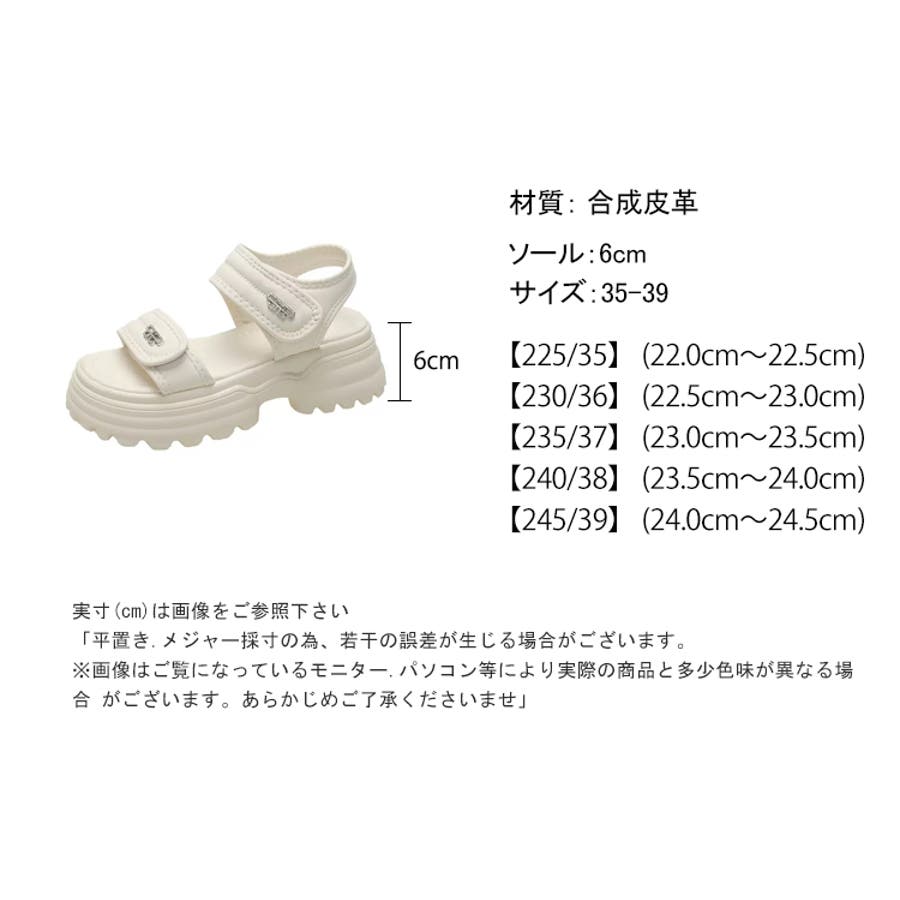 | サイズ | ソール: 6cm サイズ: 35-39 【225/35】 22.0-22.5cm 【230/36】 22.5-23.0cm 【235/37】 23.0-23.5cm 【240/38】 23.5-24.0cm 【245/39】 24.0-24.5cm |