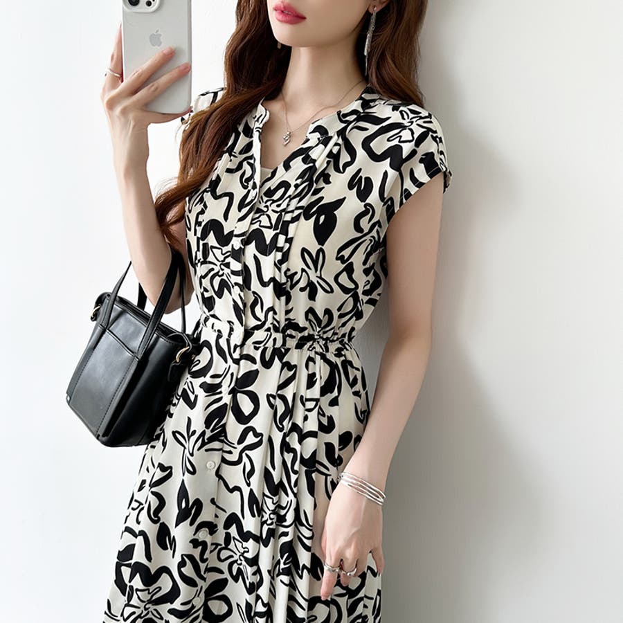 フレンチスリーブワンピース 夏ワンピース 総柄ワンピース