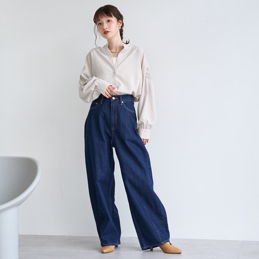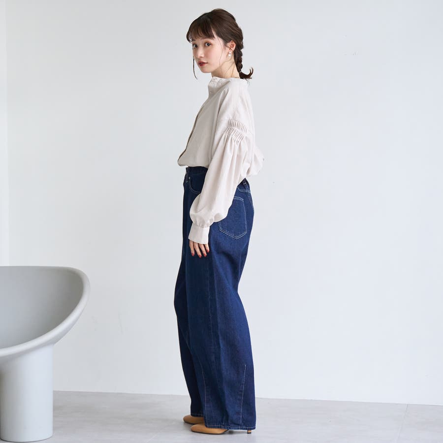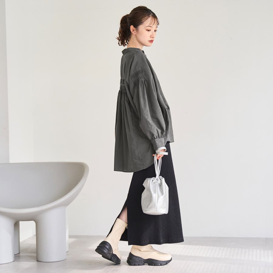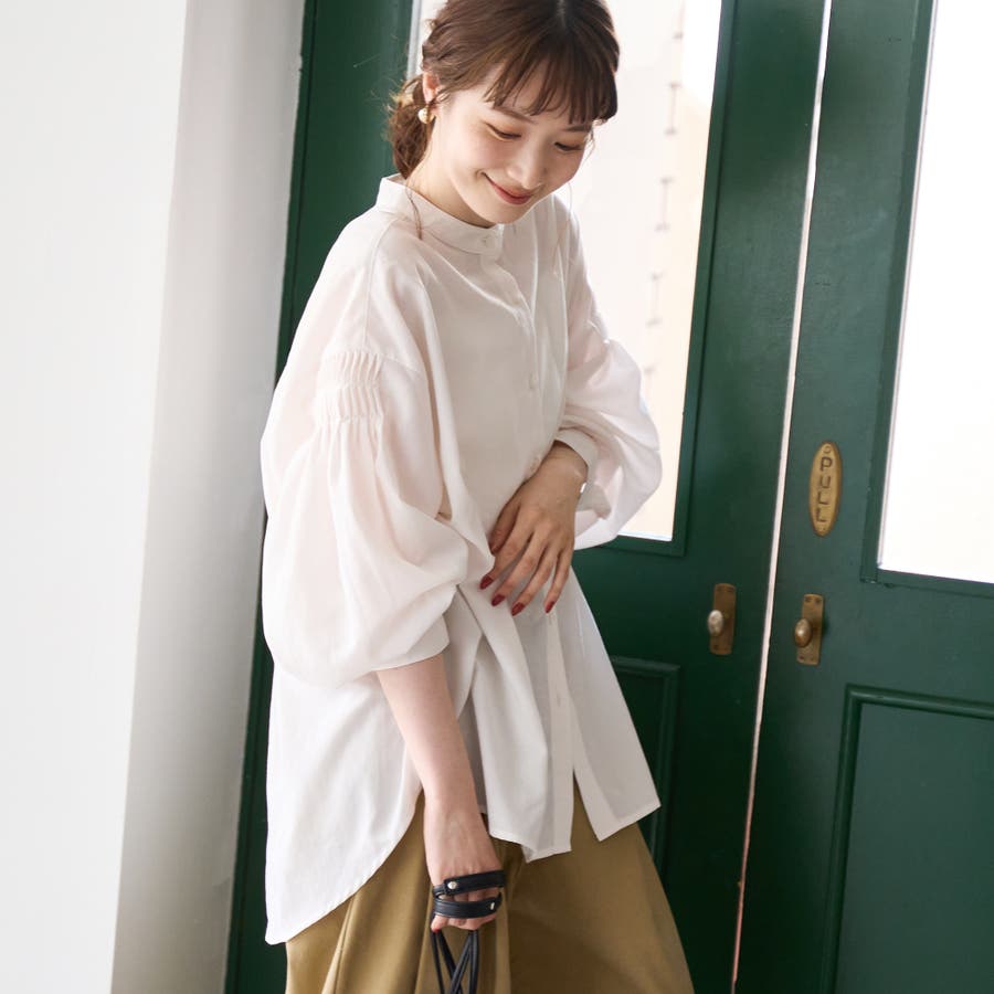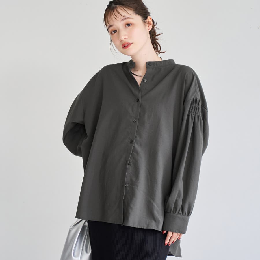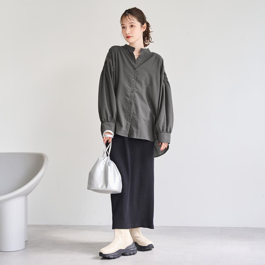 顔まわりをすっきり魅せてくれるバンドカラーに、ゆったりとしたシルエットでリラックス感もプラスしました。