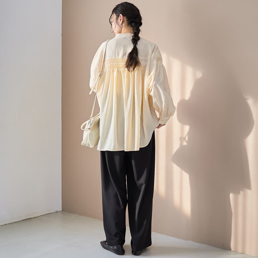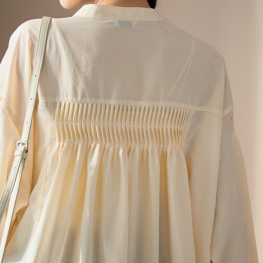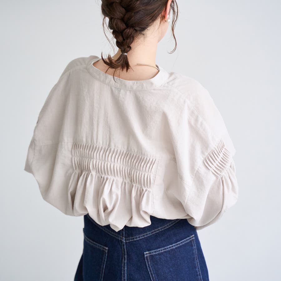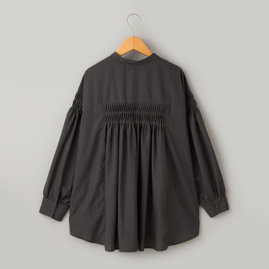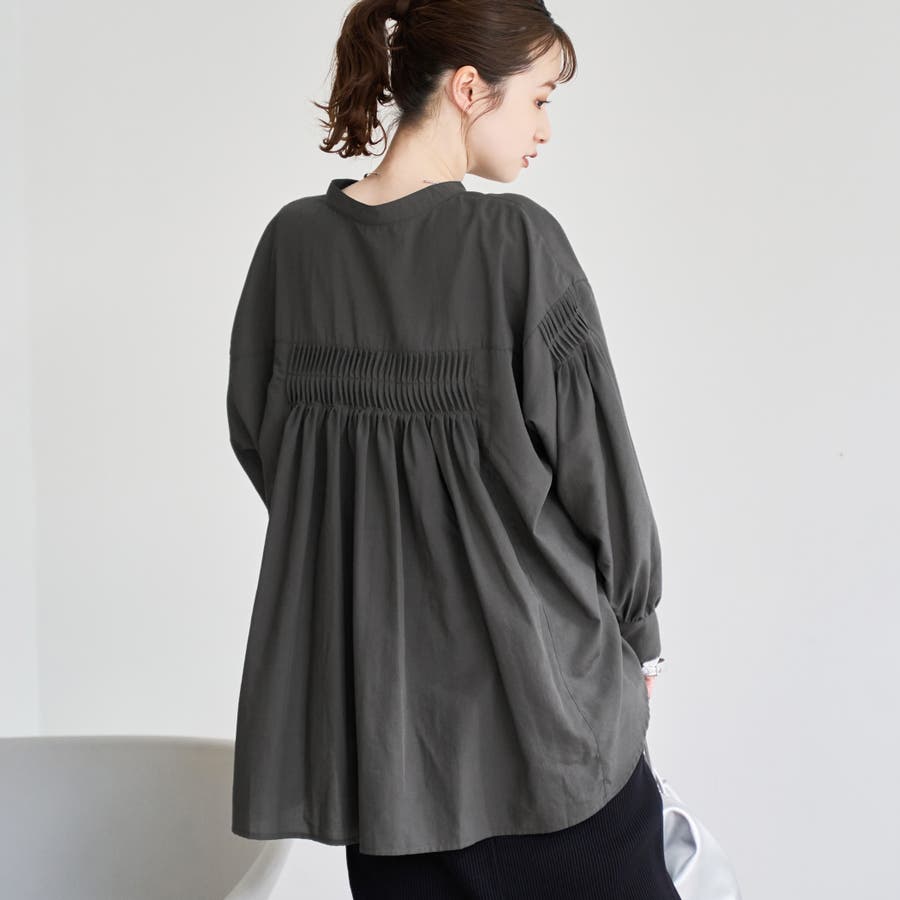 後ろヨーク下や腕まわりに贅沢な変形ピンタックを施した、存在感のあるバンドカラーブラウス。