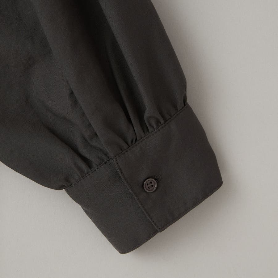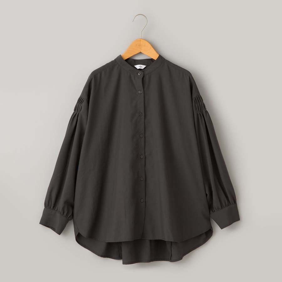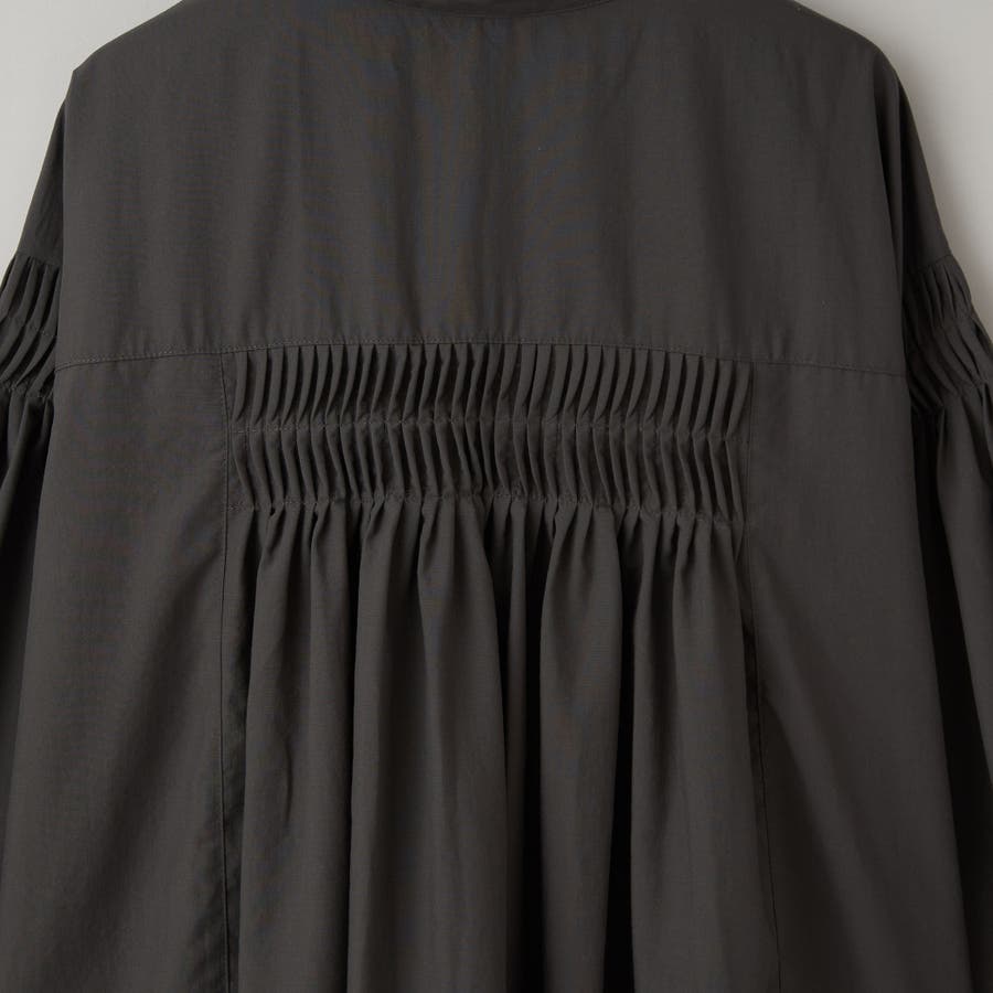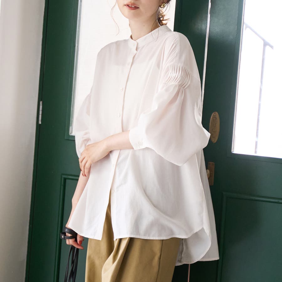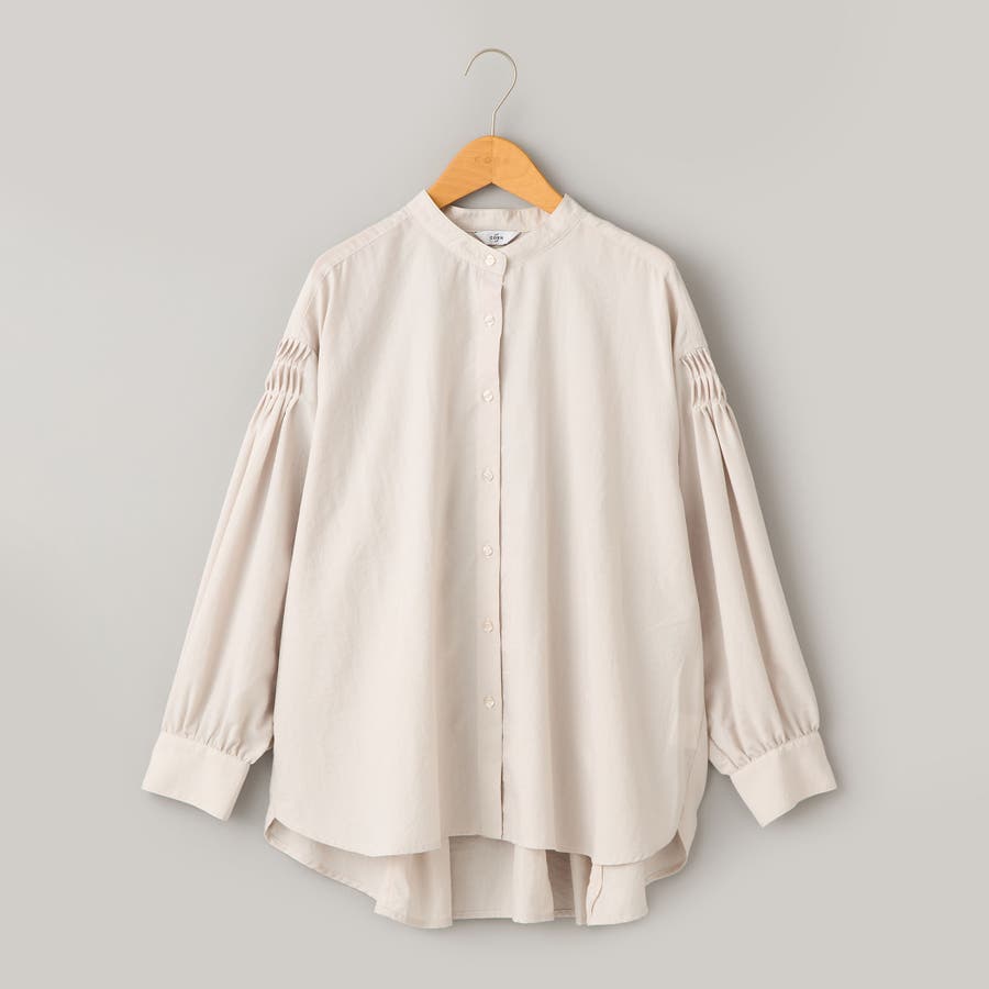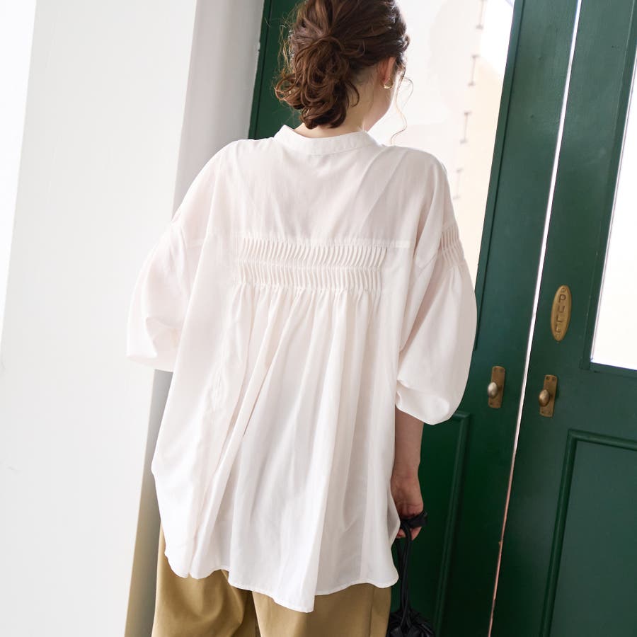 後ろヨーク下や腕まわりに贅沢な変形ピンタックを施した、存在感のあるバンドカラーブラウス。