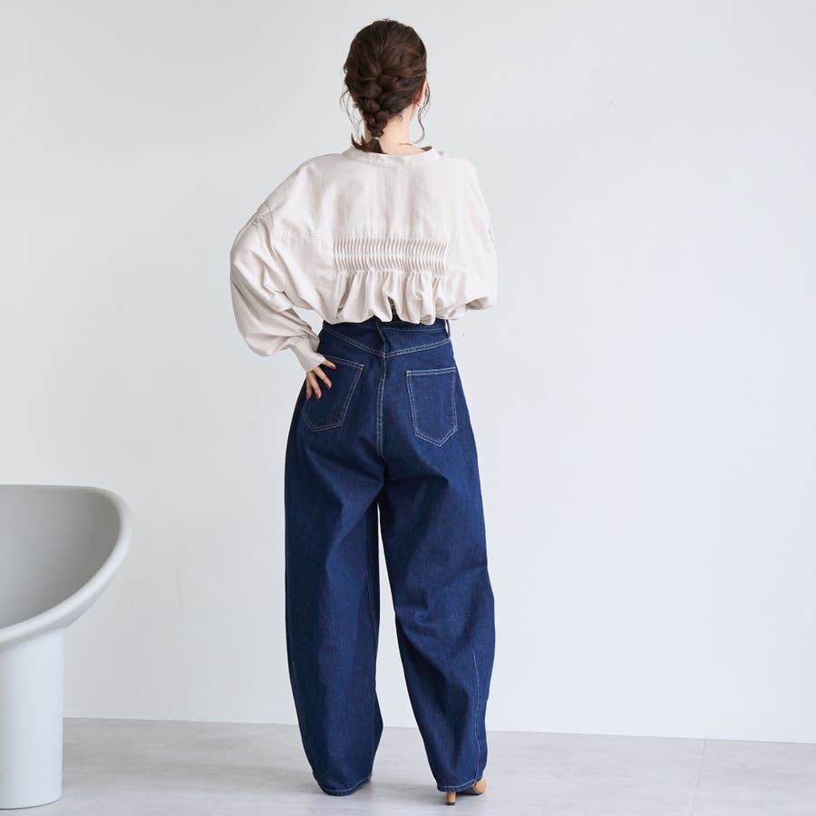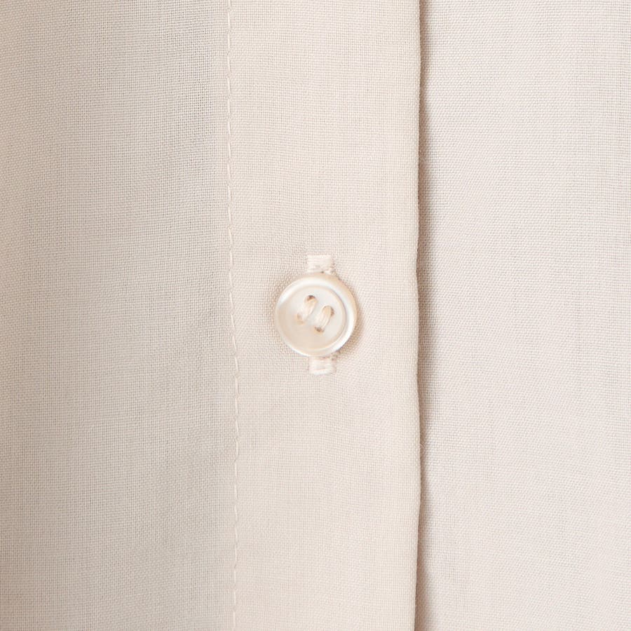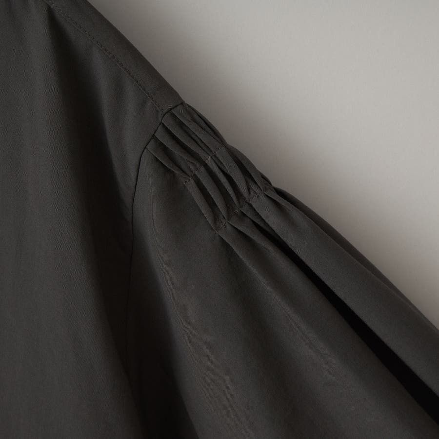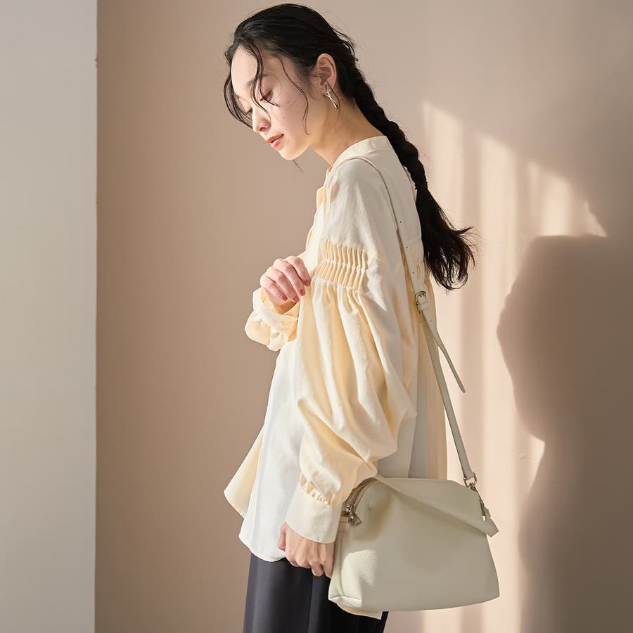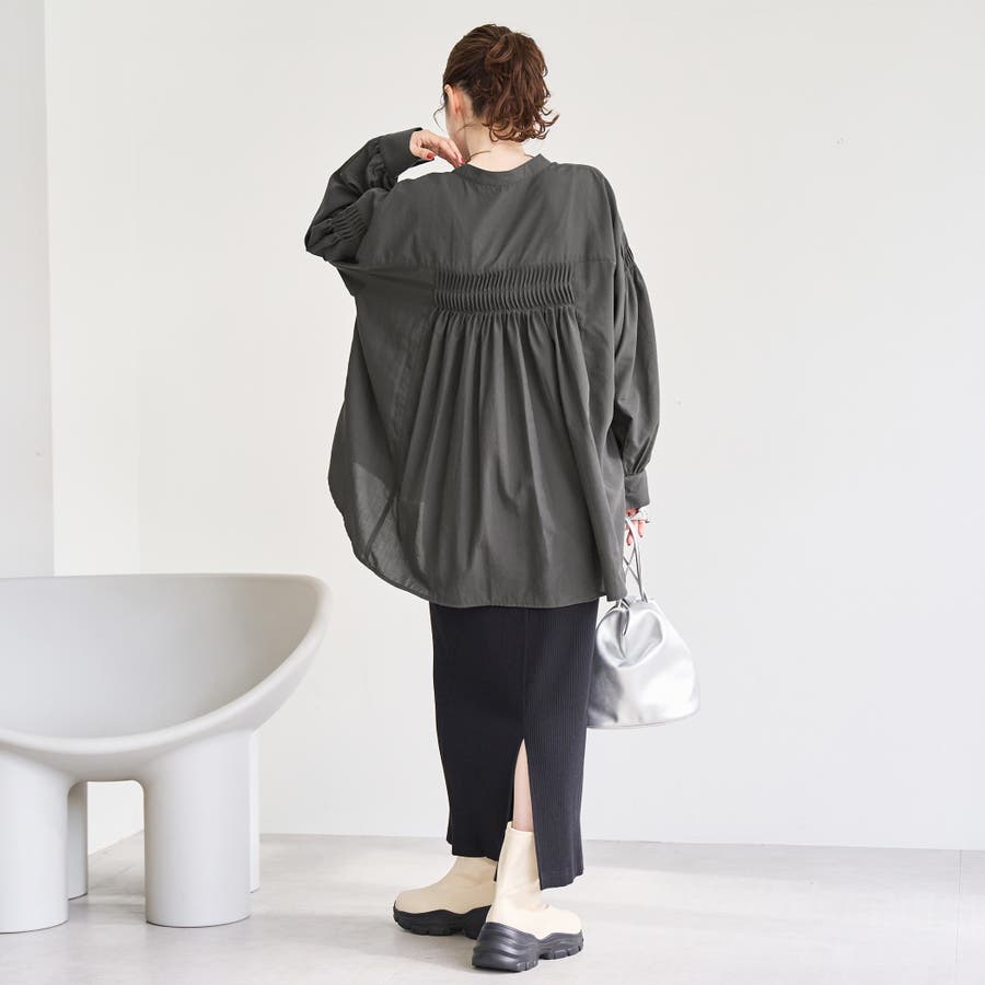 後ろヨーク下や腕まわりに贅沢な変形ピンタックを施した、存在感のあるバンドカラーブラウス。