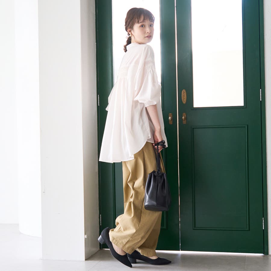 素材感:シアーシャツに近い、やわらかな生地感。軽やかさがあり、後ろ姿もピンタックのデザインで可愛く見えると思いました。