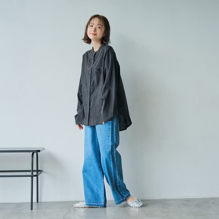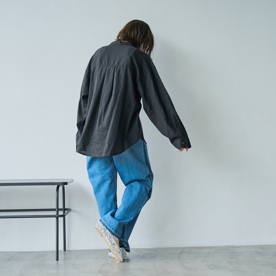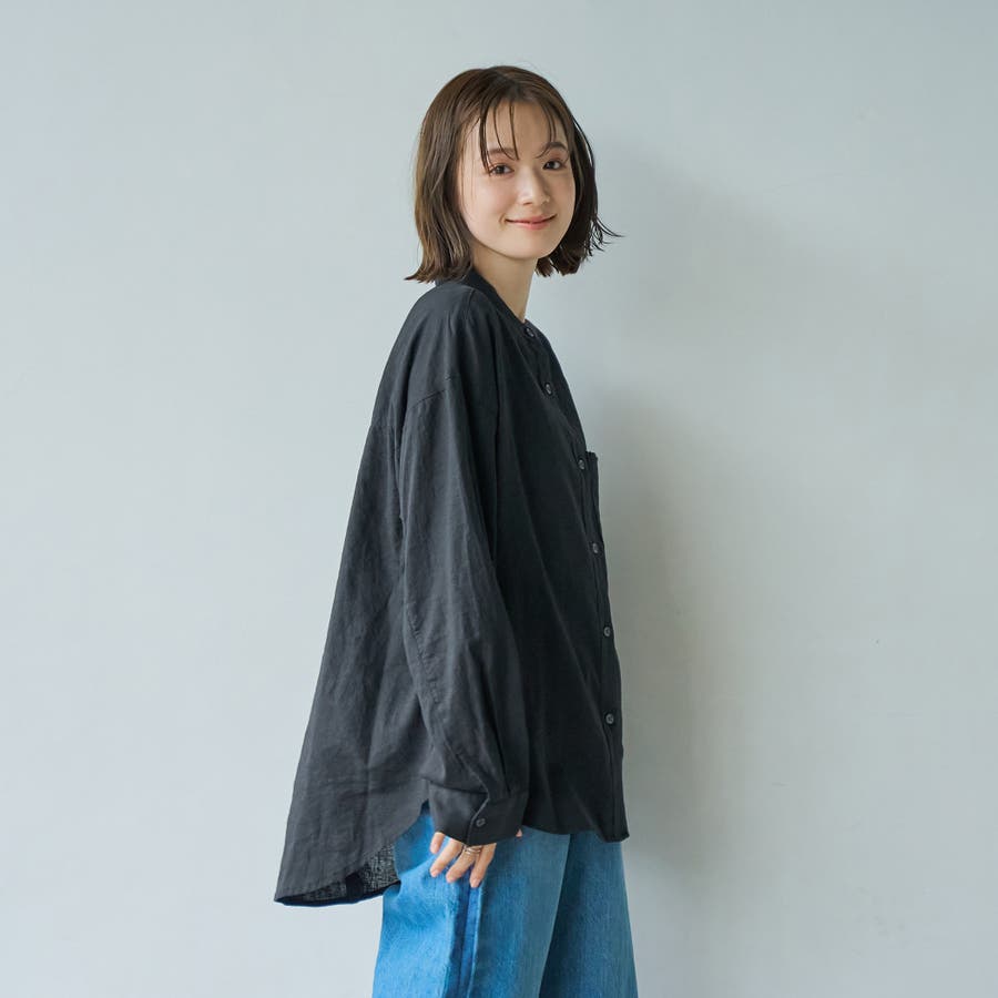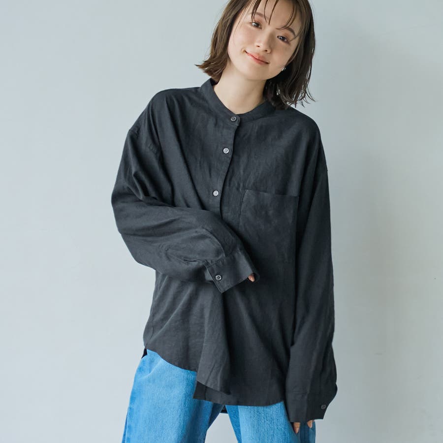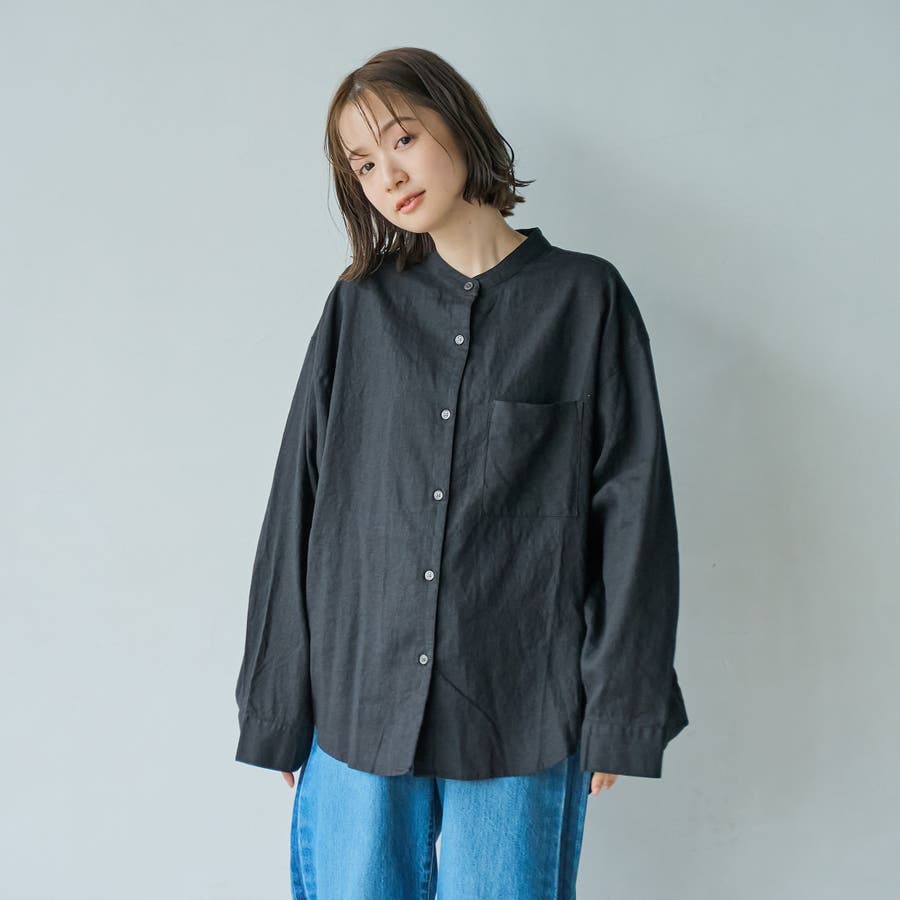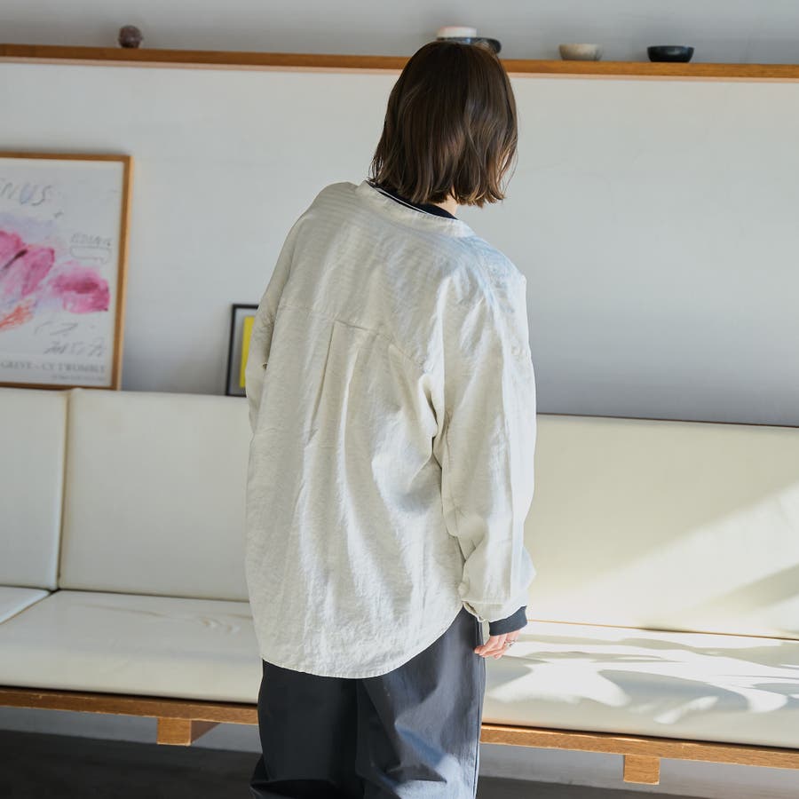カジュアルスタイルにバンドカラーできちんと感もありながらゆったりとした抜け感のあるバンドカラーの長袖シャツ。