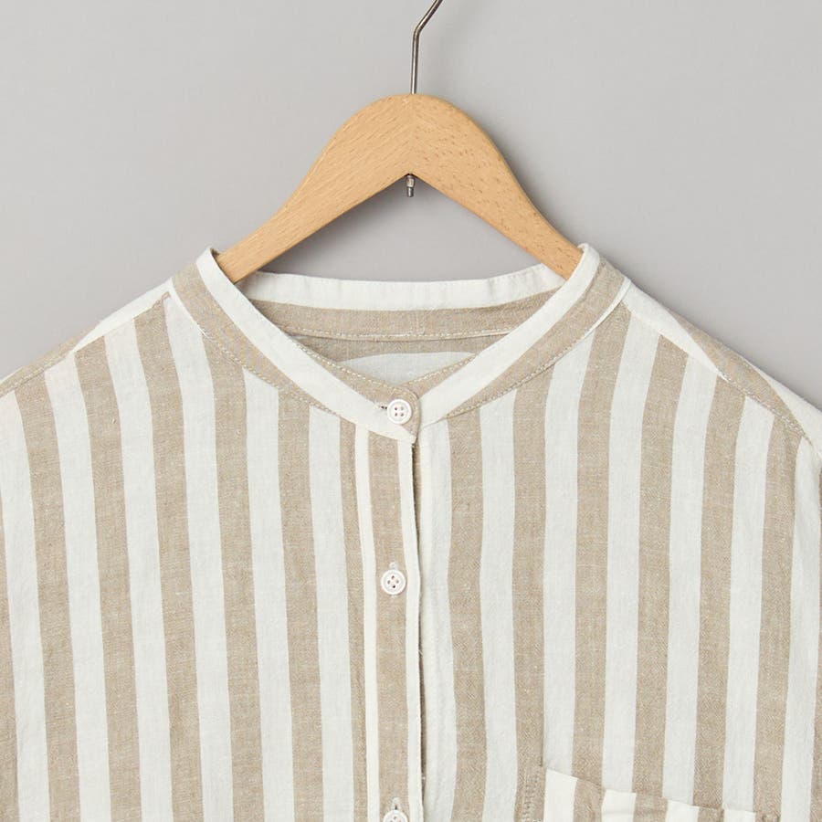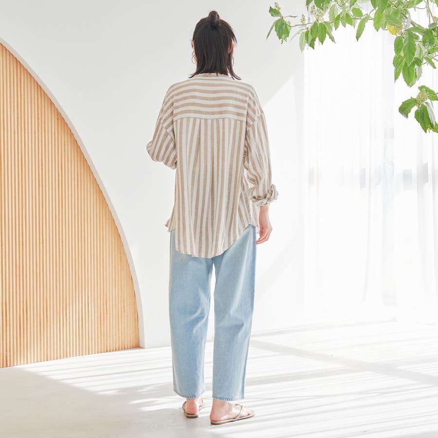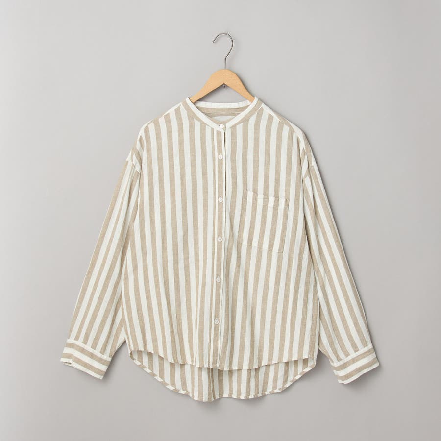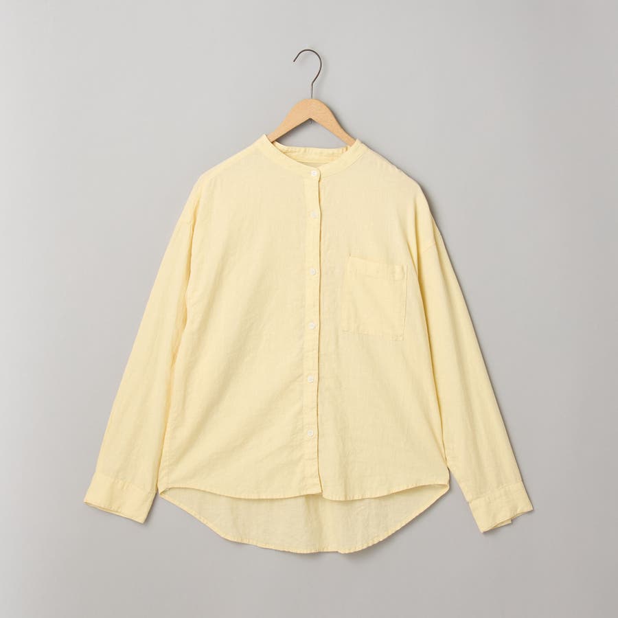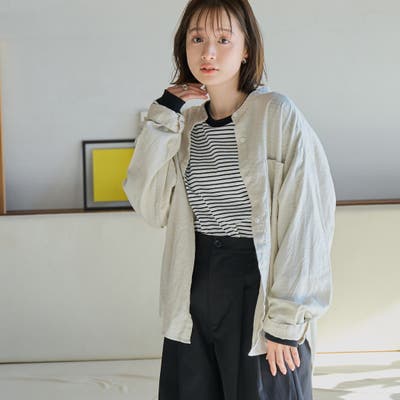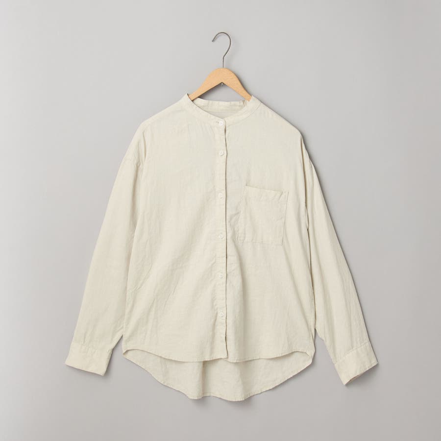 カジュアルスタイルにバンドカラーできちんと感もありながらゆったりとした抜け感のあるバンドカラーの長袖シャツ。