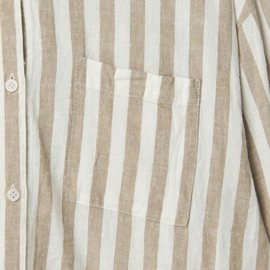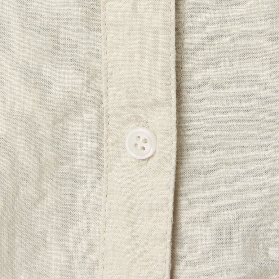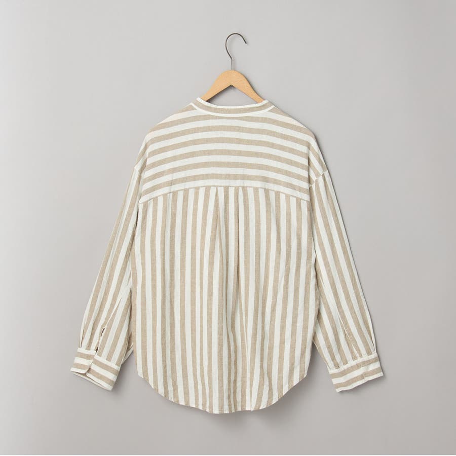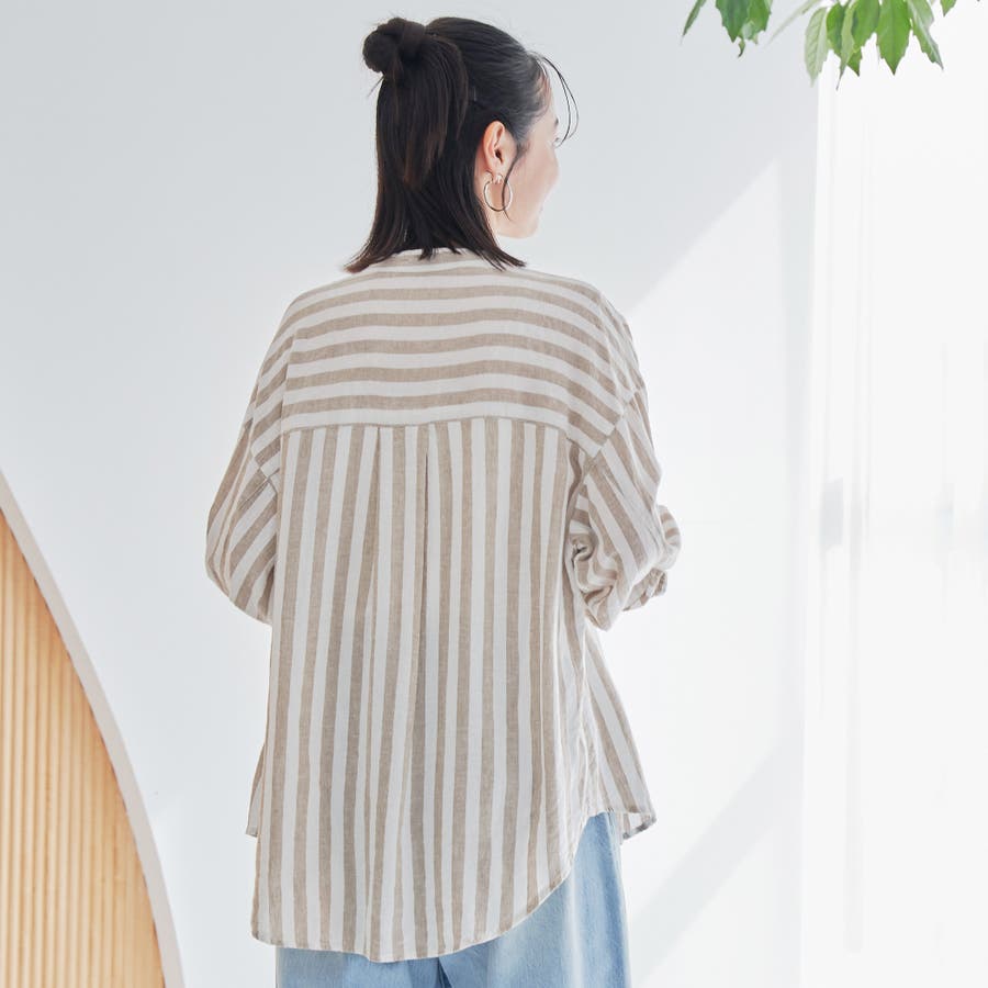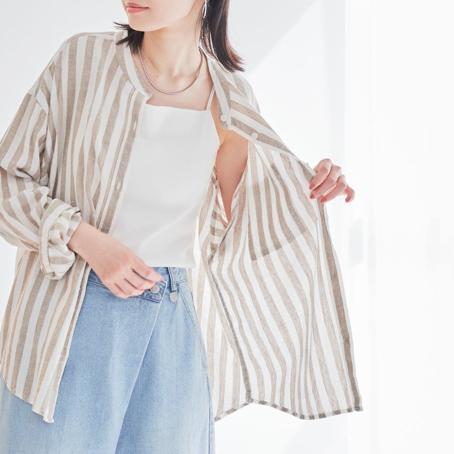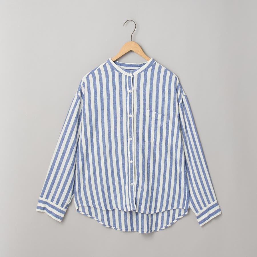 カジュアルスタイルにバンドカラーできちんと感もありながらゆったりとした抜け感のあるバンドカラーの長袖シャツ。