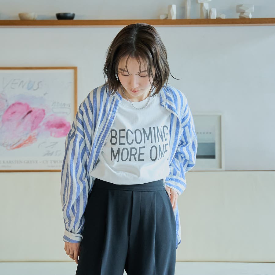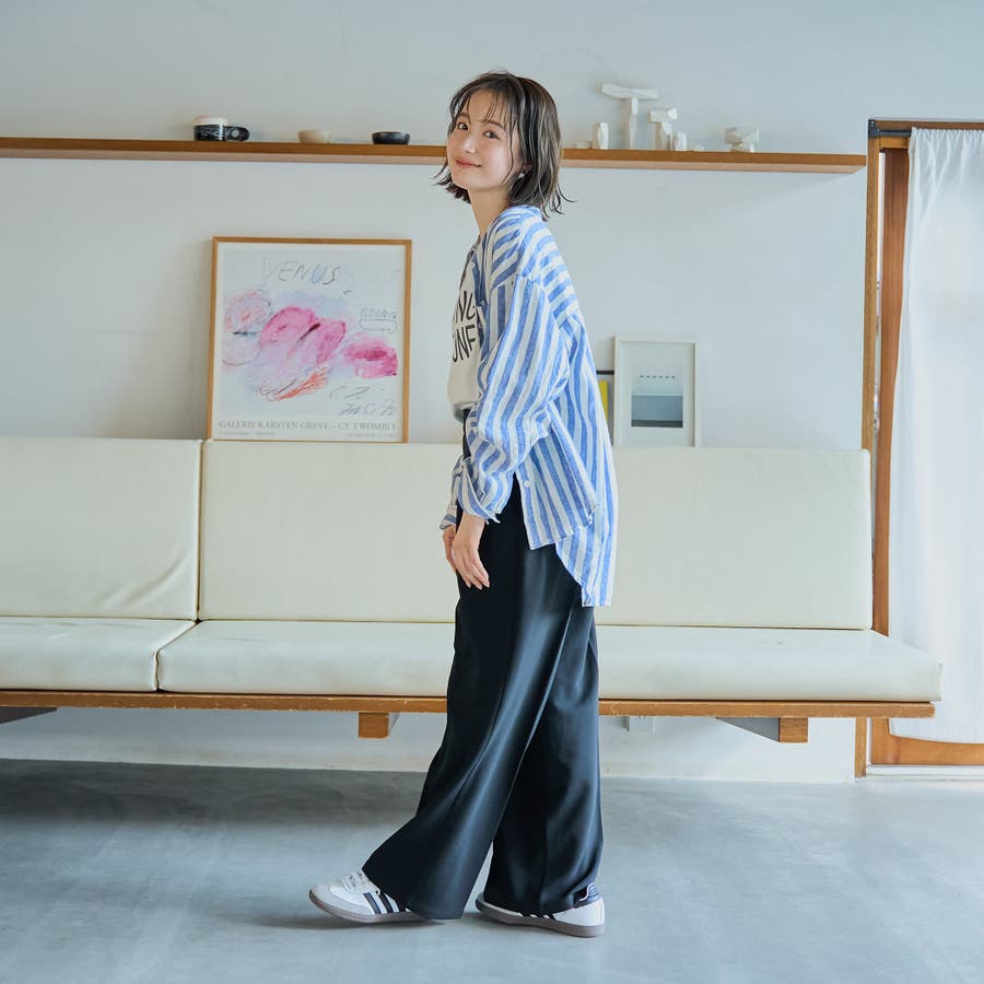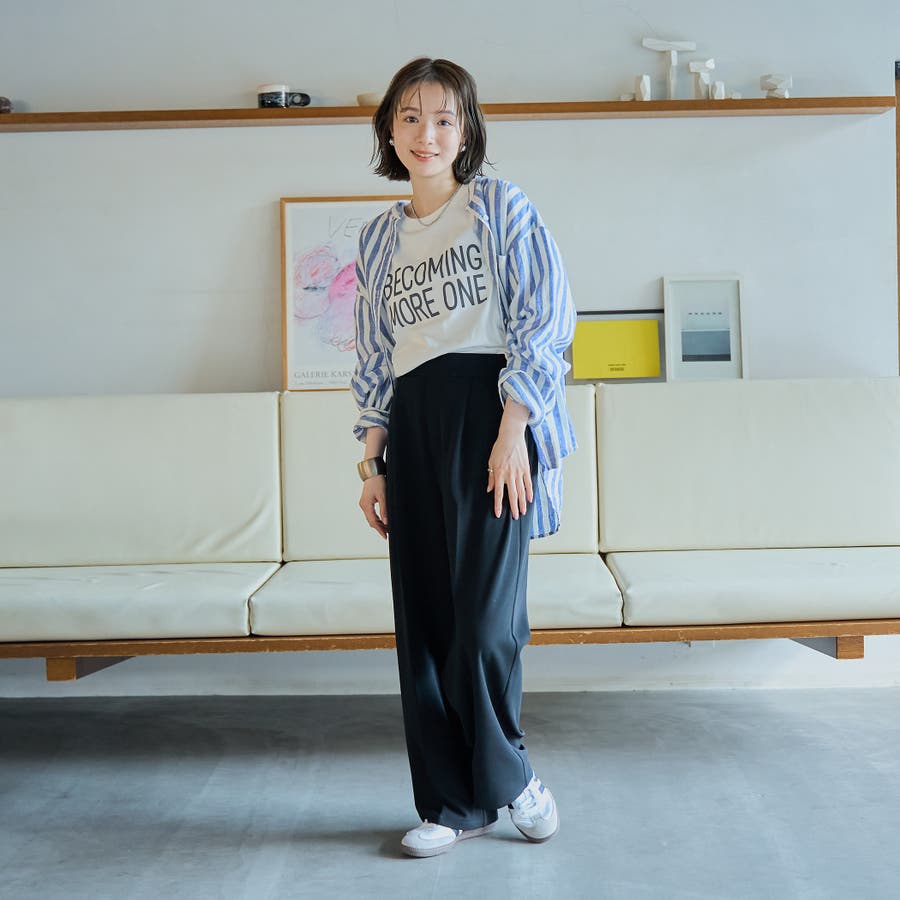 チノパンツやデニム、イージーパンツなどを合わせたカジュアルコーデはもちろん、ワイドなスクエアシルエットなのでナロースカートで女性らしく着るのもおすすめです。