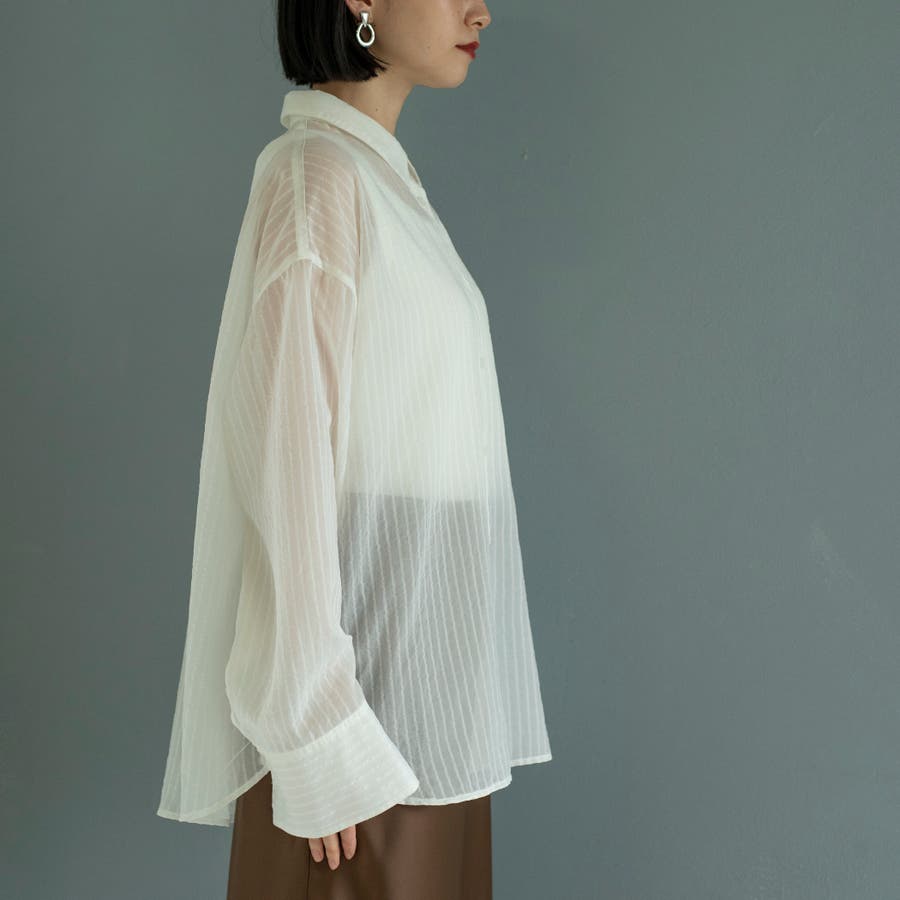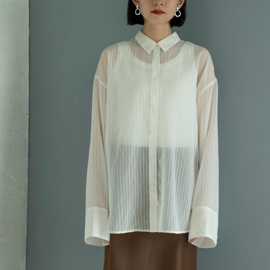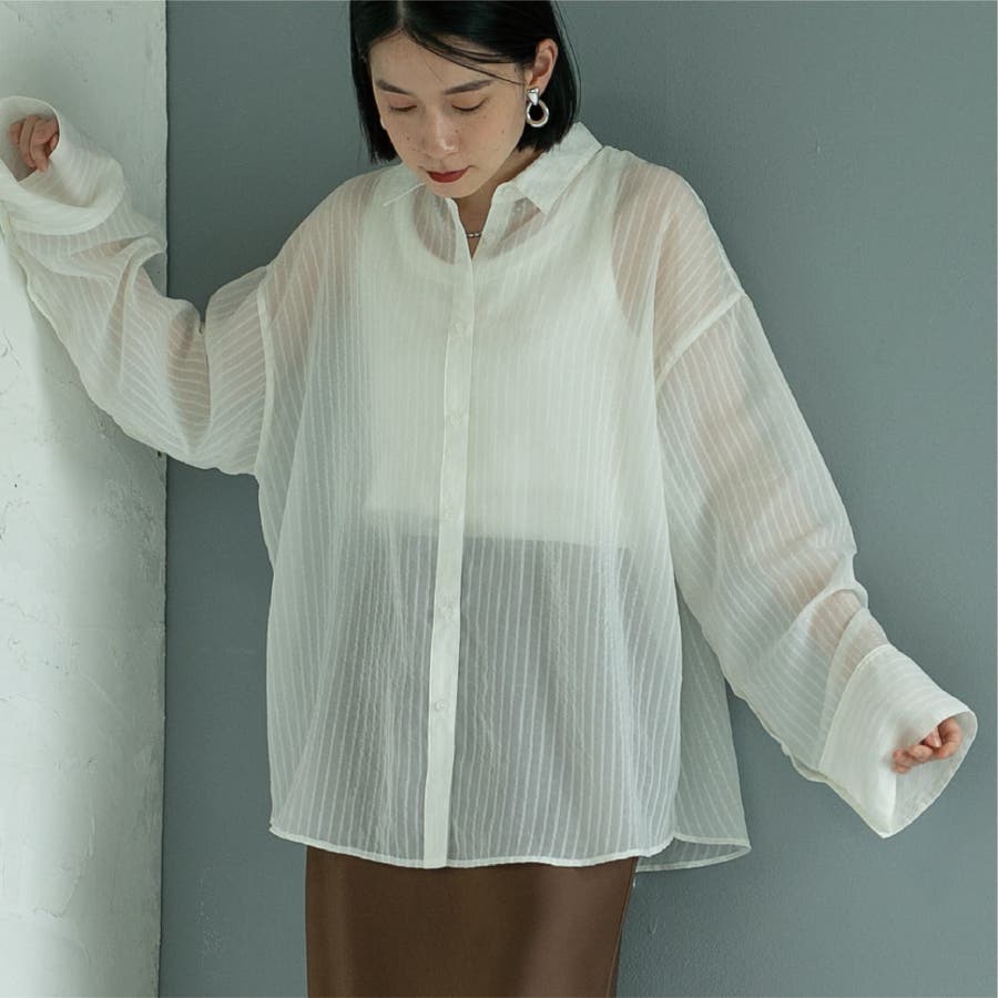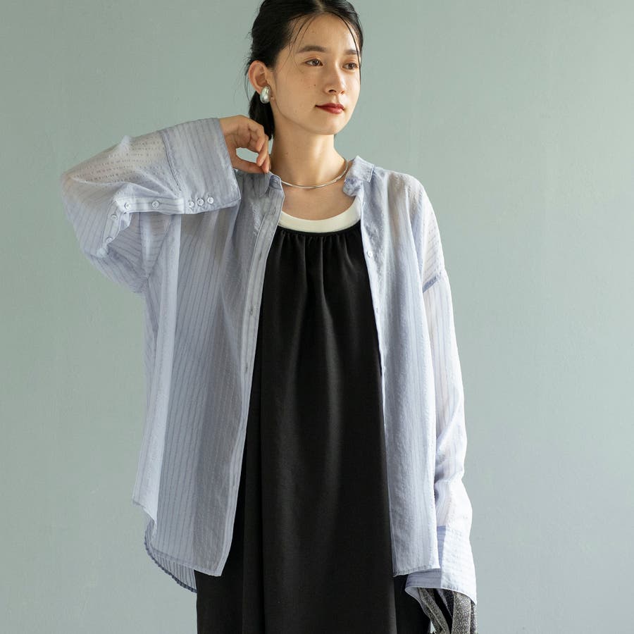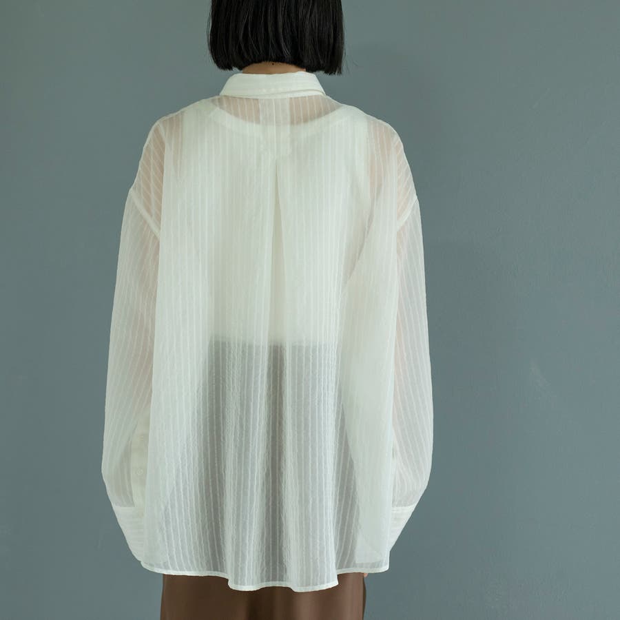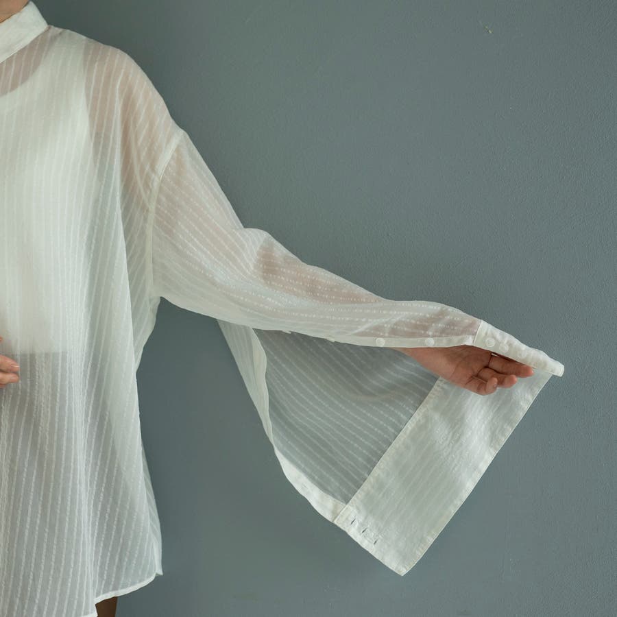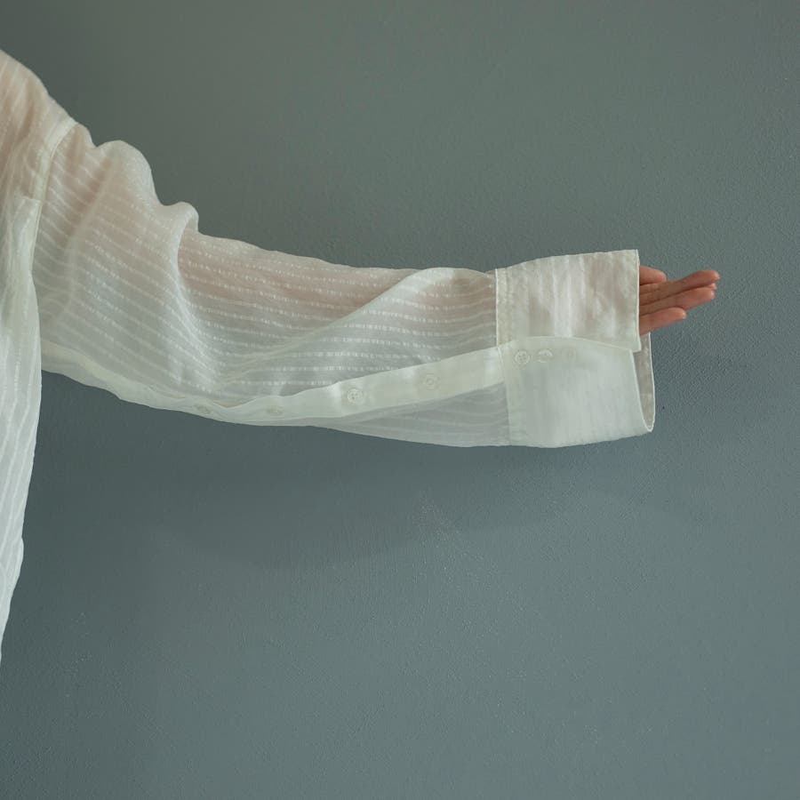 独特のシアー素材の抜け感が楽しめるシャドーストライプシャツは、アクセントとして、袖部分のスリットを肘あたりまで深く設定。