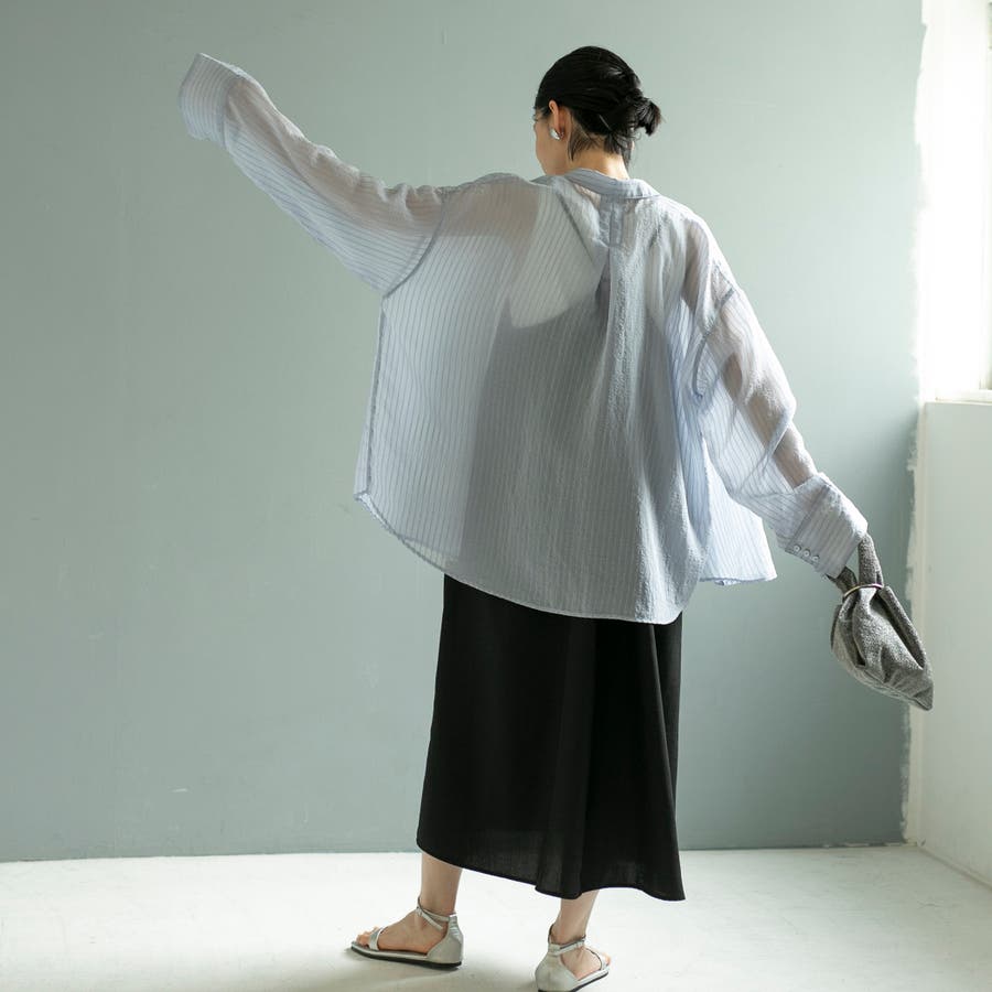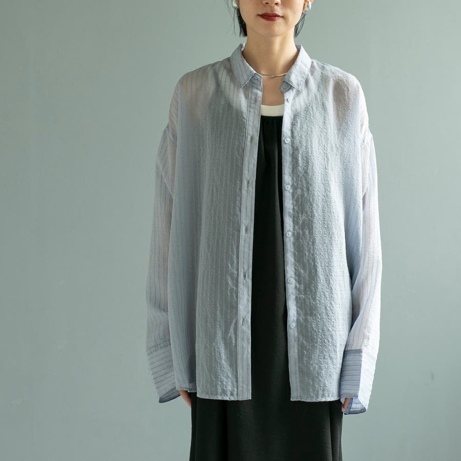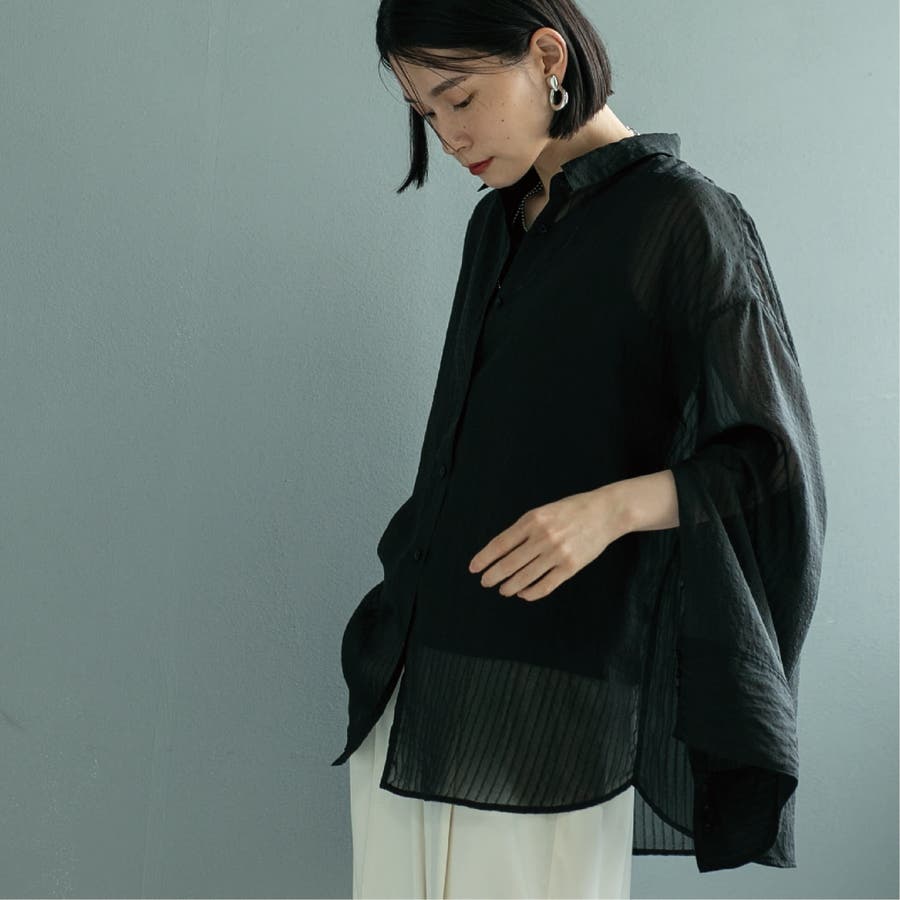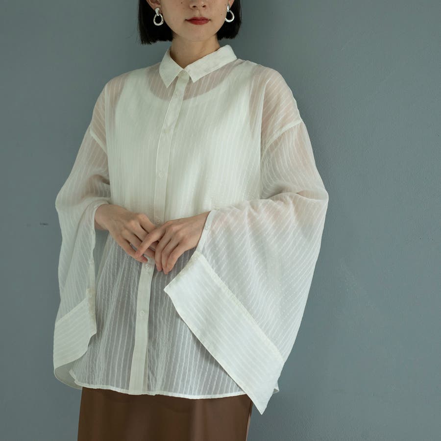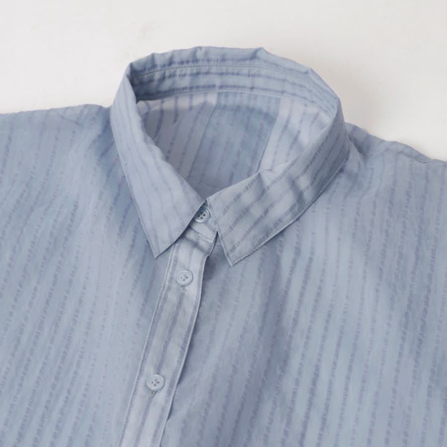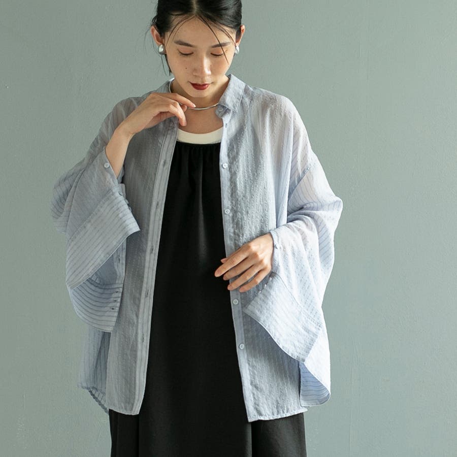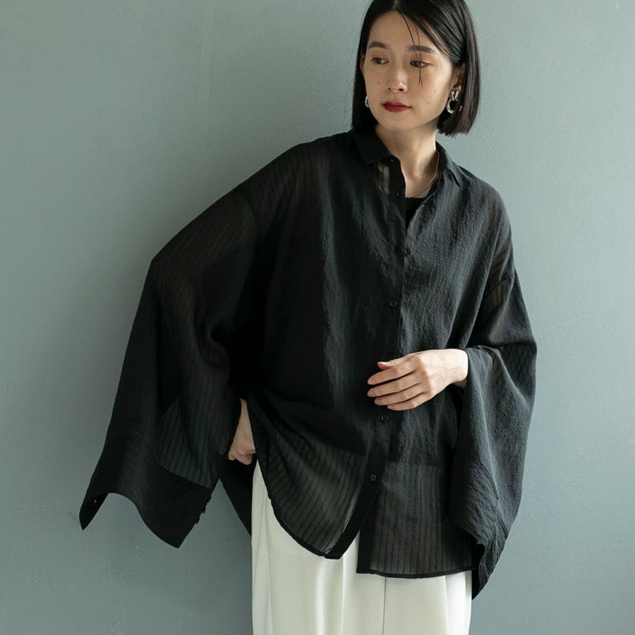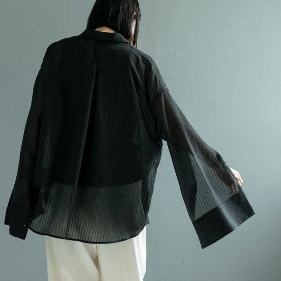 独特のシアー素材の抜け感が楽しめるシャドーストライプシャツは、アクセントとして、袖部分のスリットを肘あたりまで深く設定。