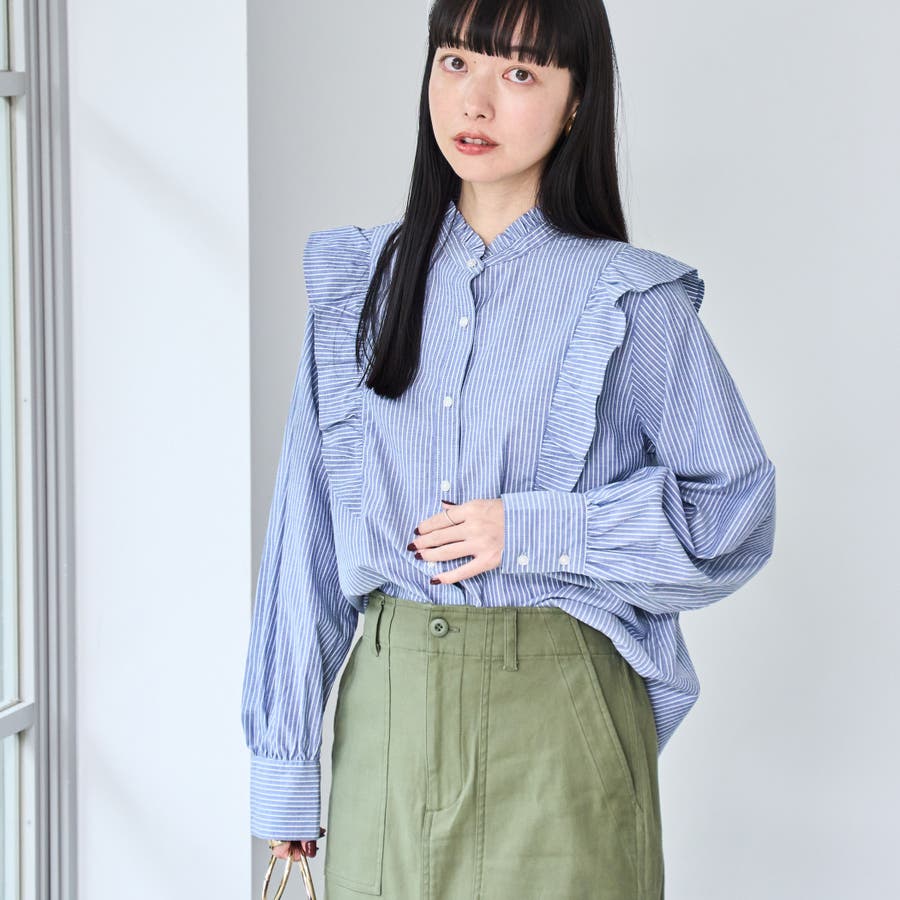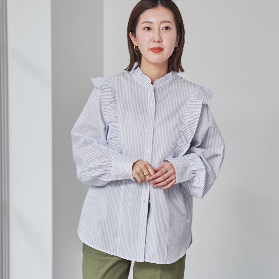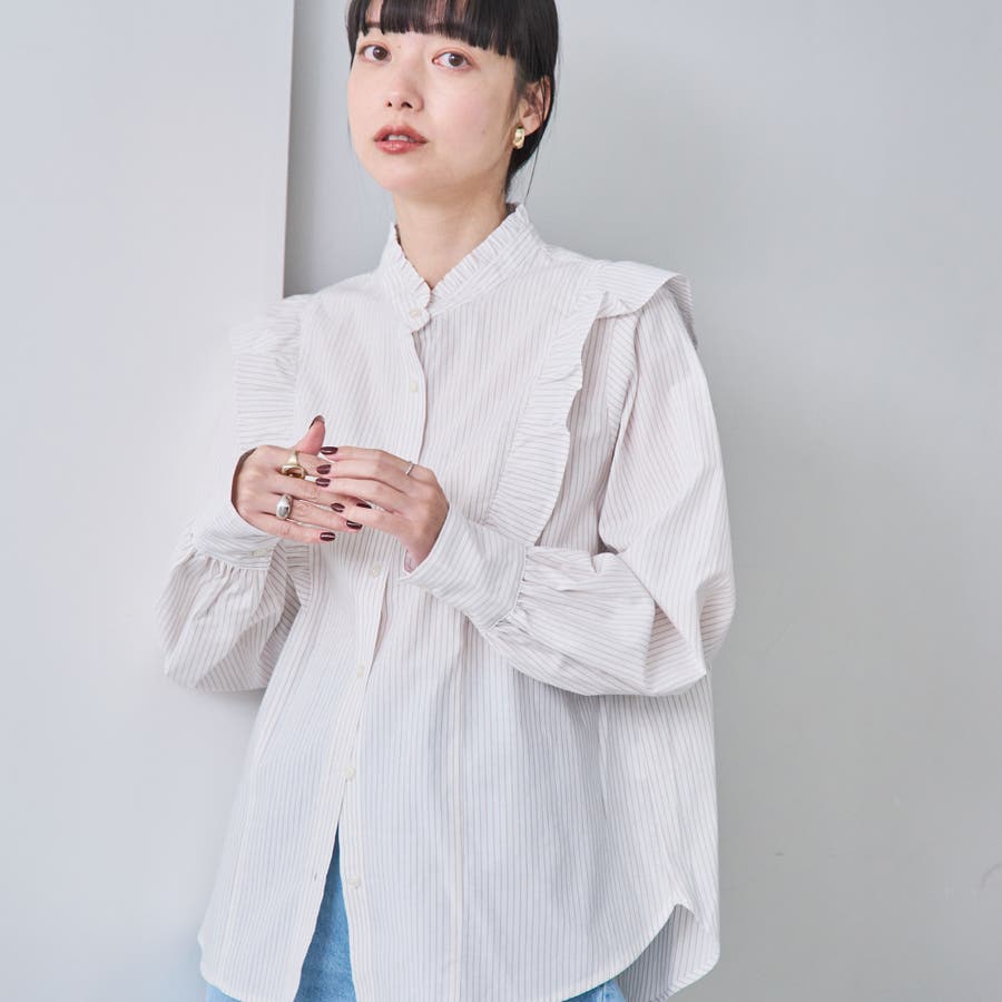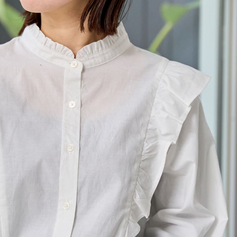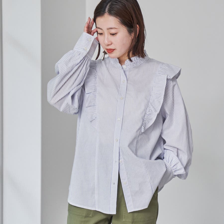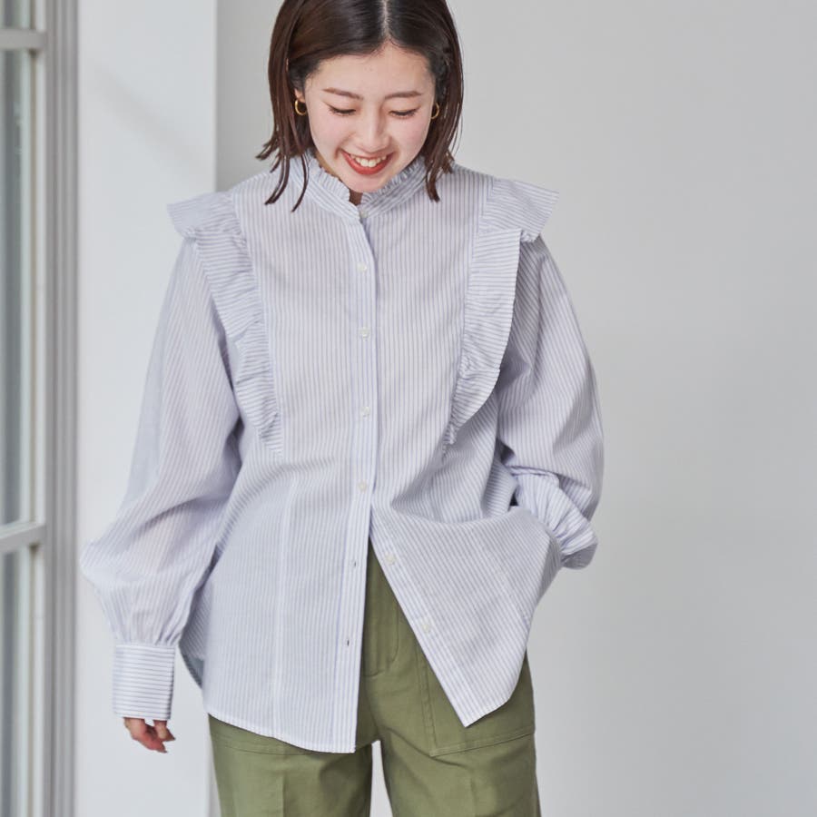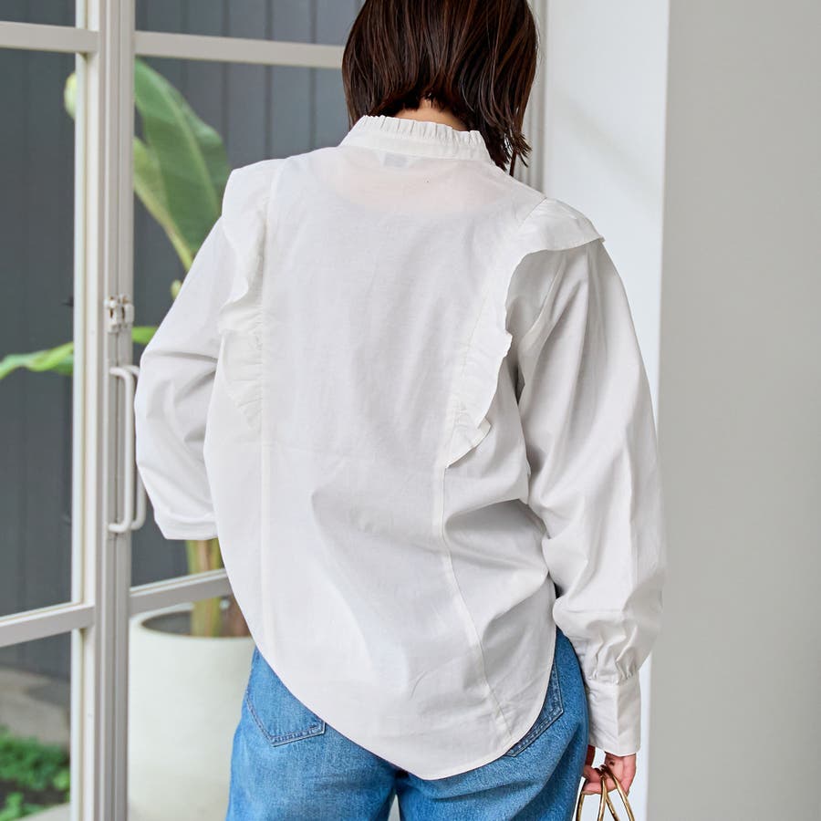 フリル仕様のバンドカラーがポイントのシャツブラウス。