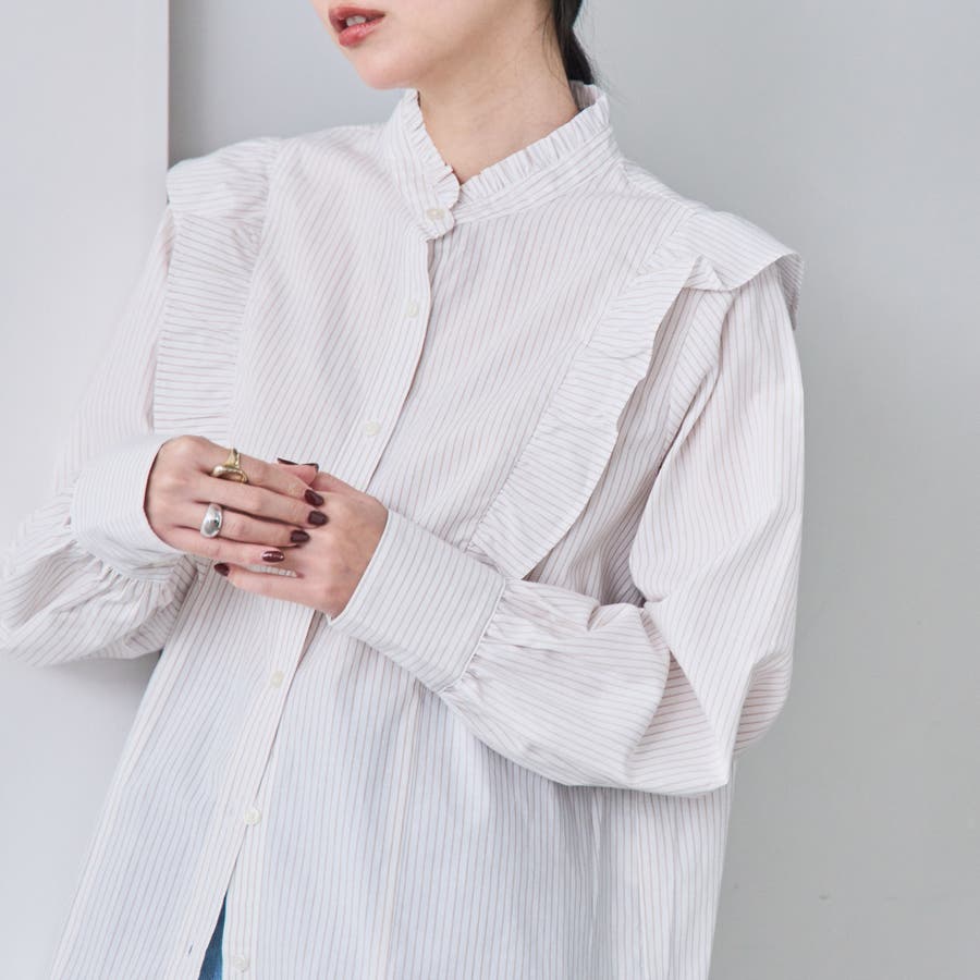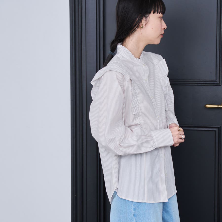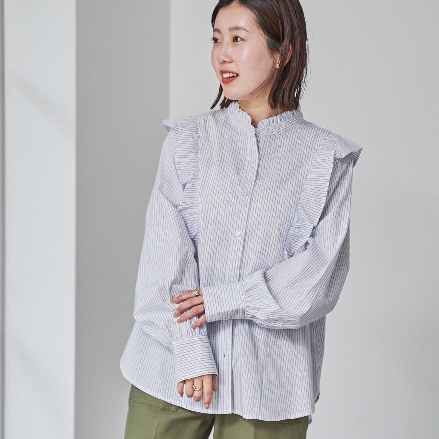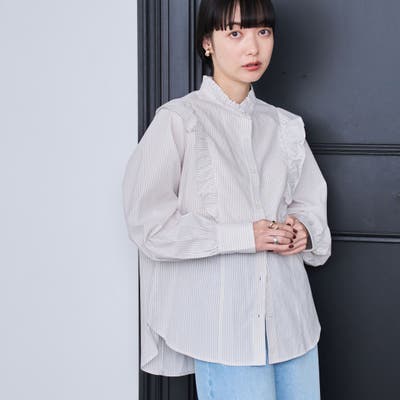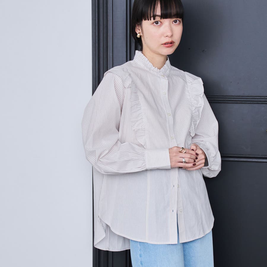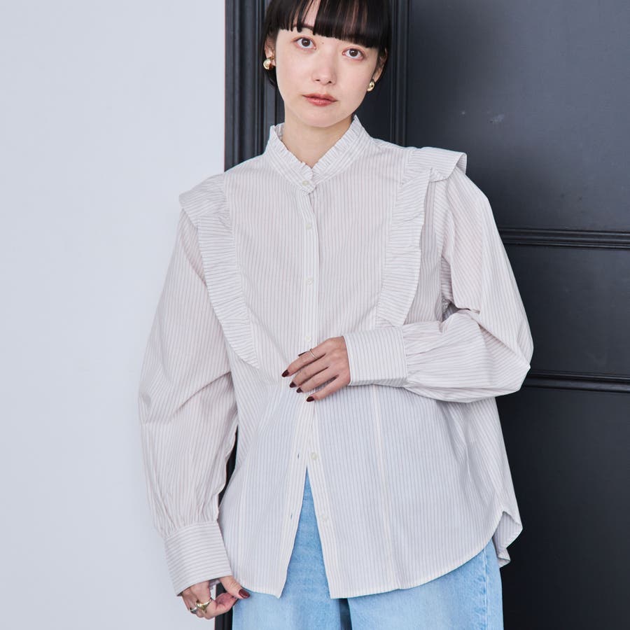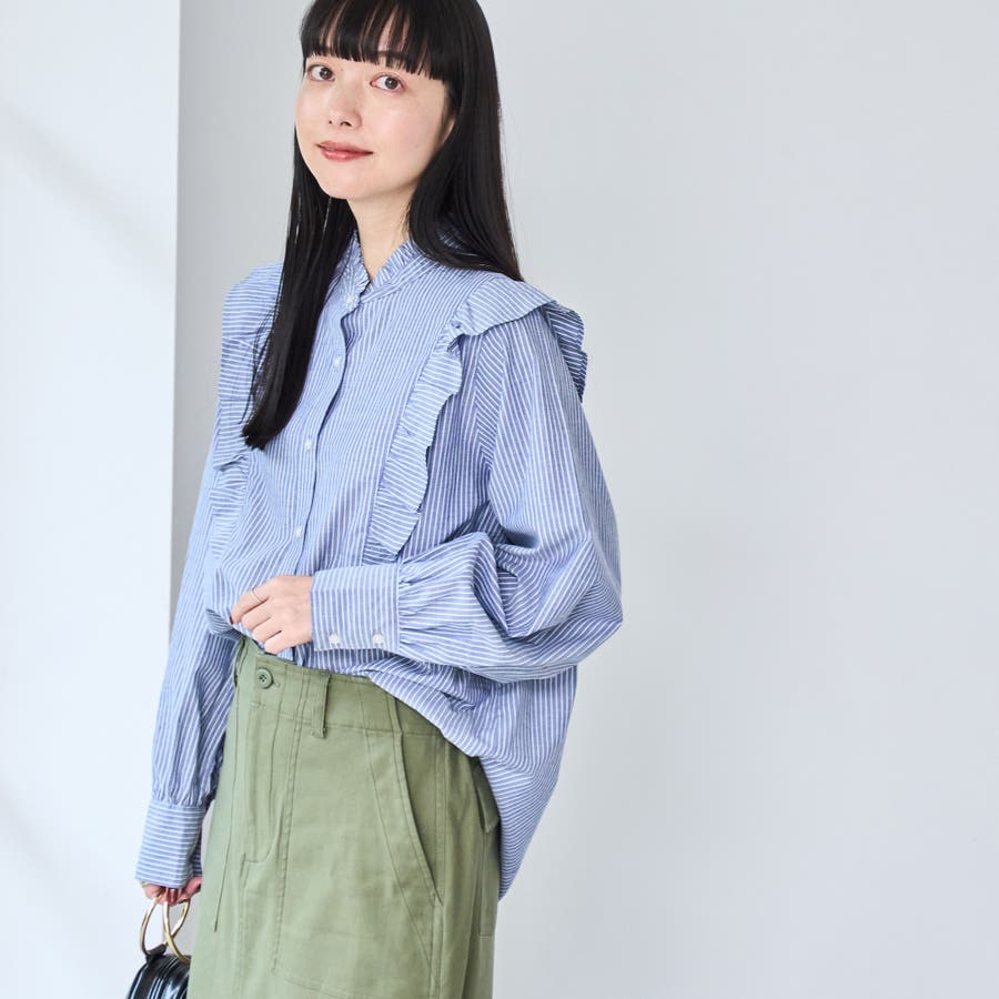 フリル仕様のバンドカラーがポイントのシャツブラウス。