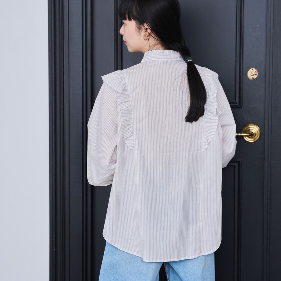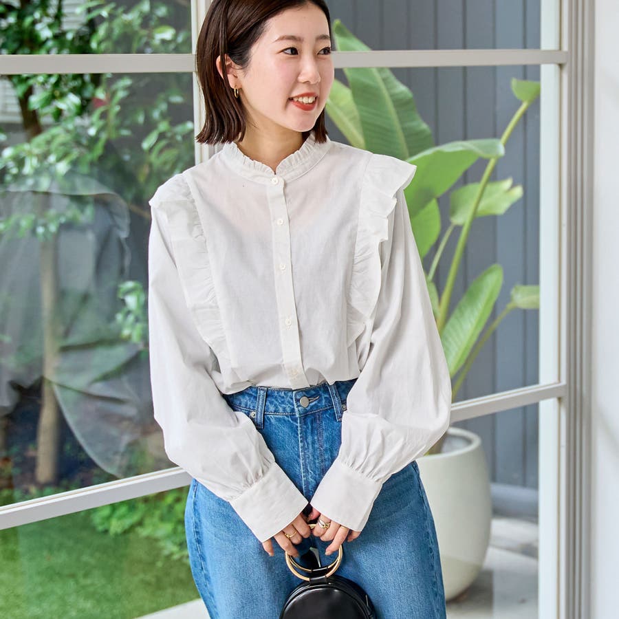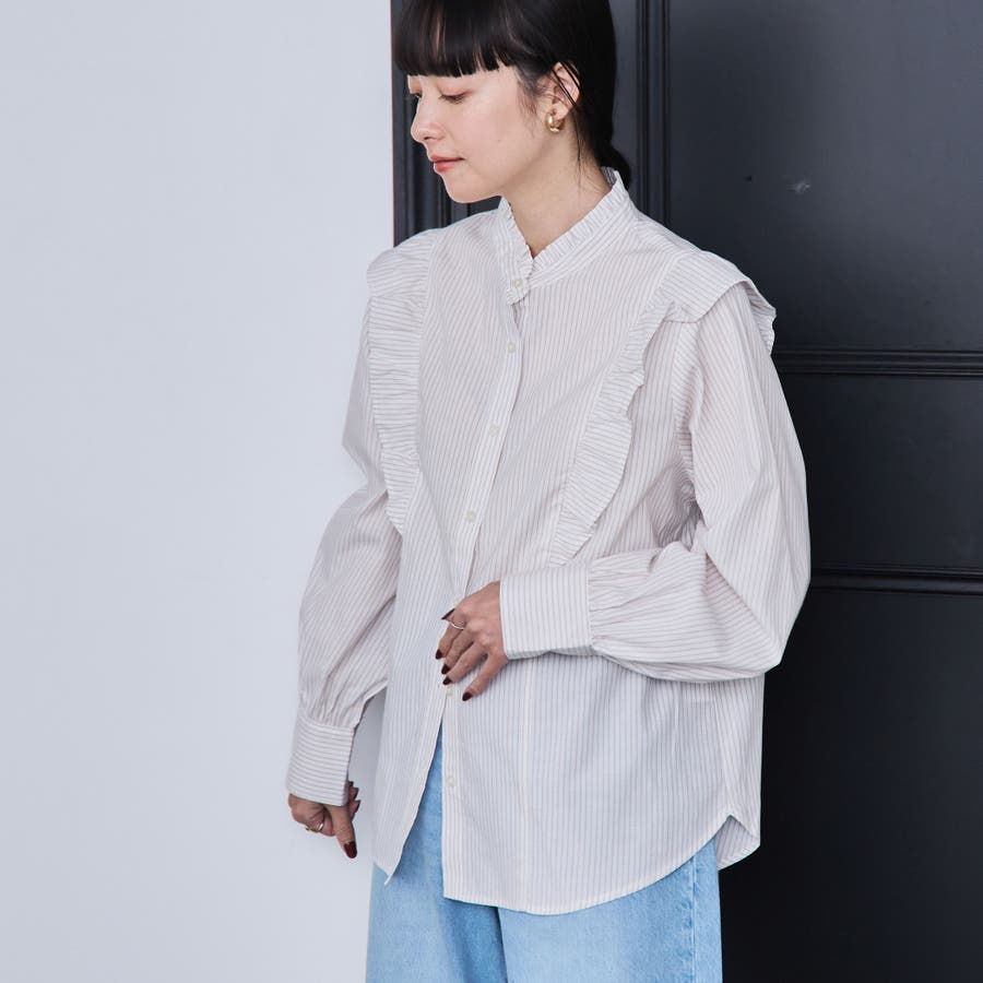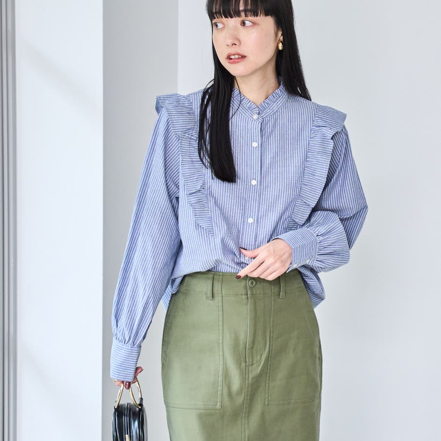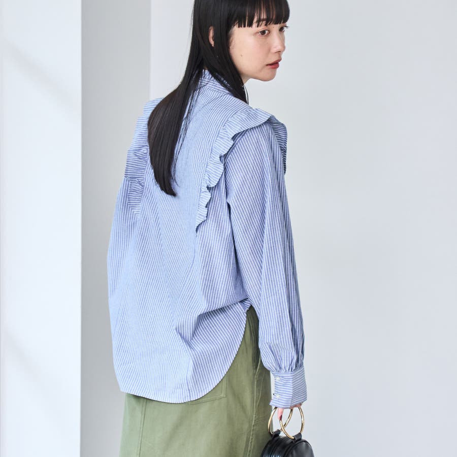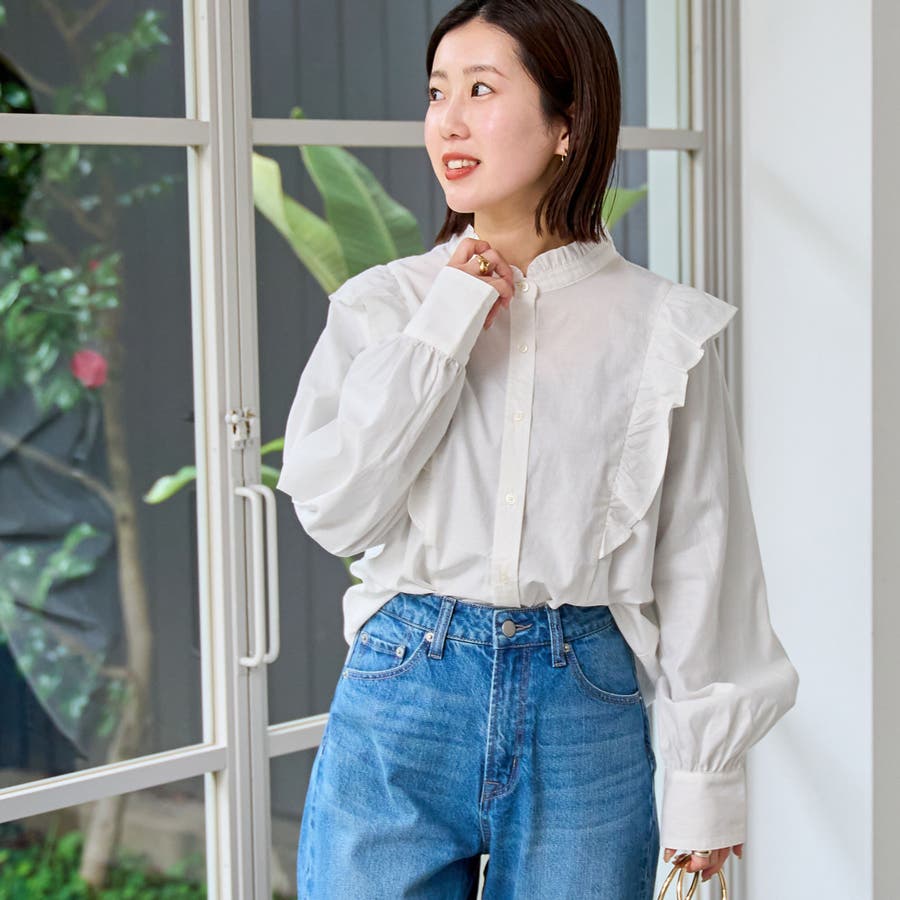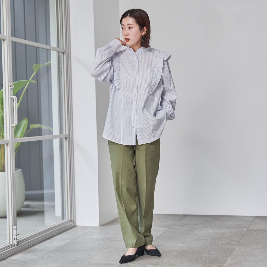 フリル仕様のバンドカラーがポイントのシャツブラウス。