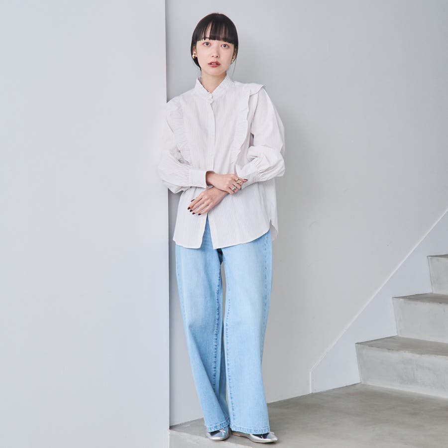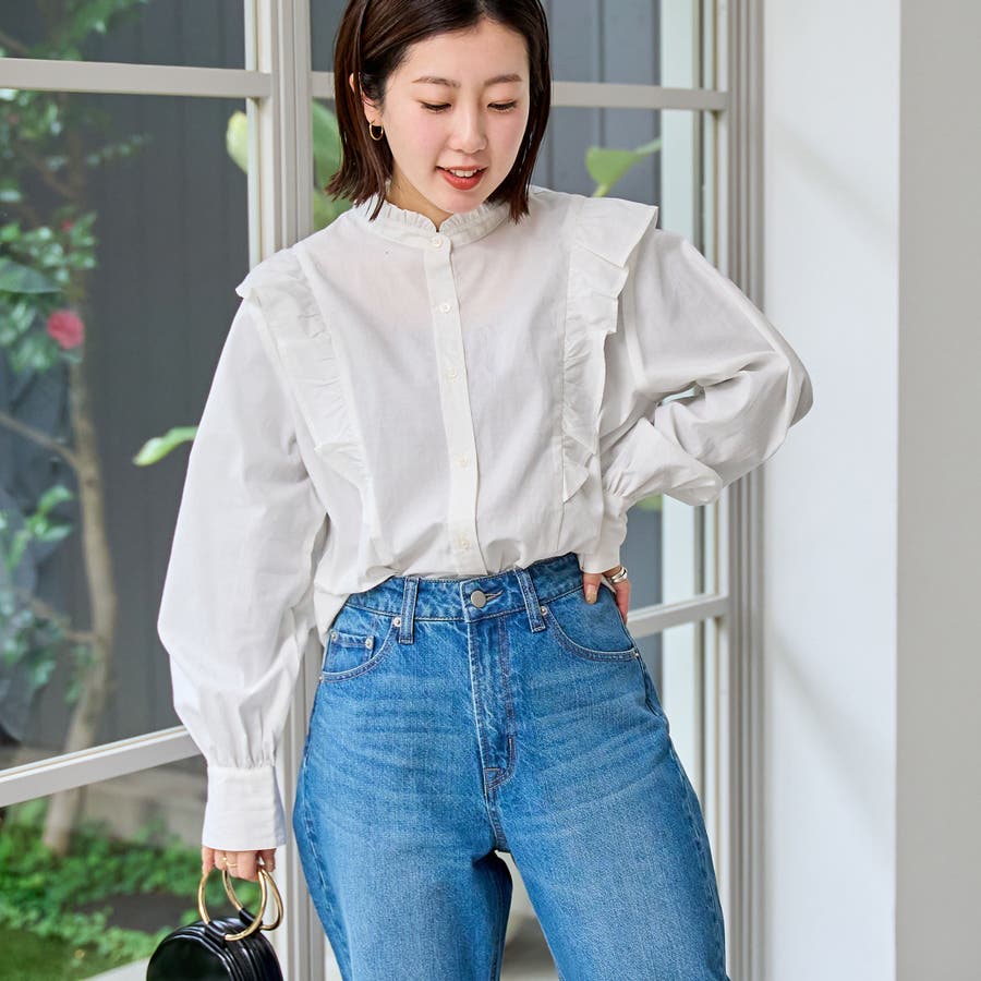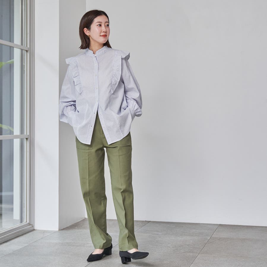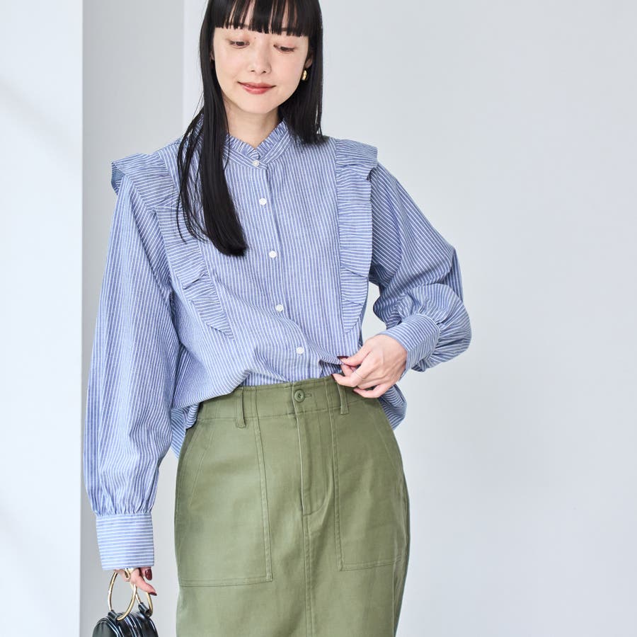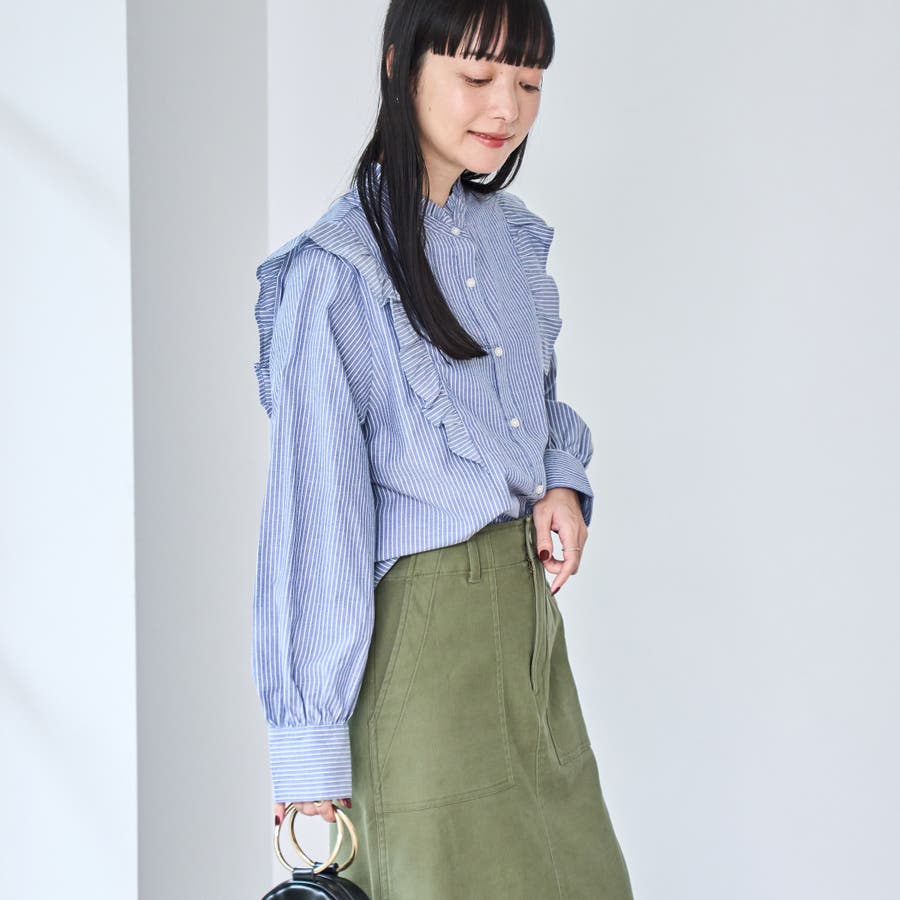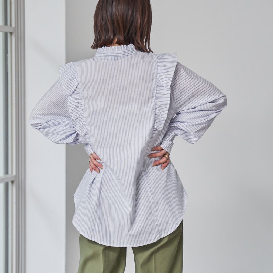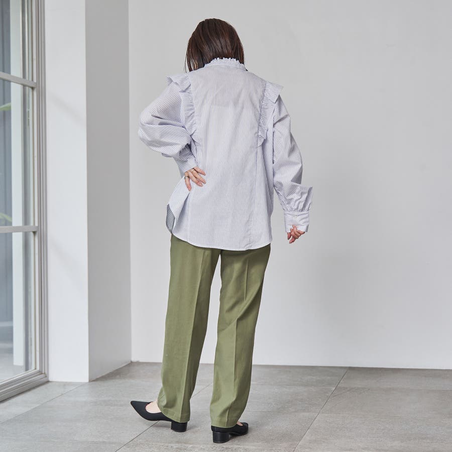 フリル仕様のバンドカラーがポイントのシャツブラウス。