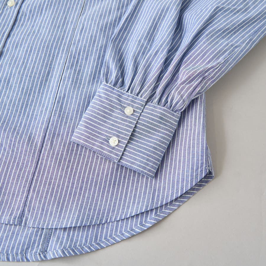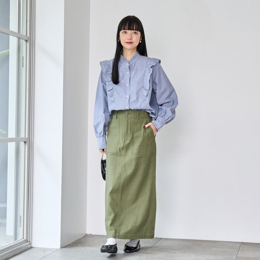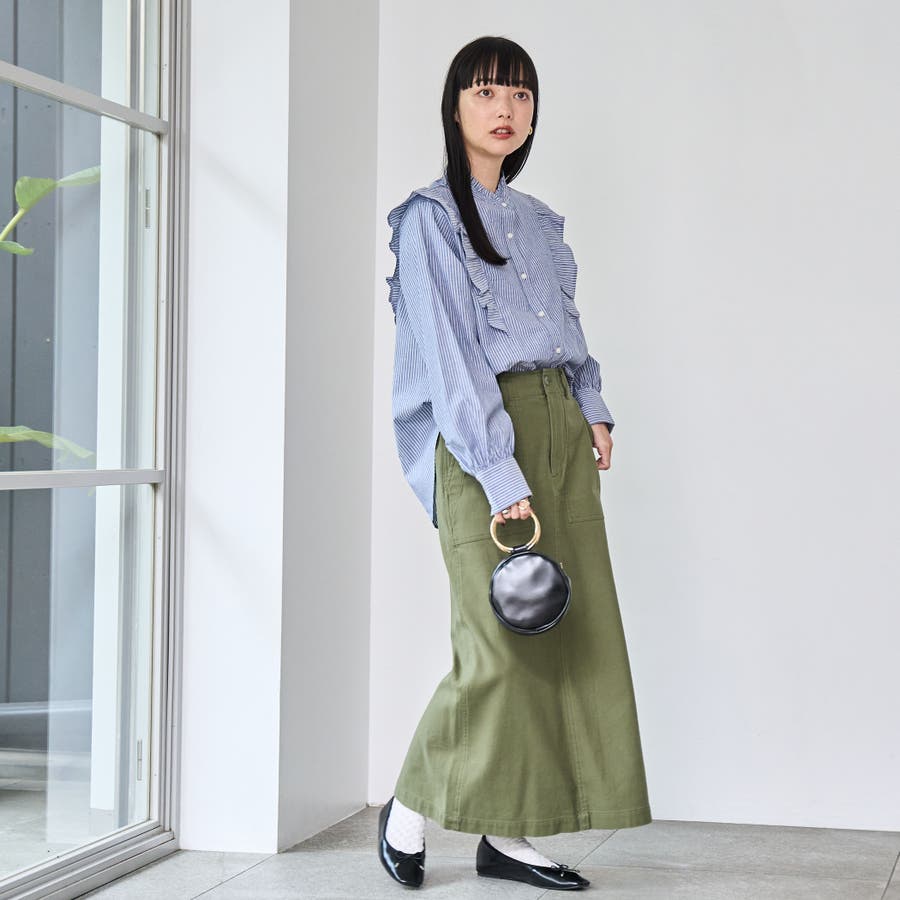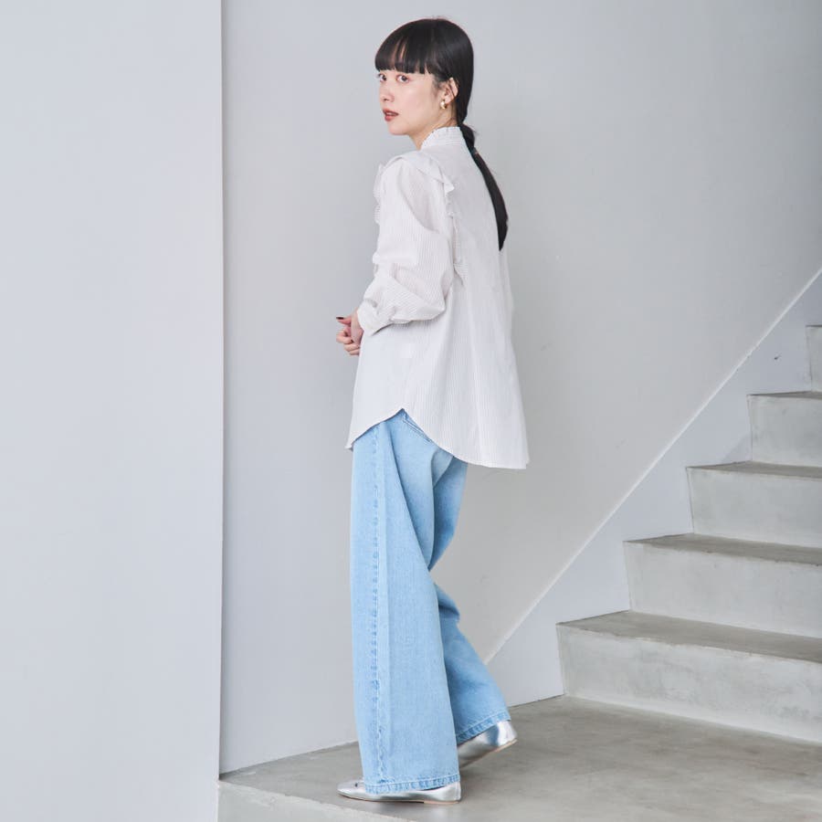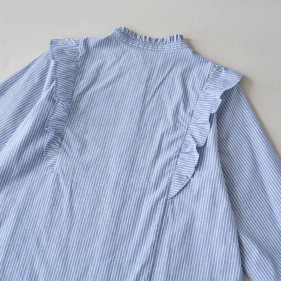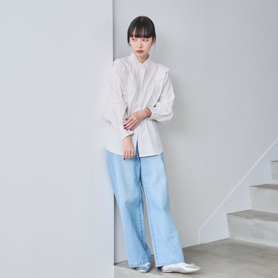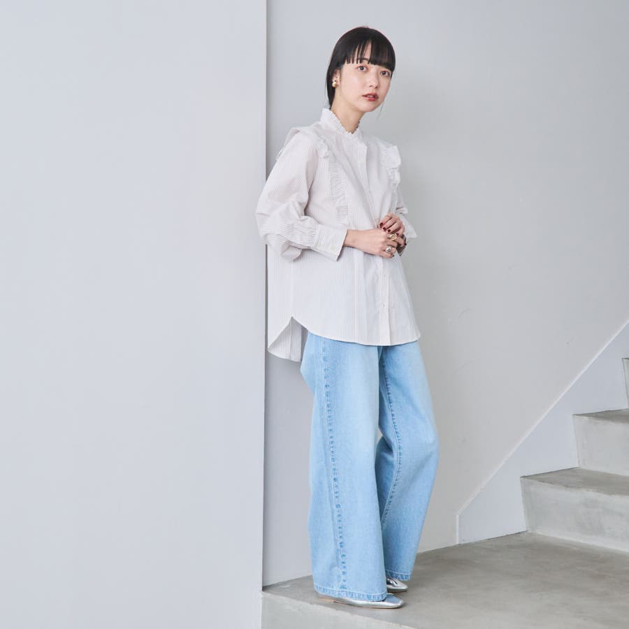 フリル仕様のバンドカラーがポイントのシャツブラウス。