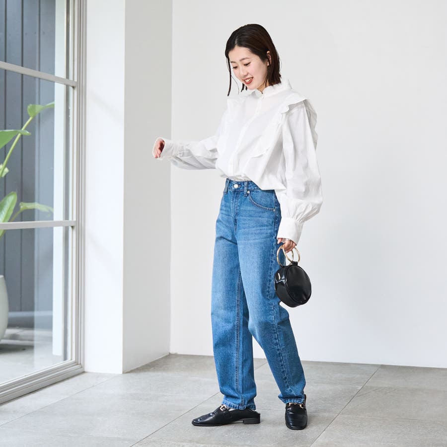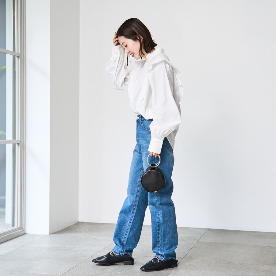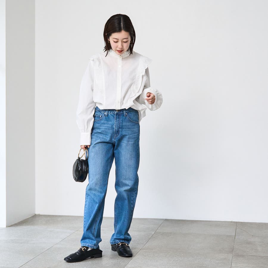 ニットやスウェットなどとのレイヤードもちらっとネックから見えるフリルが新鮮に映ります。