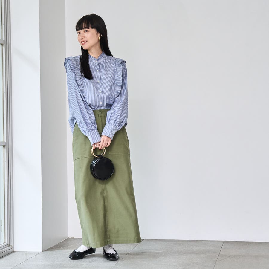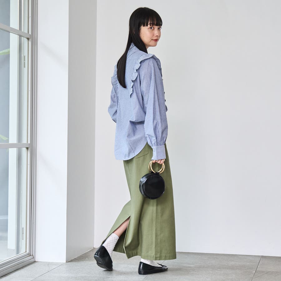 上からニットやカットソーを合わせても、襟フリルが見えるフェミニンなレイヤードコーデもお楽しみ頂けます。