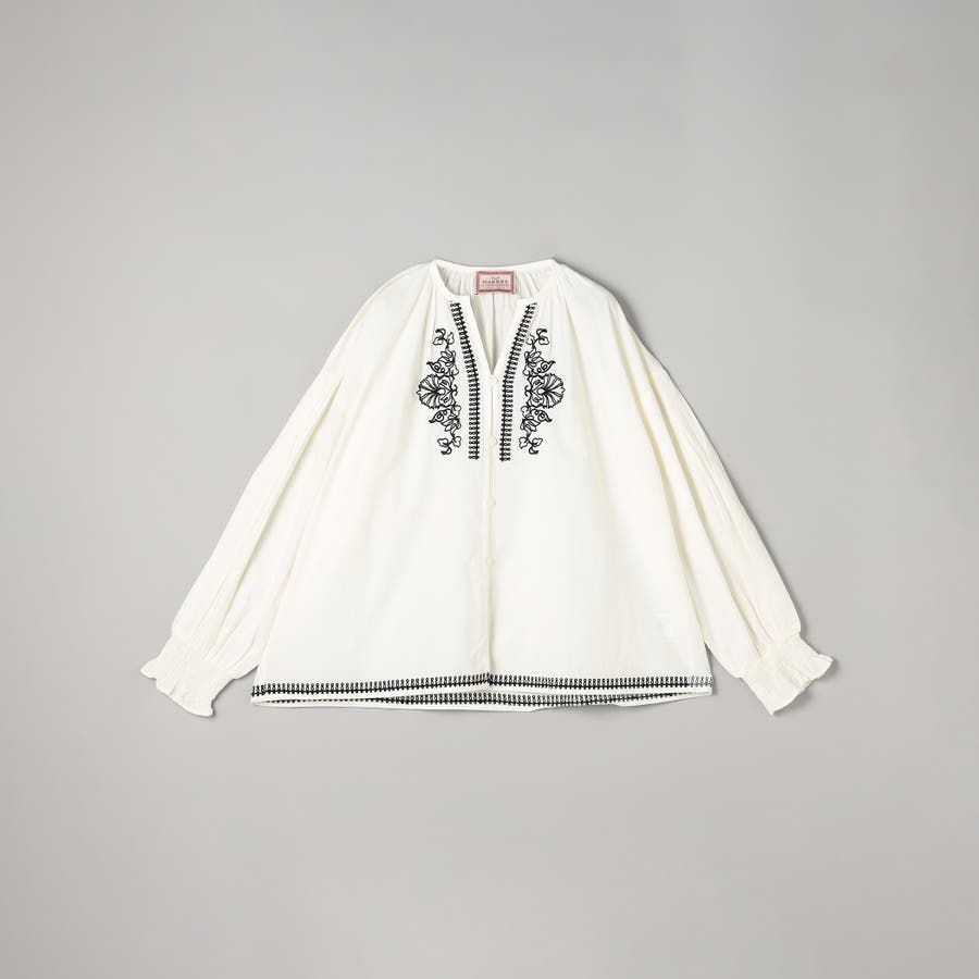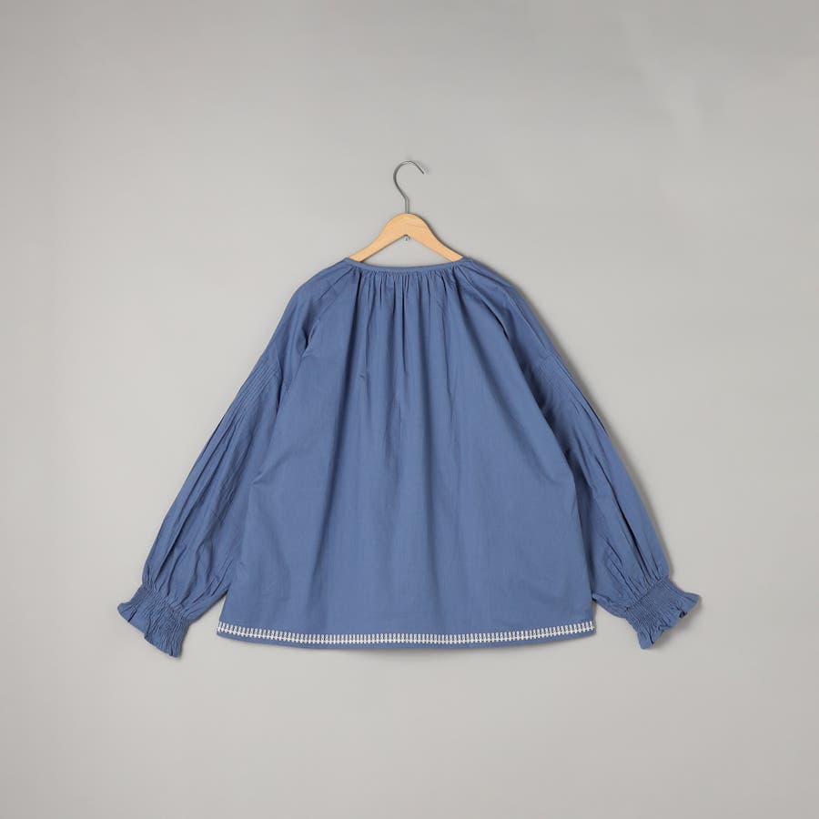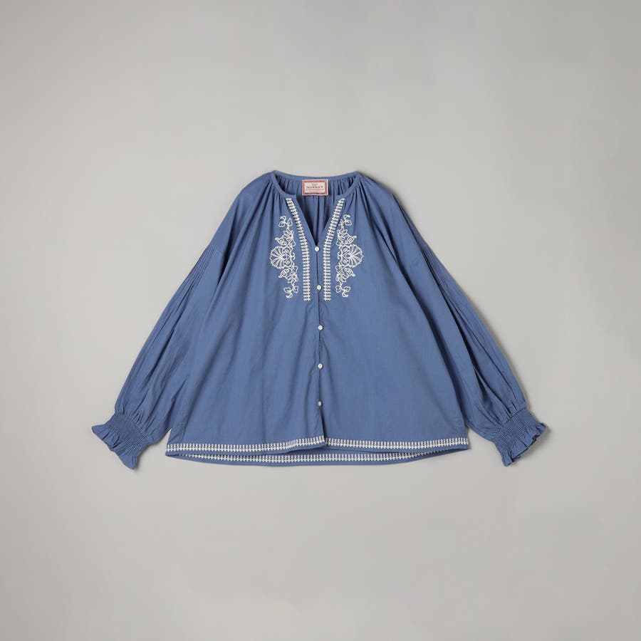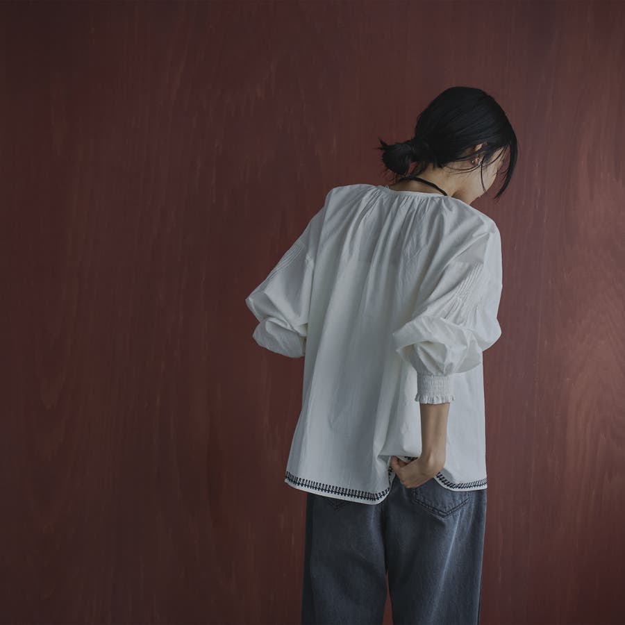 肌触りのよい綿100%の布帛を使用し、繊細な配色刺繍を施したエスニック調のブラウス。