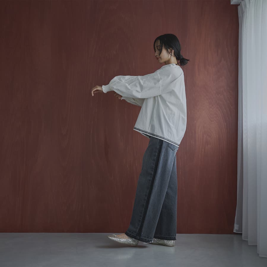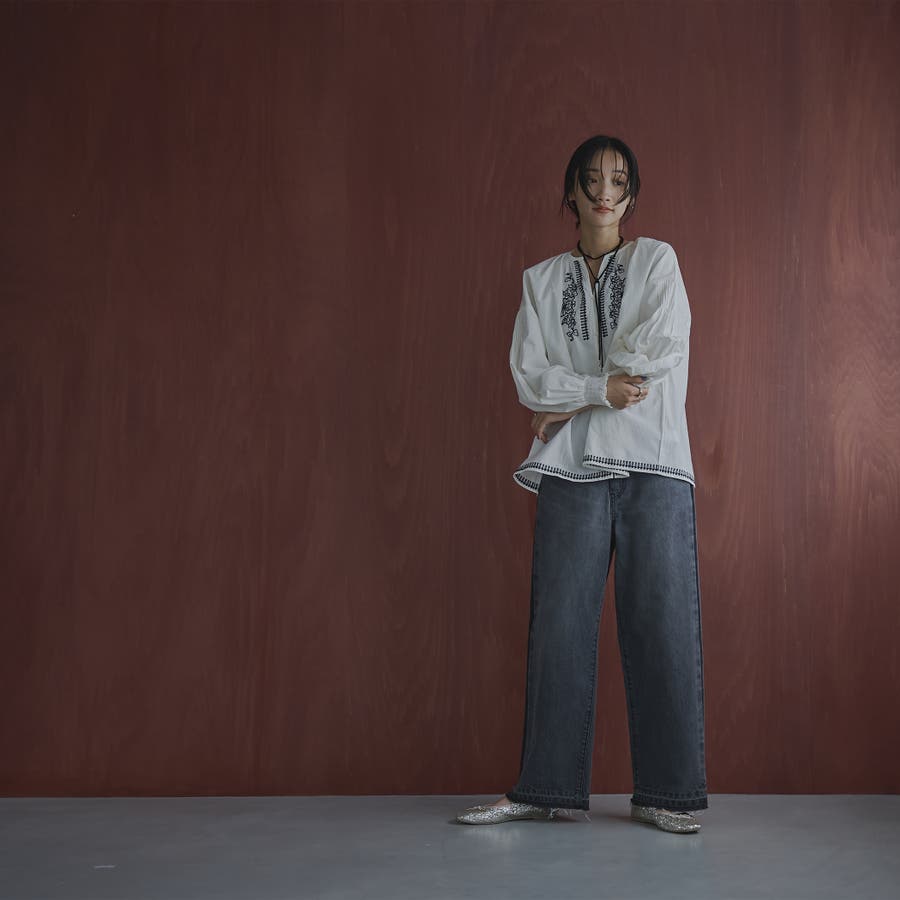 1枚で着映えするエスニック調の刺繍が印象的なスキッパーブラウス