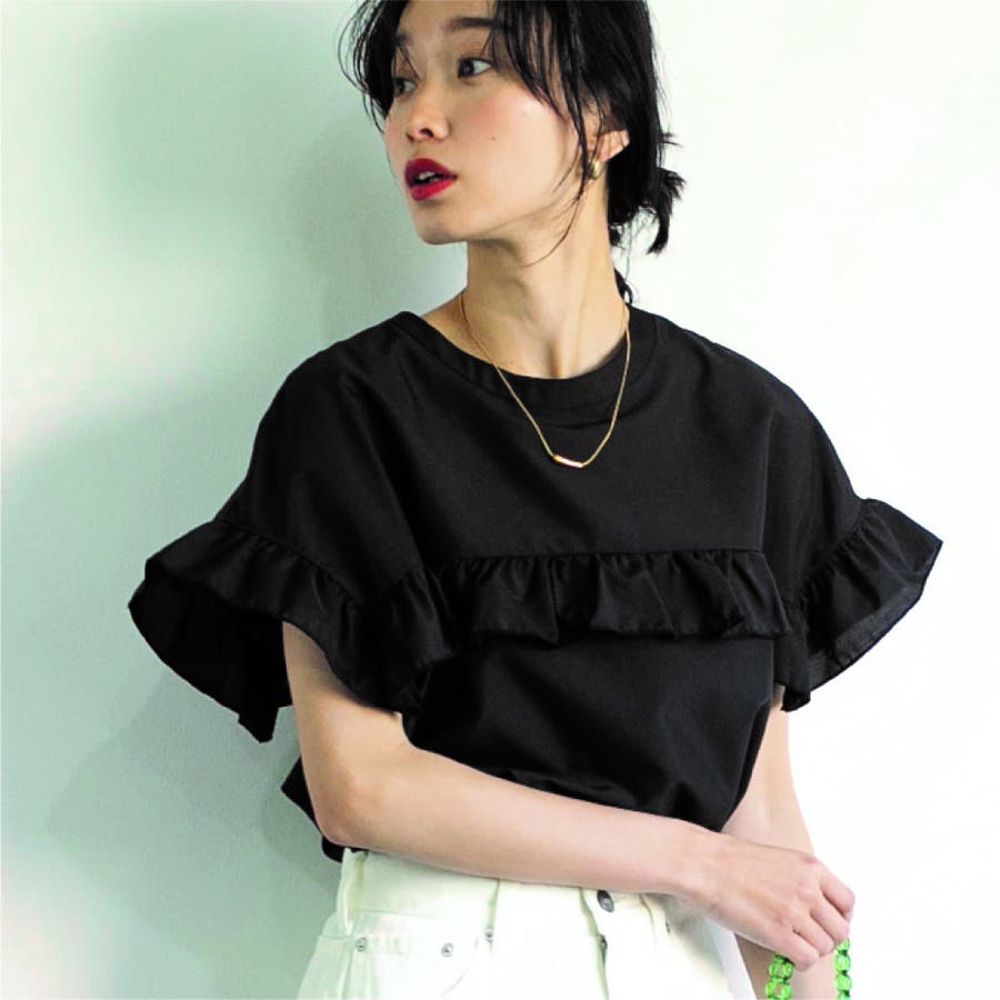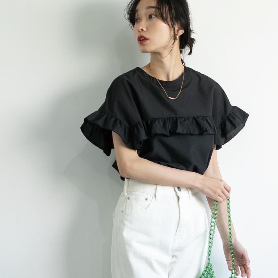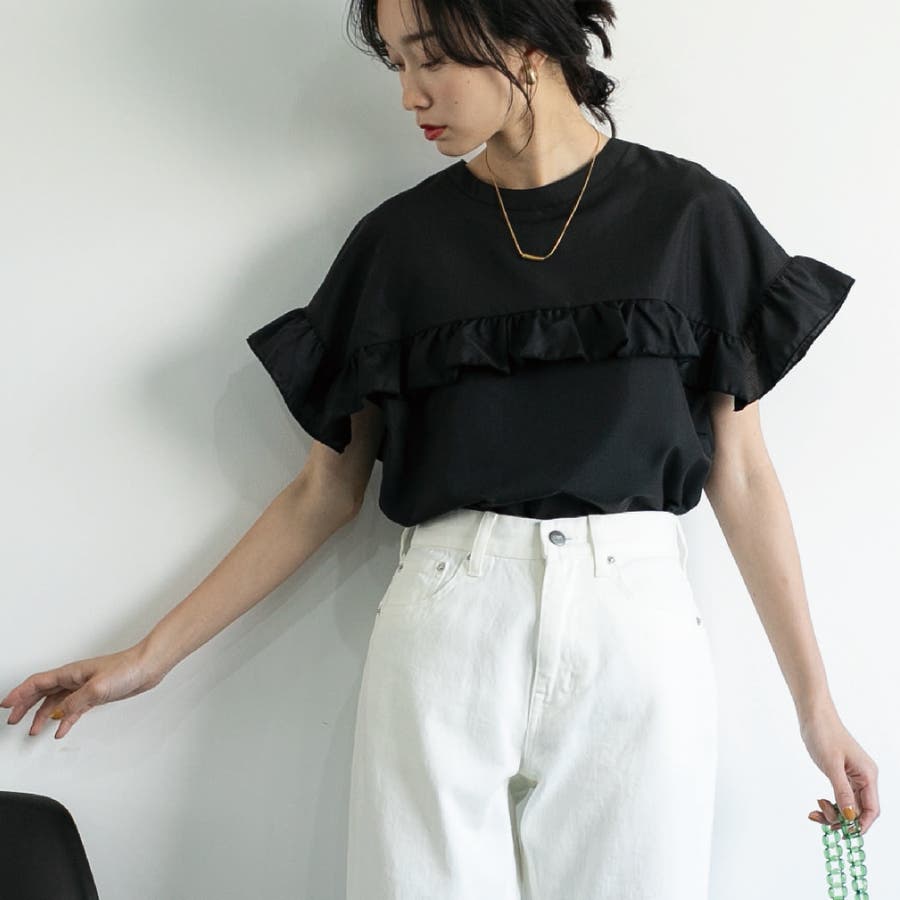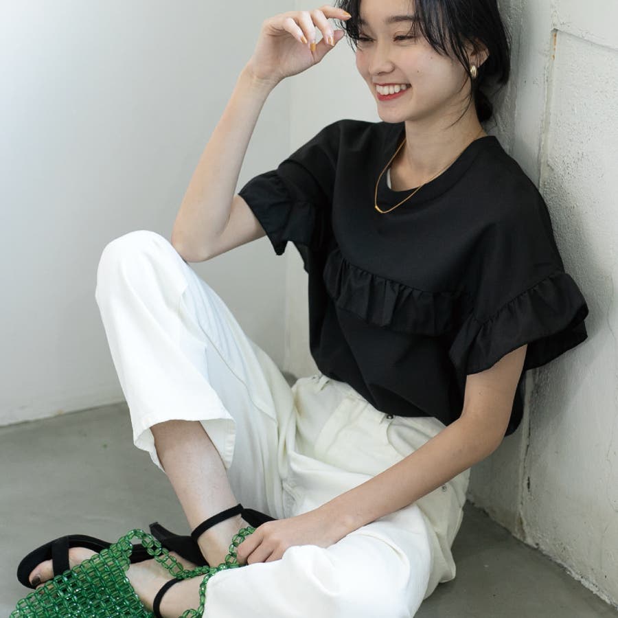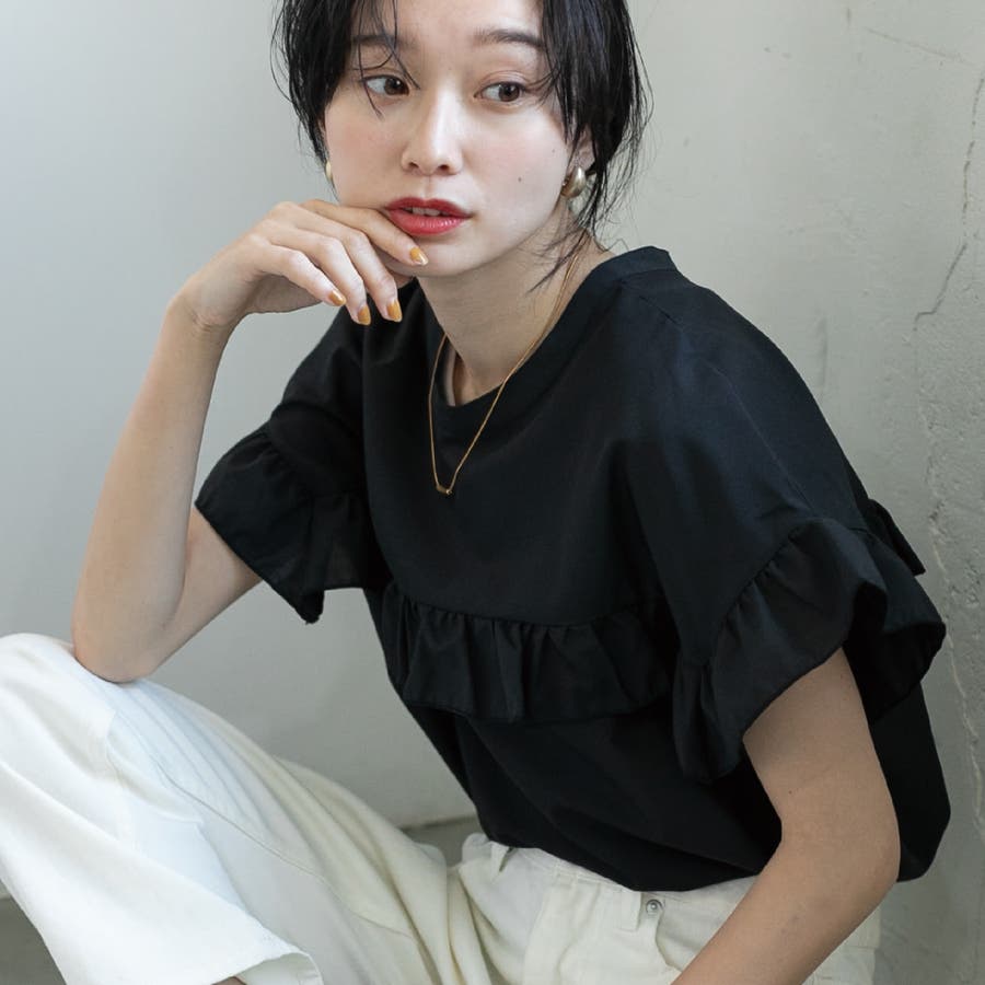胸元・袖にフリルをあしらったデザインは気になる二の腕もカバーしながらトレンド感もプラスしてくれます。
