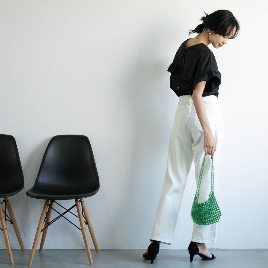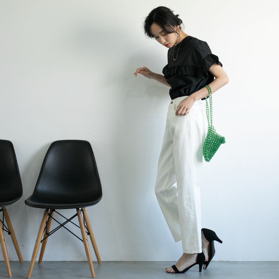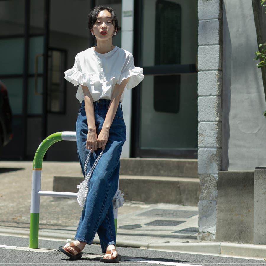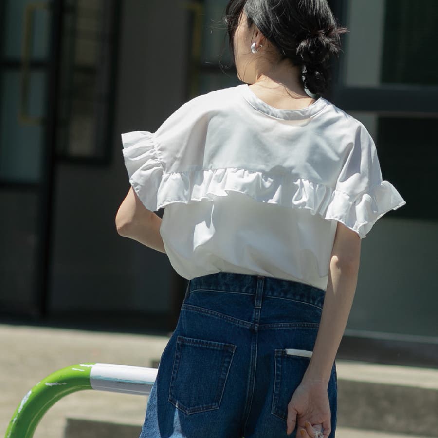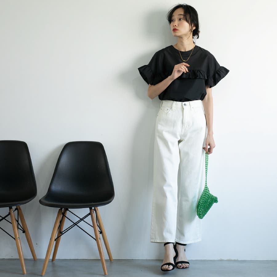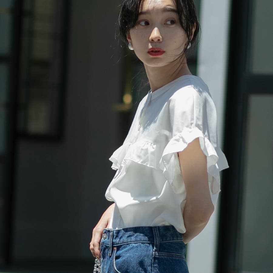 胸元・袖にフリルをあしらったデザインは気になる二の腕もカバーしながらトレンド感もプラスしてくれます。